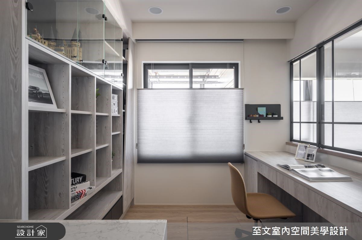 即使坪數只有11坪,玄關櫃、客廳、廚房、書房等各個機能空間一樣不少,客廳使用北歐品牌Muuto的灰色Around Table和MENU的黑色Turning Table,搭配黃椰子植栽、咖啡機和臥榻的充沛光線;午後輕啜一口熱咖啡坐在窗邊,美好的生活步調就此展開。至於鐵件玻璃書房空間,除了將女屋主收藏品一覽無遺之外,親朋好友如來造訪,也可以隨之轉變成客房;清玻折門和拉門設計一方面節省空間,二方面也能引光入室,讓廚房空間也有滿盈的自然採光。