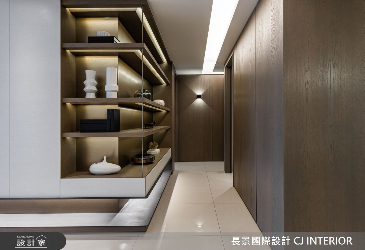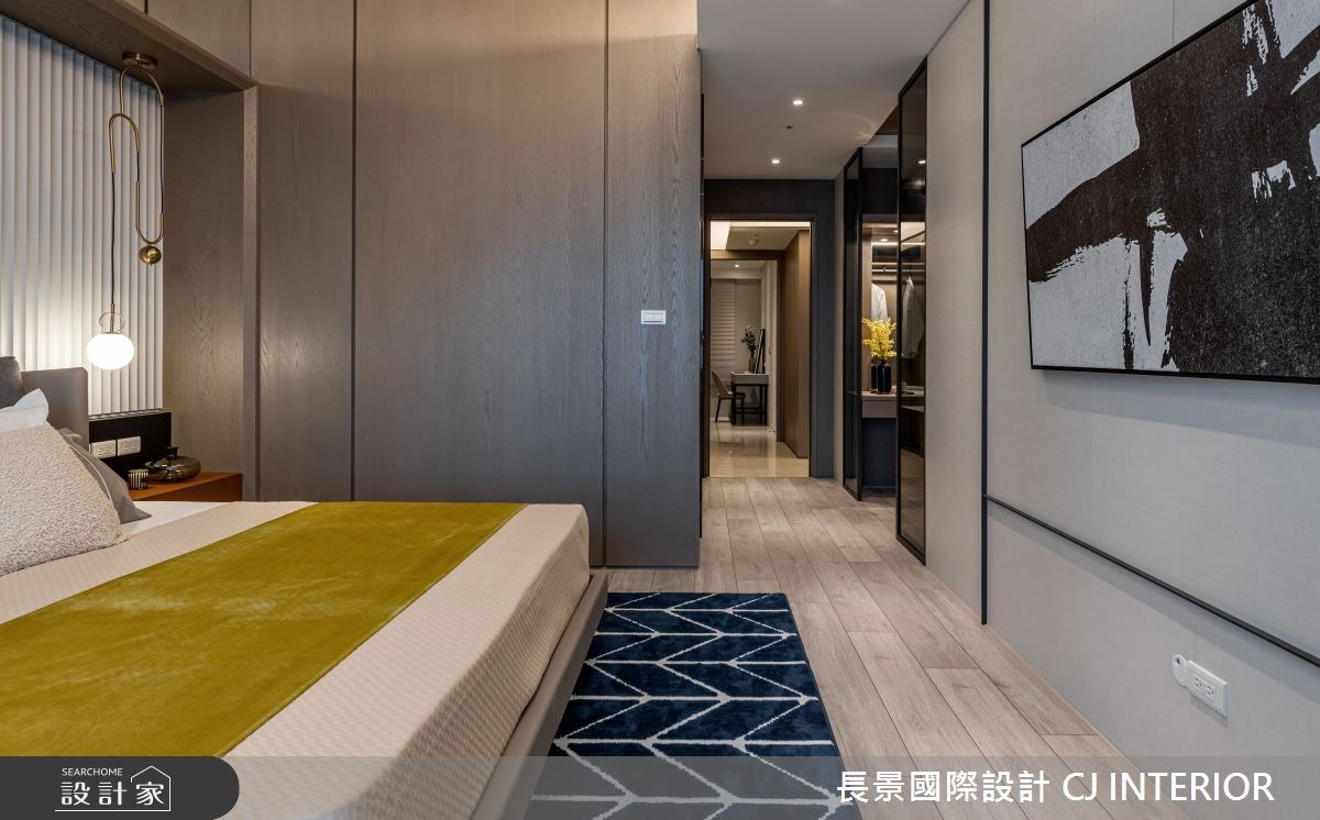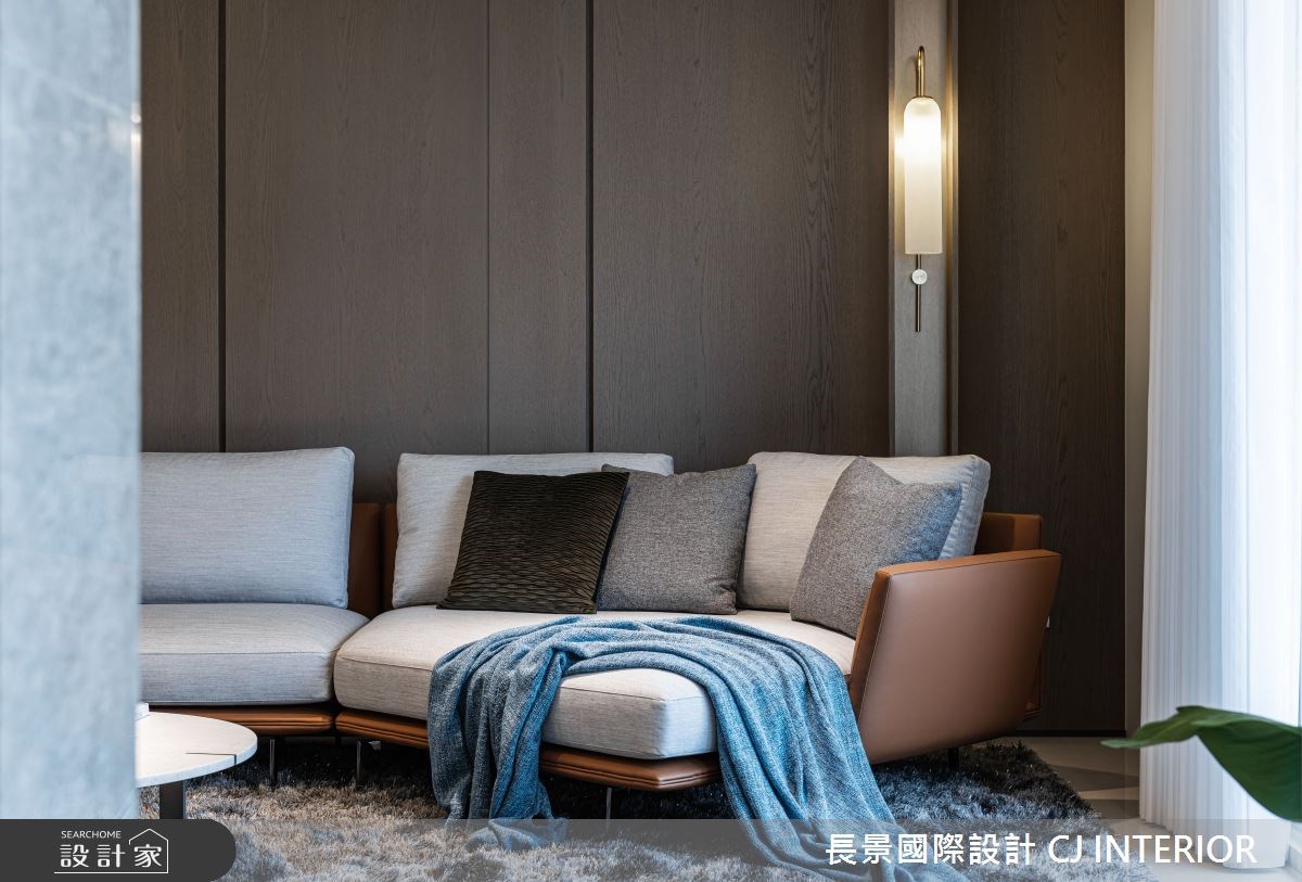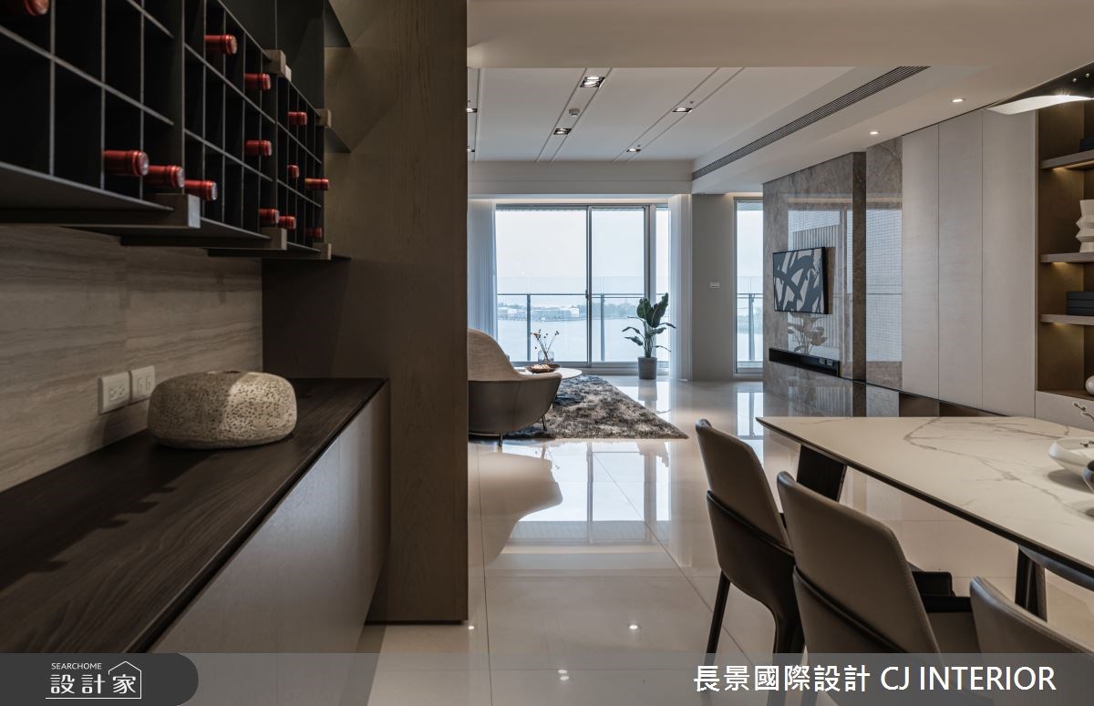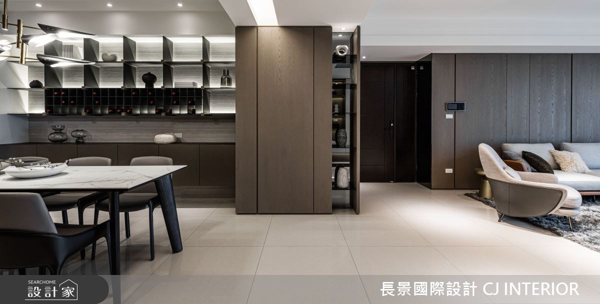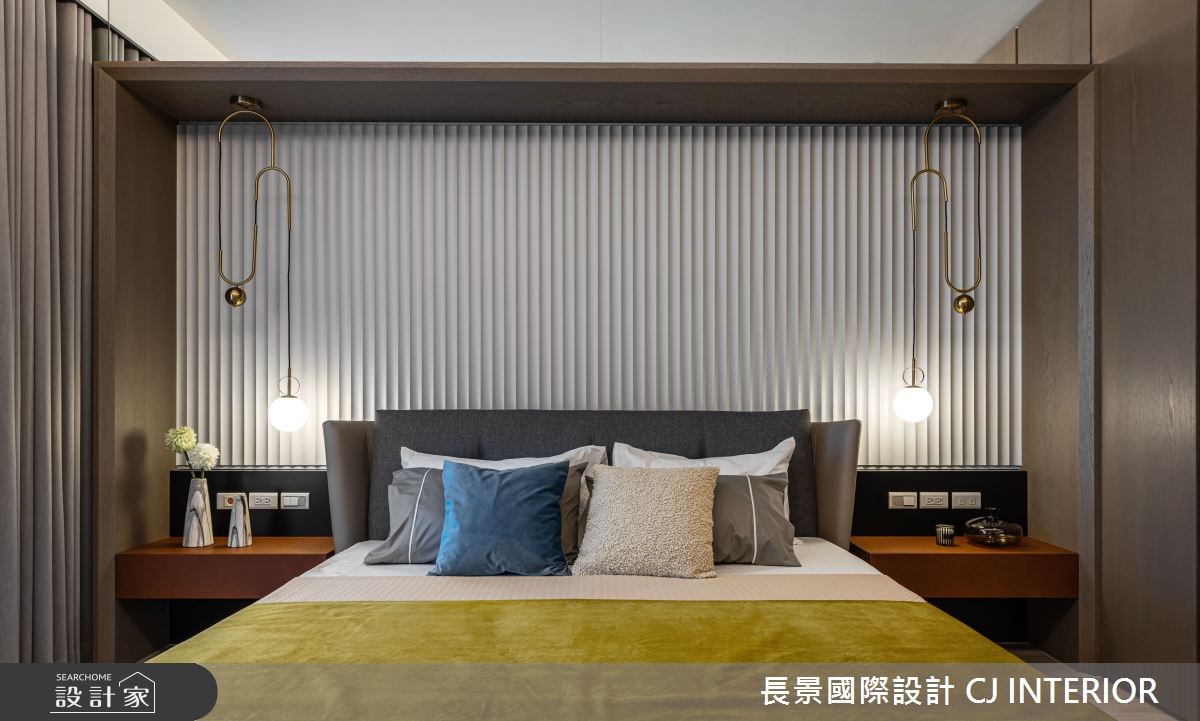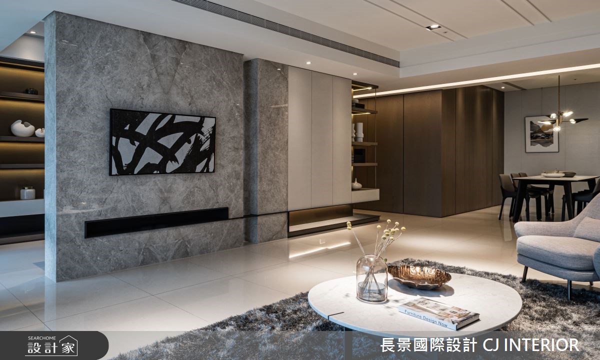 開放式設計的公共領域,搭配米色長型沙發打開空間尺度,詮釋通透寬敞的豪宅空間感,更奠定恢宏大度的氣勢,背牆鋪陳深色木質,注入一絲沈穩內斂的能量,並打造不做滿的淺色大理石電視牆,透過精緻質材表現輕奢神采,後側巧留餘韻作為展示空間,刻畫空間的立體感。餐廳區域,在格狀展示架之間鋪排光源,提升整體亮度,勾勒生動的光影效果。走入臥室,白色木格柵鋪排細膩的層次感,在灰階色系的陪襯下,以跳色寢具點亮整室,創造生動活潑的居家場景。