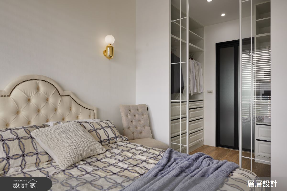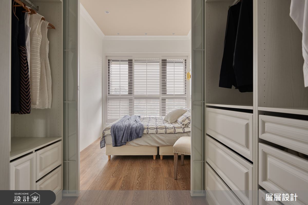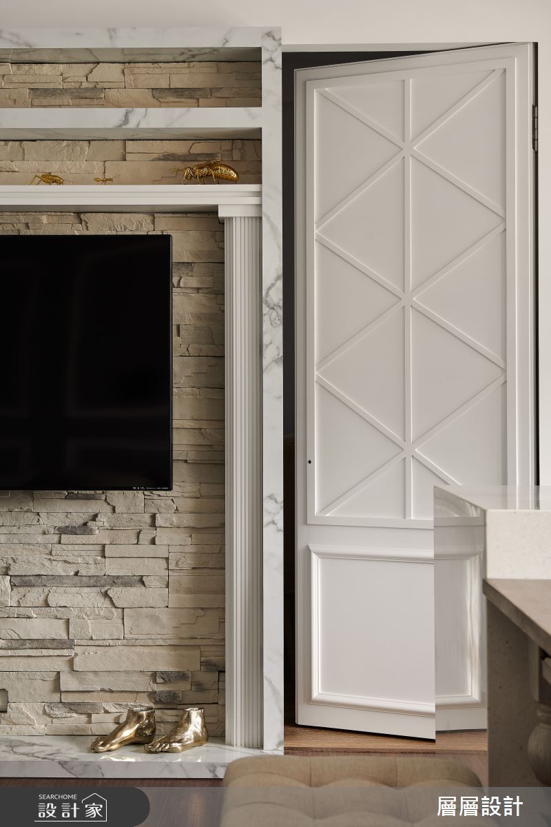公領域藉由造型家具作場域分隔,同時整合收納機能與隔間牆,並善用畸零區塊,創造空間視野的俐落感;玄關入口的右側,規劃了一排完整的百葉高櫃,運用斜角動線達成引導,形塑牆面線條的延續;客廳的沙發背牆,則將美式線條與門片造型做結合,形成視覺一致性,窗面運用造型線板作修飾,柔化鋁窗的剛硬,在線條的重新分割下,表現美式風的優雅姿態;同時考量到主臥原先的入口侷限了空間感,更讓臥房空間顯得零碎,因此透過入口的位置改變,讓公共空間與私領域的動線配置更為恰當!