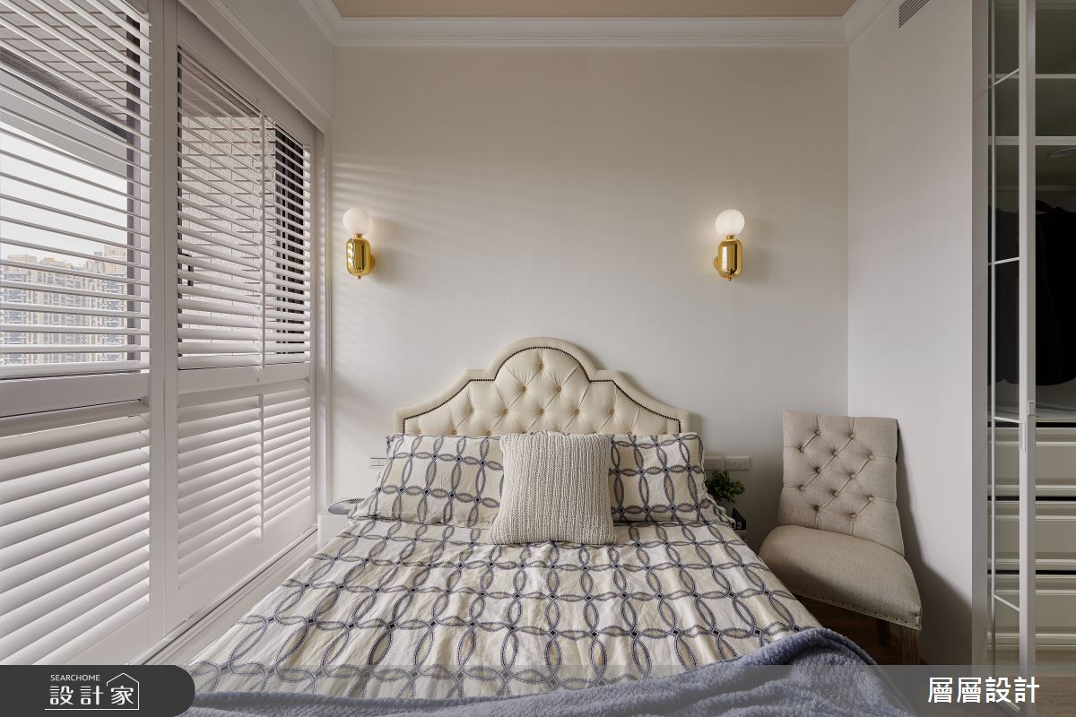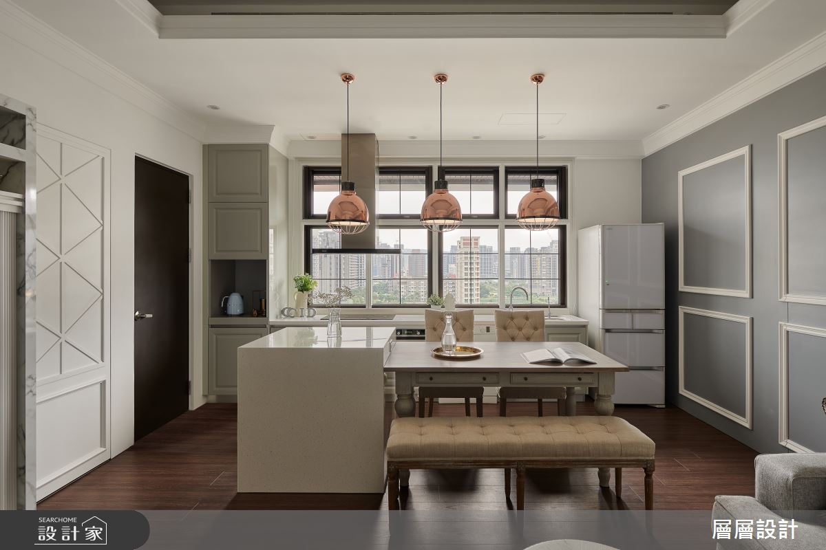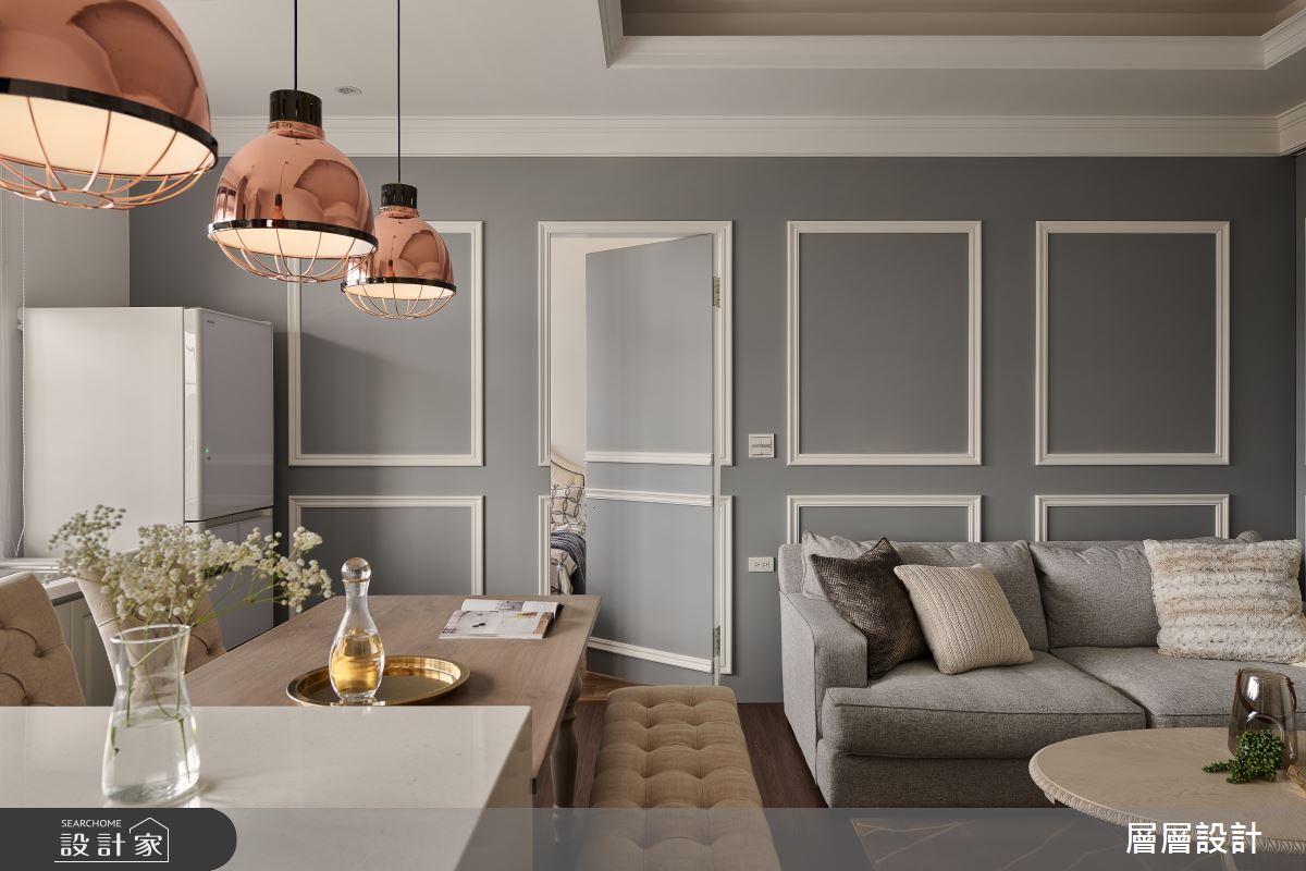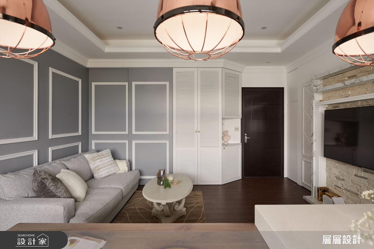公領域藉由造型家具作場域分隔,同時整合收納機能與隔間牆,並善用畸零區塊,創造空間視野的俐落感;玄關入口的右側,規劃了一排完整的百葉高櫃,運用斜角動線達成引導,形塑牆面線條的延續;客廳的沙發背牆,則將美式線條與門片造型做結合,形成視覺一致性,窗面運用造型線板作修飾,柔化鋁窗的剛硬,在線條的重新分割下,表現美式風的優雅姿態;同時考量到主臥原先的入口侷限了空間感,更讓臥房空間顯得零碎,因此透過入口的位置改變,讓公共空間與私領域的動線配置更為恰當!