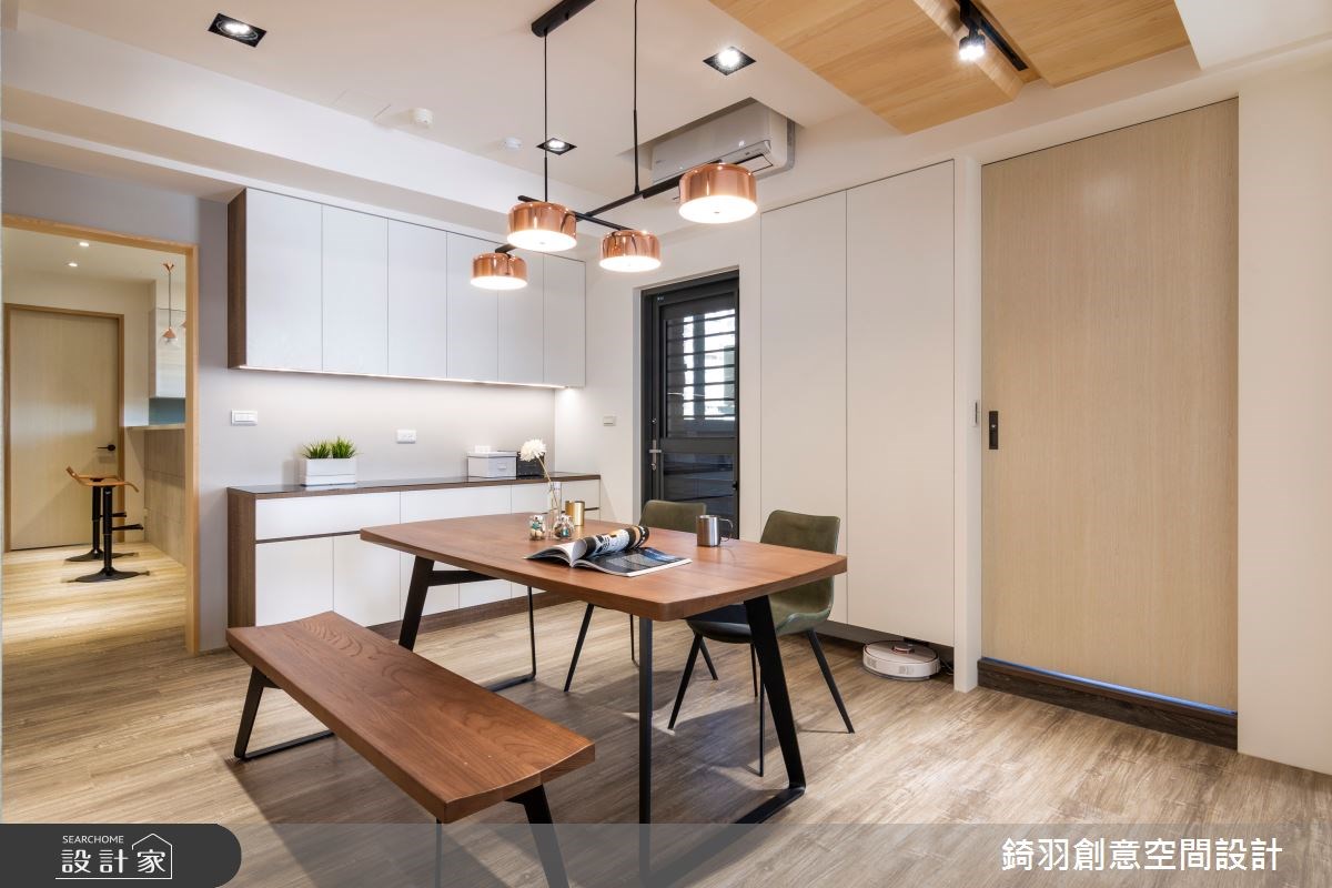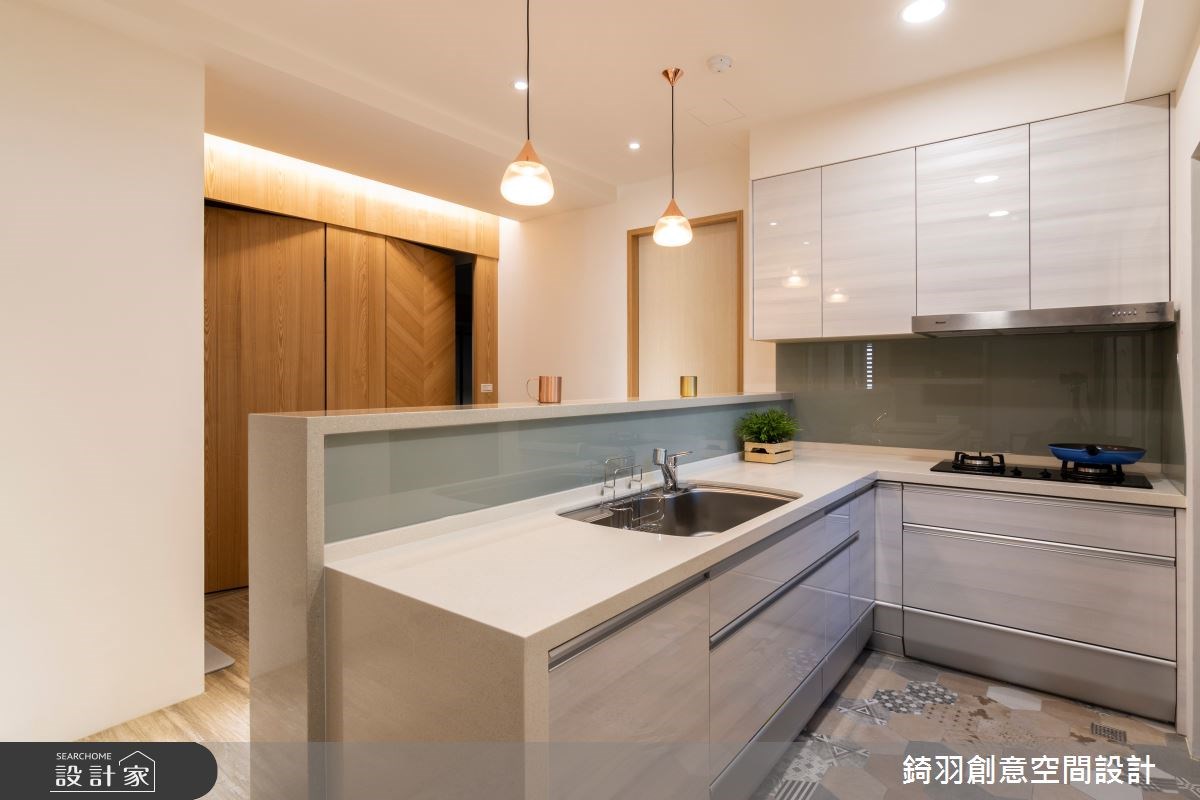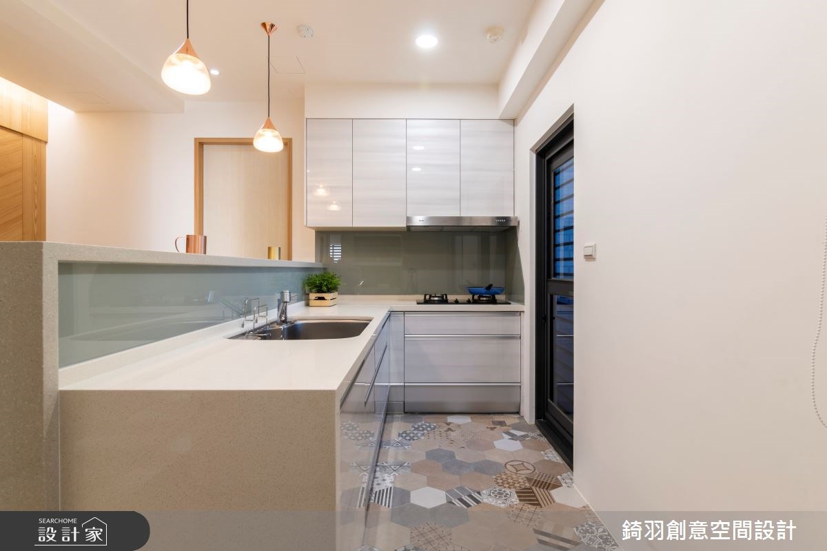 踏上書房的架高地坪,移動式黑板設計為一整面的展示書櫃,增添更多收納空間,又能發揮孩子的創意,甚至成為備忘錄。原先的廚房位置變更為餐廳,並將開放式廚房向內推移,與入口隱身於牆面的主臥、儲藏室相鄰。廚具則選擇樸素優雅的款式,凸顯花磚地坪的活潑紋理,使心情頓時愉悅起來。