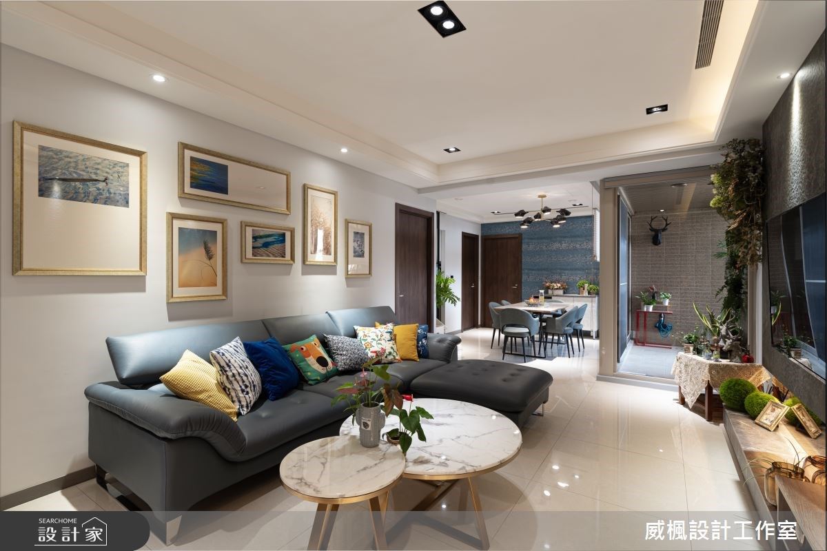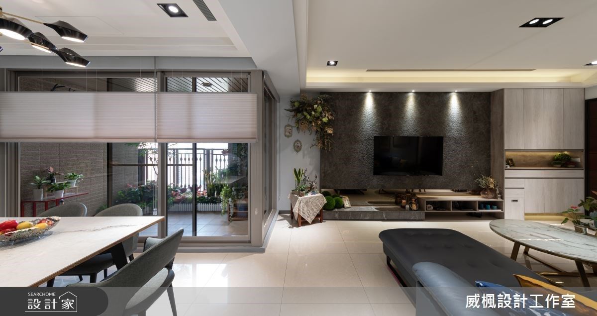進門第一視覺的陽台空地,設計師巧妙規劃成端景平台,運用花草植栽妝點,營造室內、外的綠意氛圍;客廳電視牆以仿石材的義大利磁磚鋪陳,並透過表面肌理,搭配無縫拼貼的手法,讓磁磚也能呈現石材的大器質感。另外,透過加入茶鏡點綴方式,為視覺迎來精緻質感。設計師將餐區視為空間主角,搭配一覽無遺的大面窗景,讓午後時光也能有美景相伴;牆面則挑選藍調色彩的特殊壁紙,創造出另一面的視覺端景。主臥的衣櫃門片,挑選兩片大理石紋材質規劃,其餘則以素色襯托石紋質感,堆疊視覺層次感;窗邊規劃陽光臥榻,並設計可以移動式的小桌板,滿足屋主的生活情調與需求。