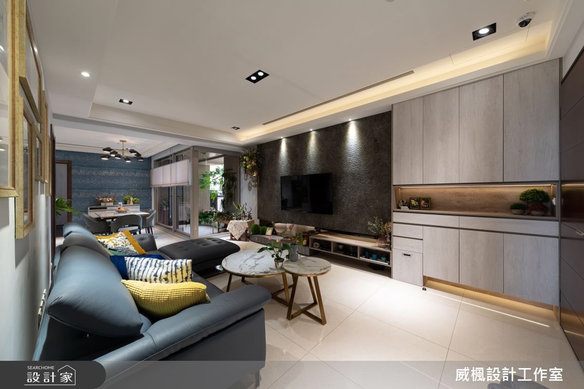 客廳電視牆以無縫拼貼,讓仿石材磁磚也能呈現石材的大器氛圍。