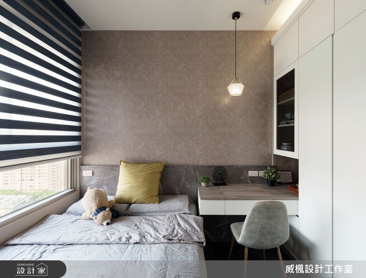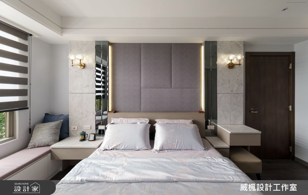 主臥櫃體藉由石紋肌理搭配素色系統櫃,巧妙帶出視覺層次感。