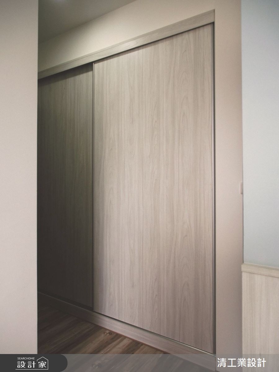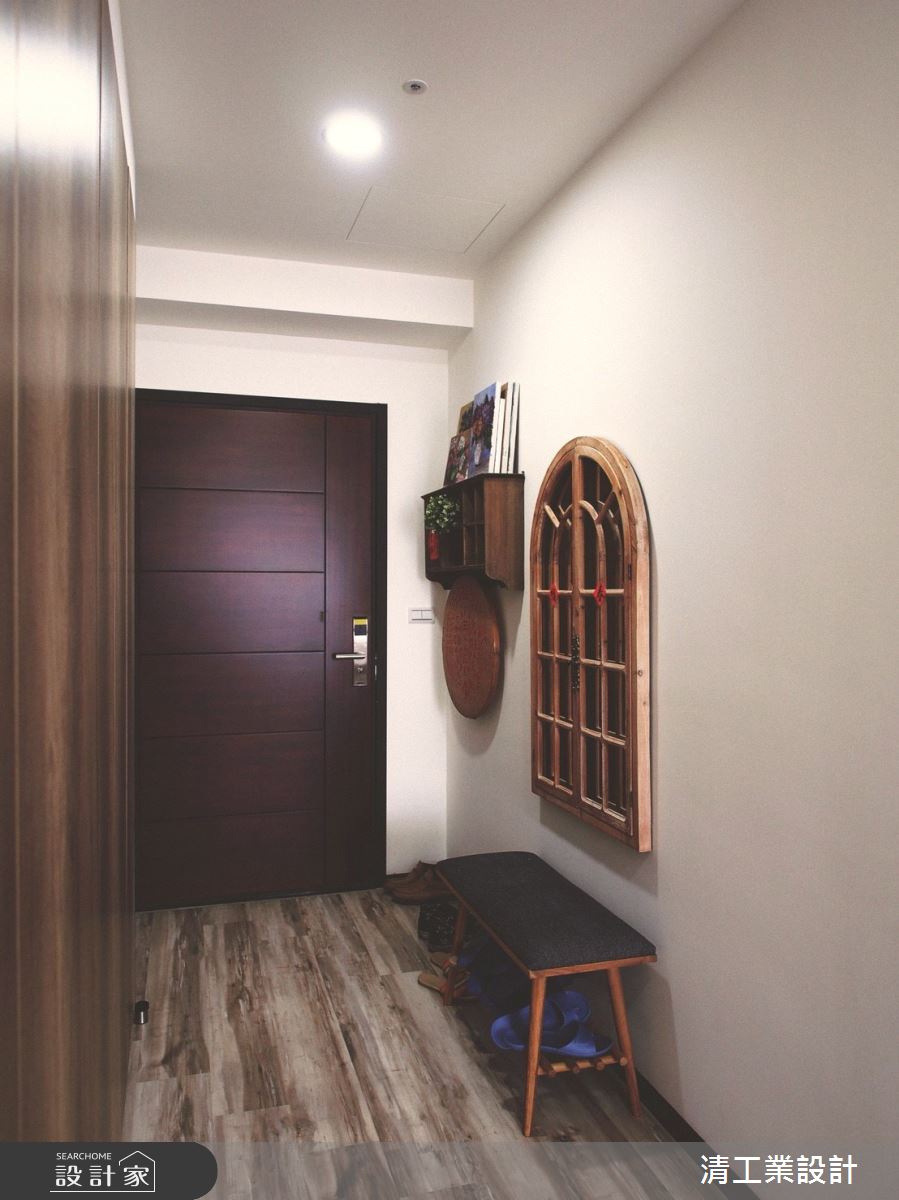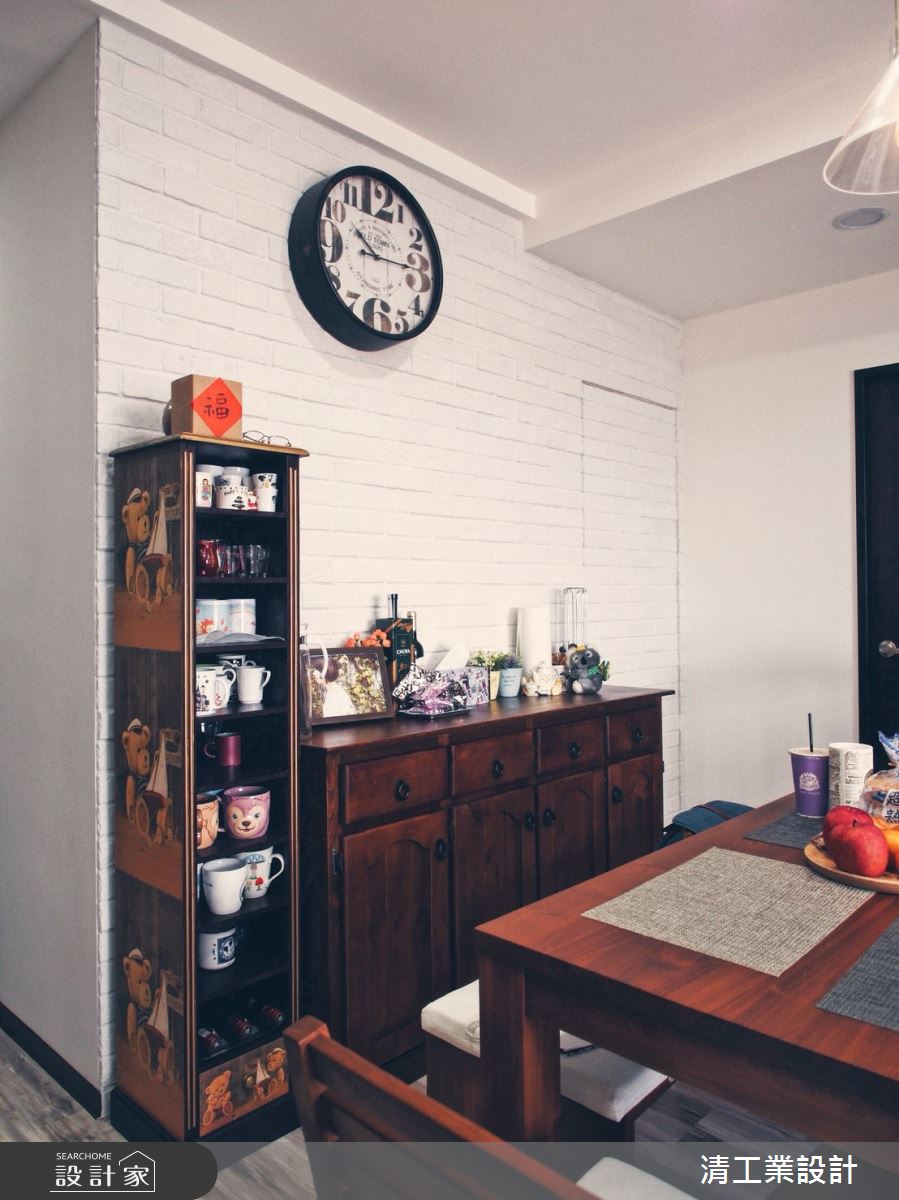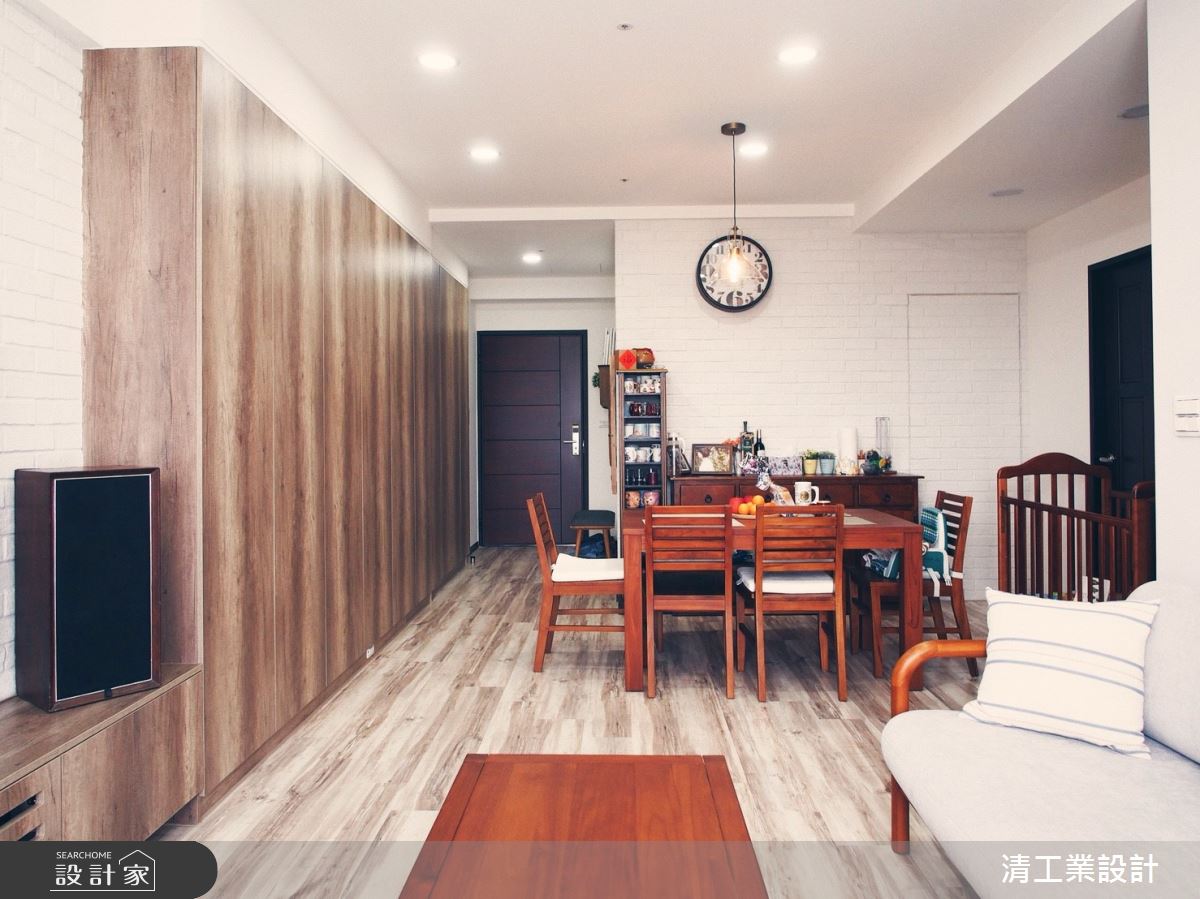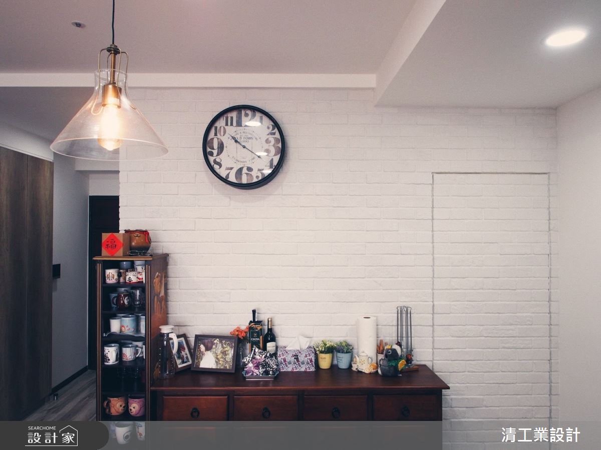 於玄關入口築起端景,裝飾米篩、假窗、春聯等復古物件,整合出安定、懷舊、靜謐的入口畫面,步入空間內,則可見餐廳的的木櫃陳列,讓風格小物的展示熠熠生輝,營造帶有生活感的美好畫面,後方的文化石背景,則帶出另一種樸質的立面風景;同時另外使用珪藻漆刷塗於大部分的牆面,達到除濕及淨化空氣的效用,給家中新生兒一個更舒適的環境;並考量到家中收納物及書籍較多,在不影響整體空間的範圍內,盡可能配置大型櫃體,像是以木紋櫃串聯玄關與電視主牆,形塑溫暖無壓的視感,並兼顧大容量的儲物機能!