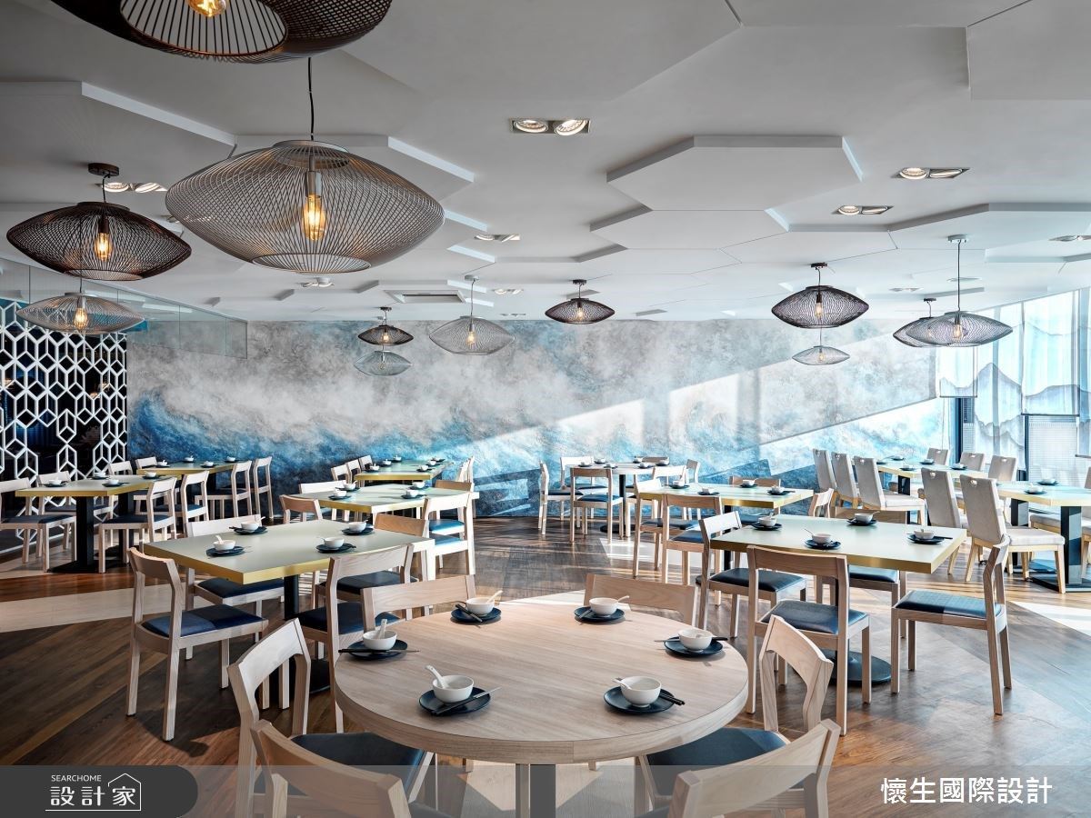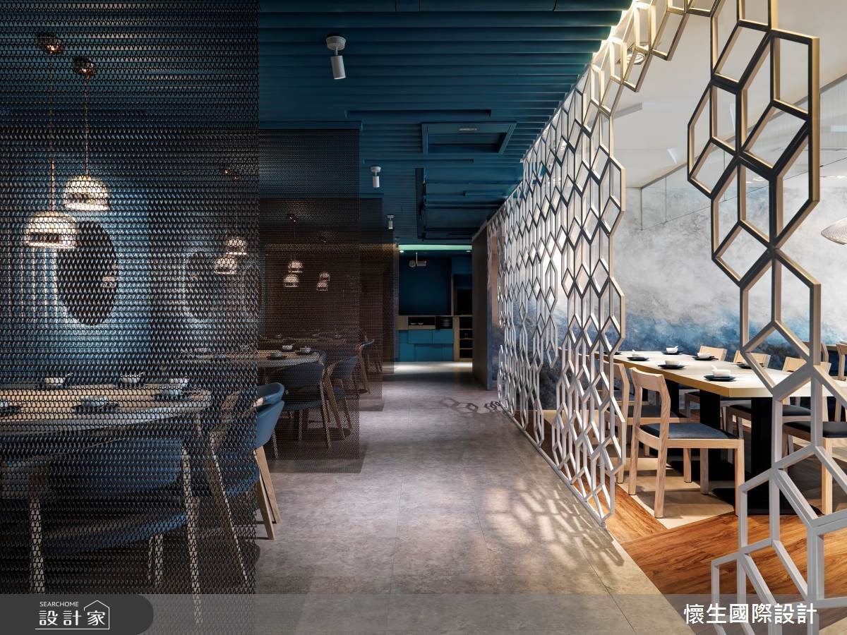 位於桃園藝文特區,中茂新天地的享鴨以藍色作為空間主調,圓形拱門入口處由壁面到天花,鮮豔的寶藍色吸引過路人的目光,柱狀排列更是增加立體層次,讓人十分驚豔。座位區分成幾個不同區塊,以不同設計呈現:首先延伸入口寶藍天花壁面的座位以垂簾作為界定,穿透與隱私兼具,並於其中裝置圓形雕花窗點出東方風情;大廳區白色幾何天花、有如海浪暈染深淺藍色牆面及高低錯落有致的山水掛簾,在現代風格中藏有古典氣息,並以方桌、圓桌滿足最大量的來客數。包廂區則以鑲金屬框拉門片區隔,串聯整體設計也展現些許奢華。