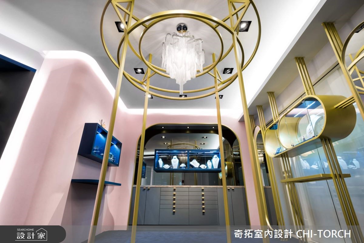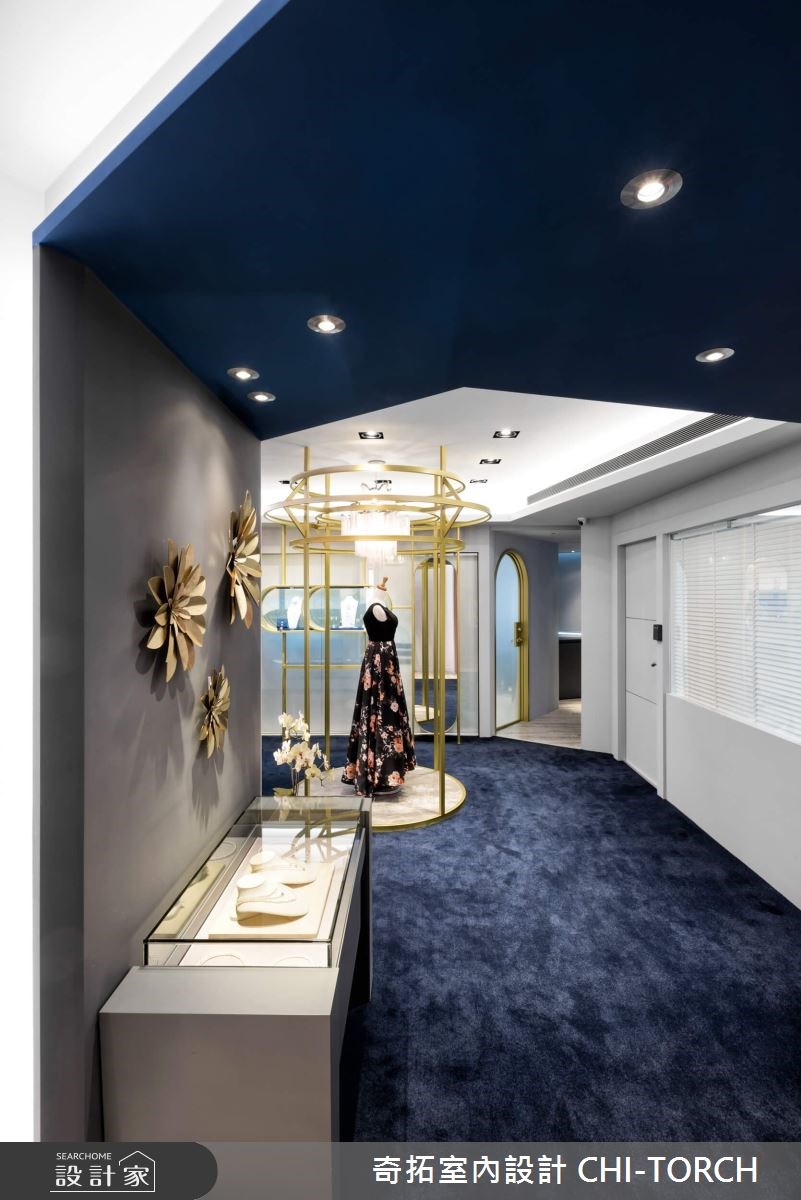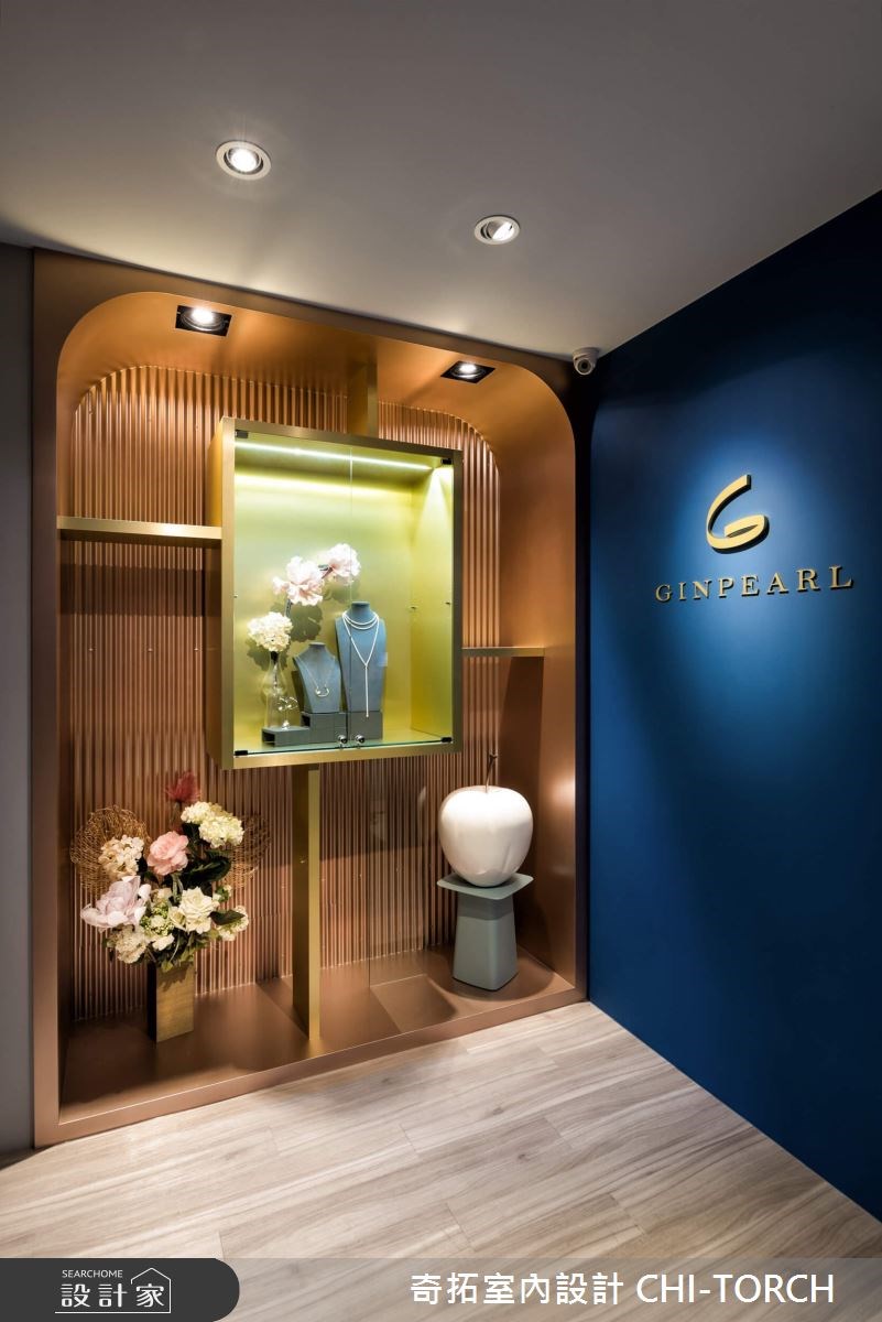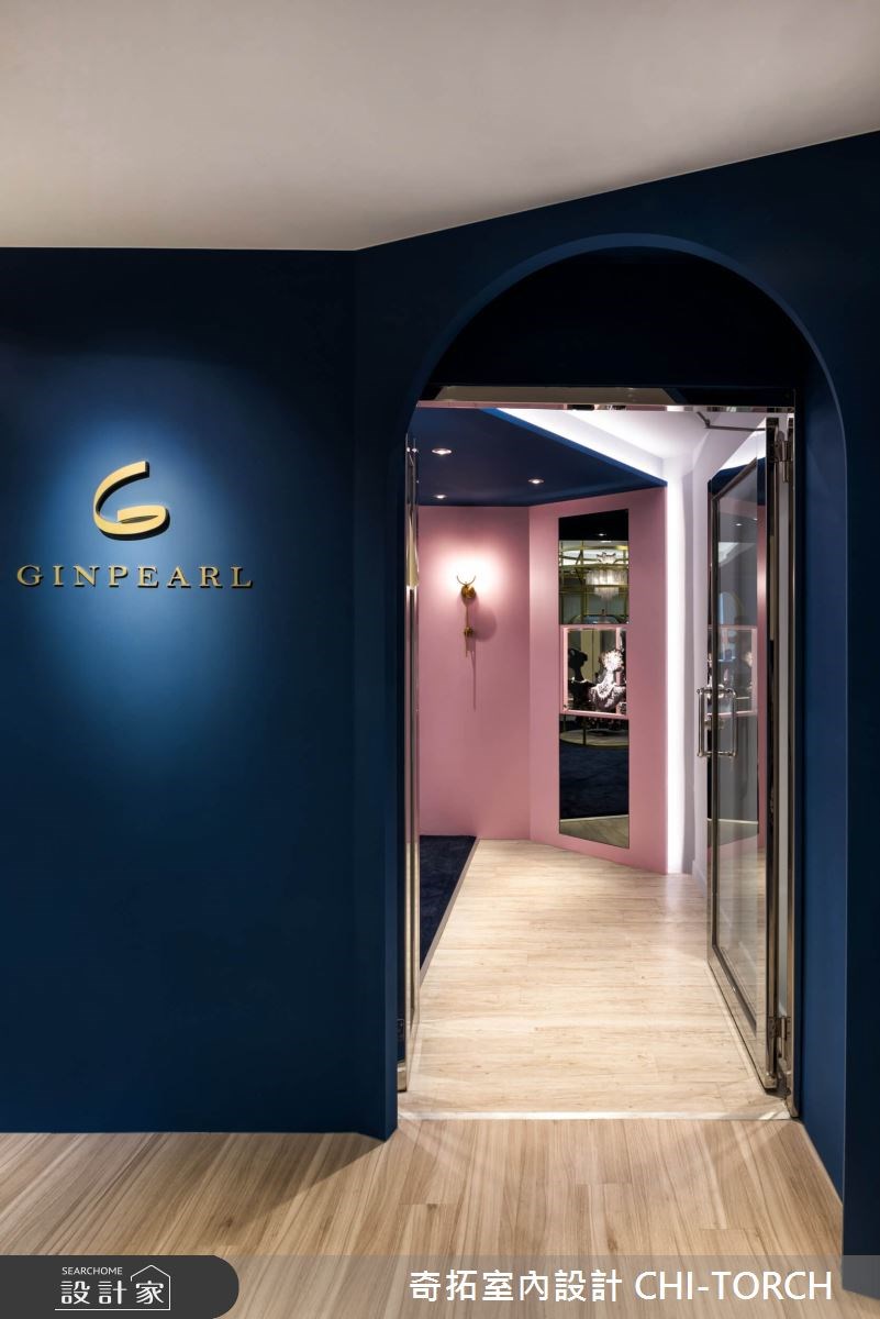 玄關區域,以湛藍色系牆面搭配金色LOGO,呈現沉靜又富有質感的場景,刻意鋪排不等大的三色拱門,由方正逐步化為圓弧,象徵現代女性在理性外表下,仍保有柔美圓融的赤子之心。空間靈感來自文藝復興名畫《維納斯的誕生》,鋪陳大量的湛藍色系為底,適時加入富有成熟感的粉色調和,正中央透過圓弧的金屬流線層層堆疊,塑造伸展台般的舞台感,當顧客穿戴珠寶身處其中,便如同自大海誕生的女神般尊榮高雅,也詮釋出孕育珍珠的視覺意象。