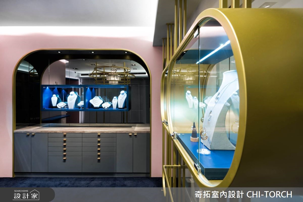 珠寶展示牆面混搭鏡面、玻璃質材和金屬線條,在簡潔俐落的手法中,使空間保有一絲通透感受,並使光線巧妙穿梭其中,締造輕盈生動的節奏。