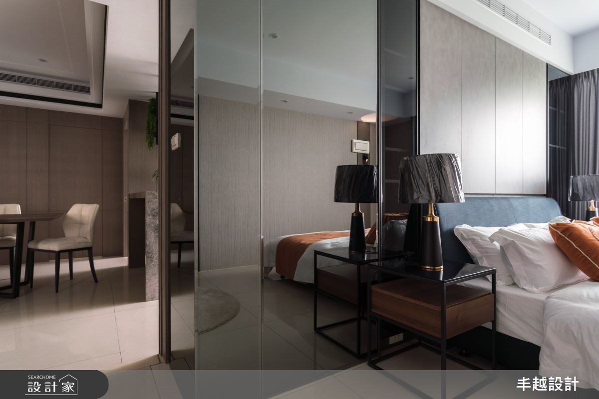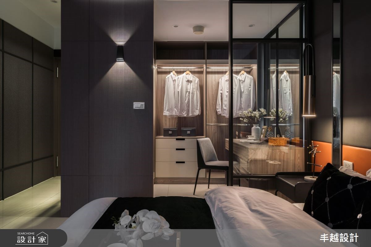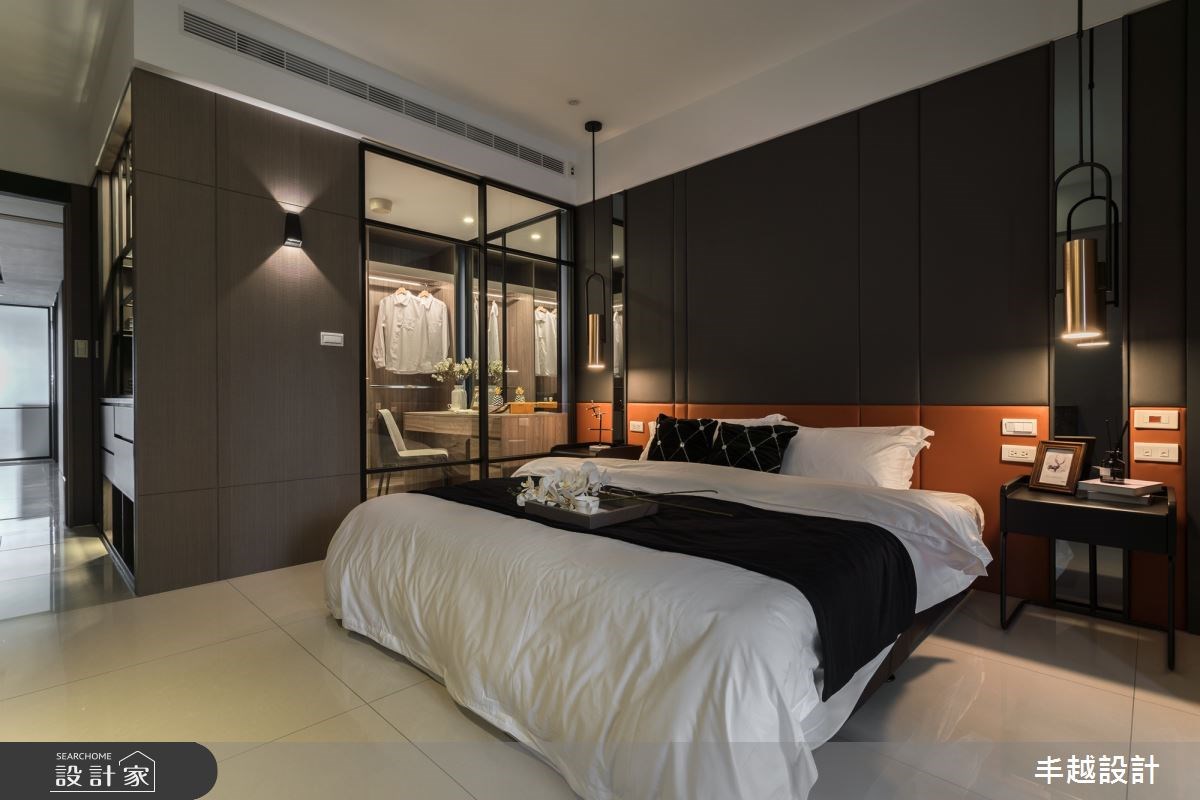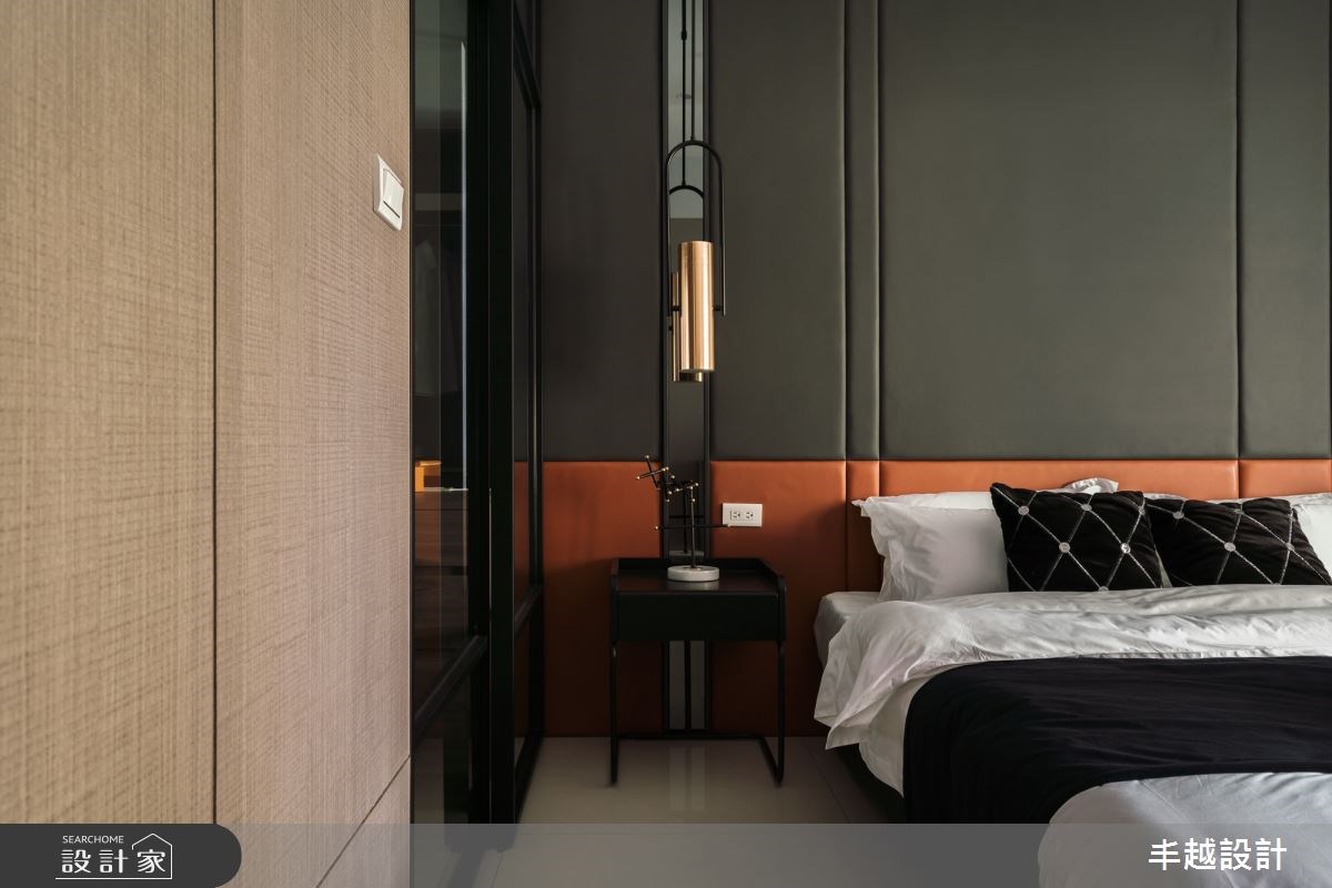 主臥床頭牆面使用軍綠與橘色呈現高級訂製質感,更衣空間的玻璃拉門與燈光照射則有如精品櫥窗令人流連忘返。