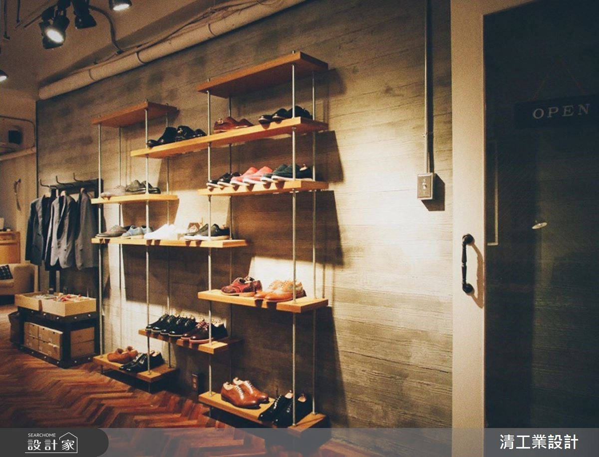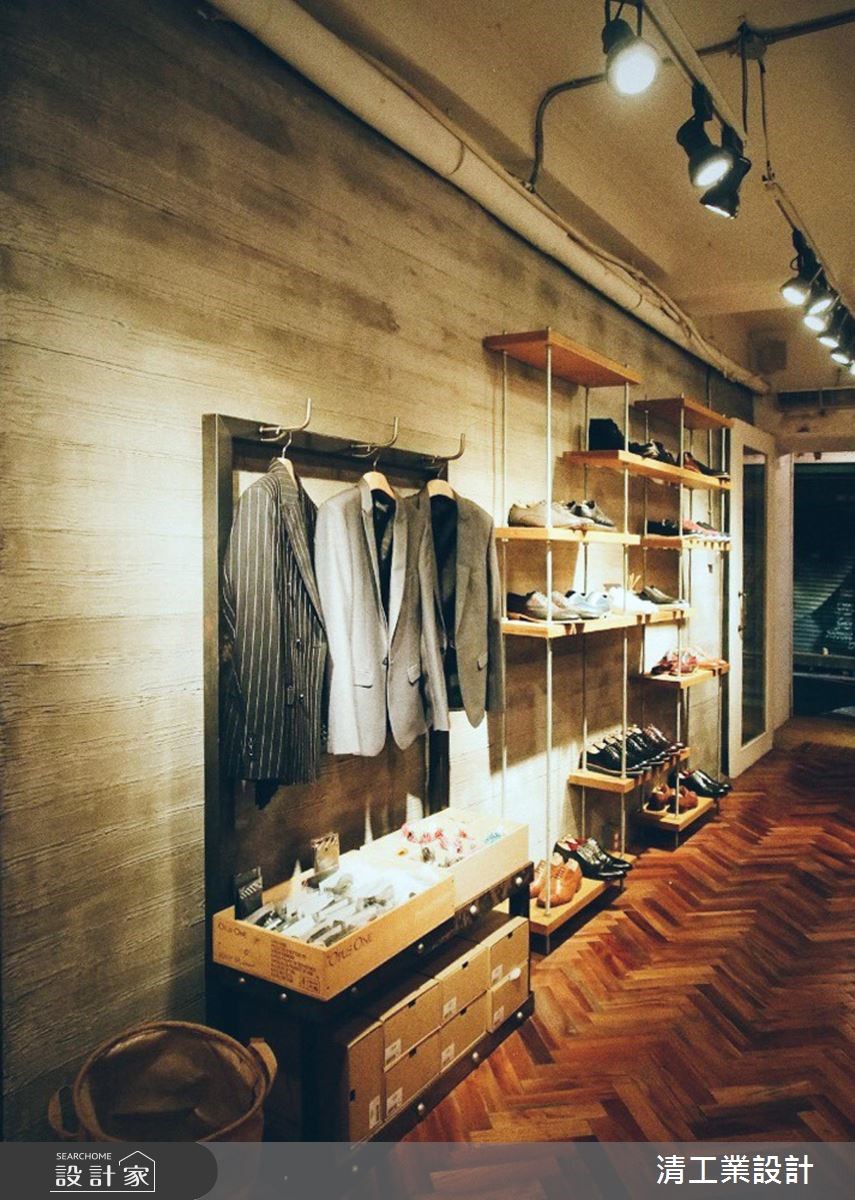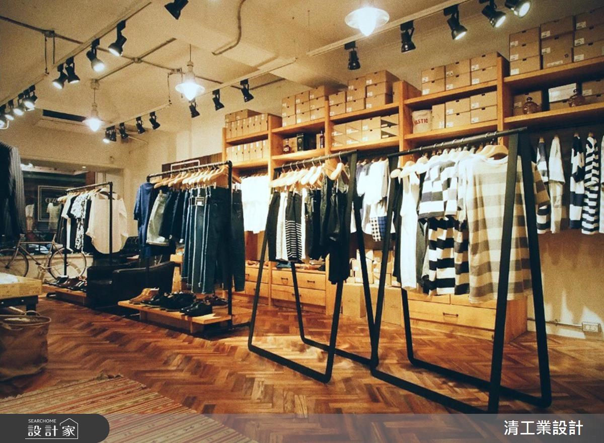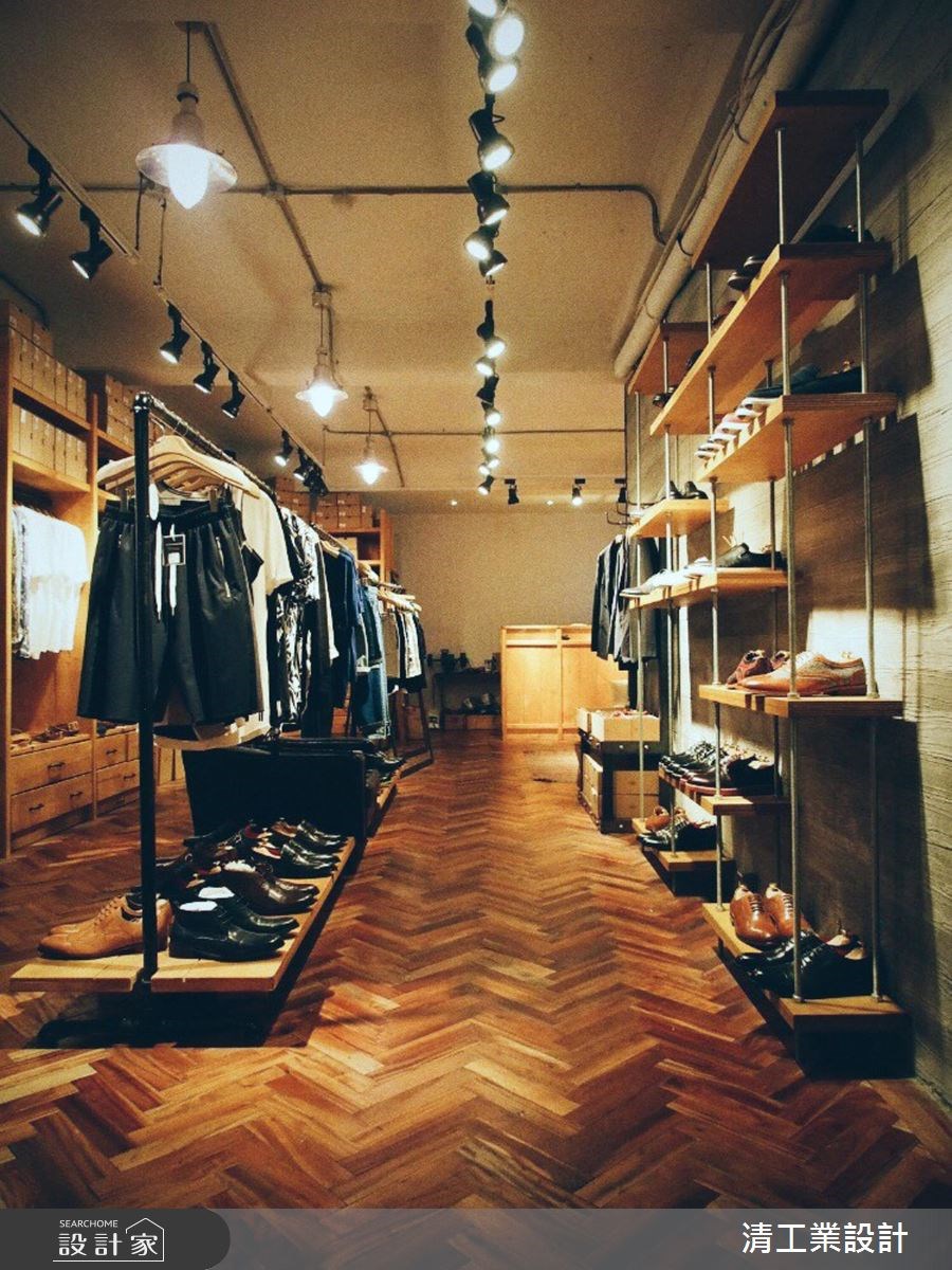格局動線上,利用消費者、過路行人視角,重新安排櫥窗位置、室內格局、陳列方式,進而規劃出吸睛門面、舒服的動線。透明的櫥窗讓室內大片人字拼木地板一目了然,溫潤的深褐色木地板搭配個性氛圍濃厚的軌道燈,成功吸引行人目光。陳列方式也別具巧思,座落正中央黑色主吊衣區兩旁留有寬敞走道,顧客較多時也不怕擁擠;左右牆面分別運用鐵件、木層板,讓服飾有不同的呈現面貌,附予收納豐富層次感。軌道燈光安排符合整體粗獷個性,也透過精準的打燈設計,提升商品視覺美感。