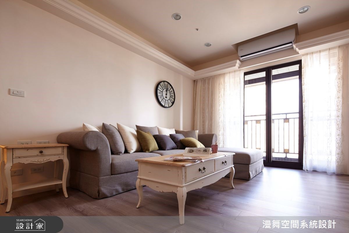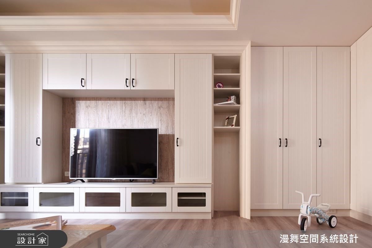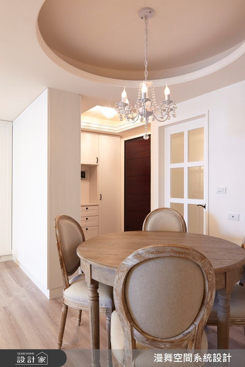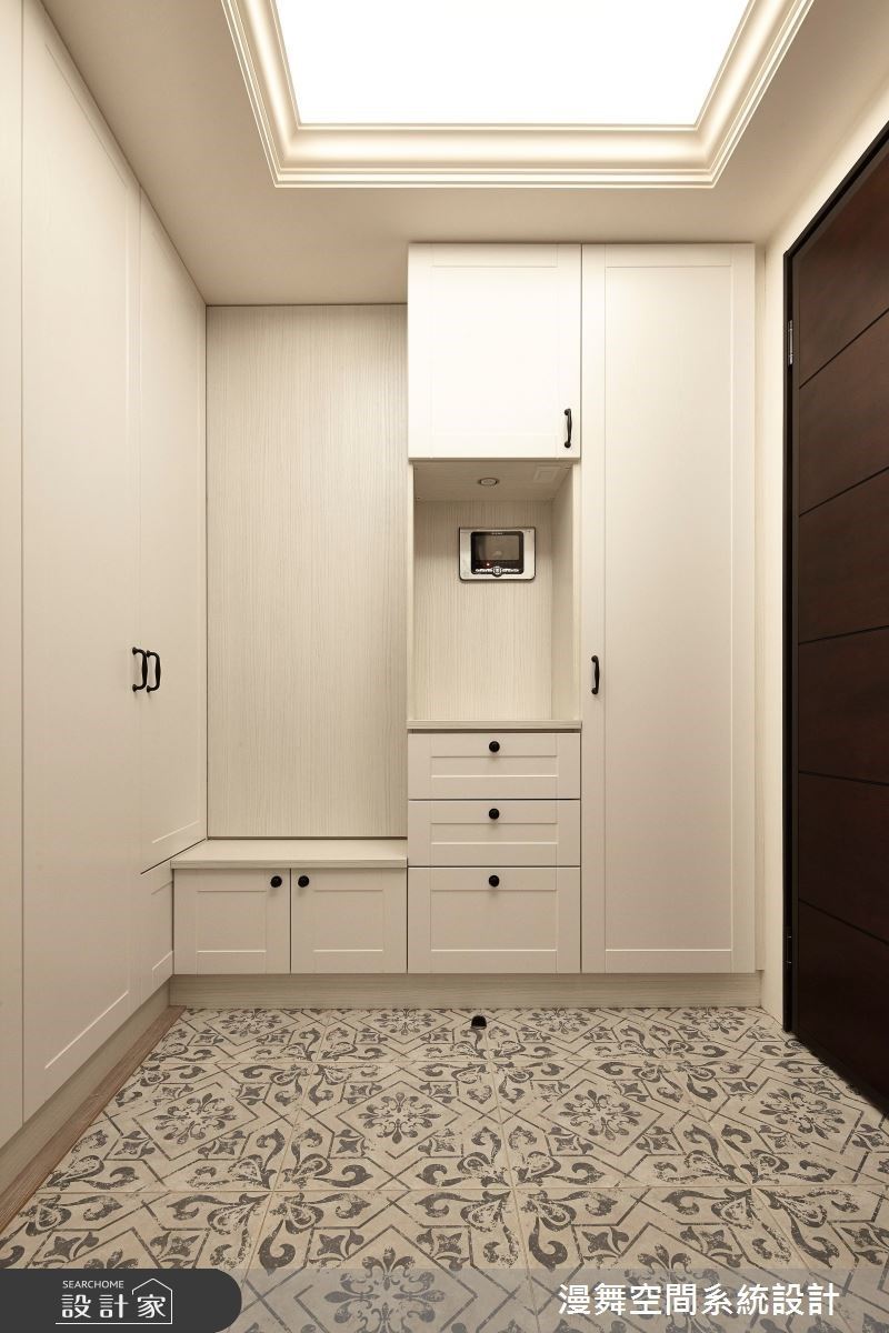 玄關地坪以復古磚鋪設,一旁伴隨白色調的櫃體,簡約之中增添優雅氣息,而以系統收納規劃出鞋櫃、衣帽收納、收納櫃以及隱藏電箱的機能,收納機能一路延伸至公領域,讓生活的實用度發揮到最大。客廳裡以超耐磨木地板鋪陳地坪,電視牆結合淺色調、線板勾勒的系統收納,調和出清爽的鄉村風基調,同時讓實用機能強化至最大,伴隨古典味道的茶几等家具擺設,挹注優雅質韻;靠近玄關的餐廳區,天花板描繪出層次圓弧形,延伸天際視野,垂掛一盞典雅的白色燈飾,增添精緻古典風情,再搭配厚實感的木頭餐桌椅,則注入濃濃的歐式田園氣息。