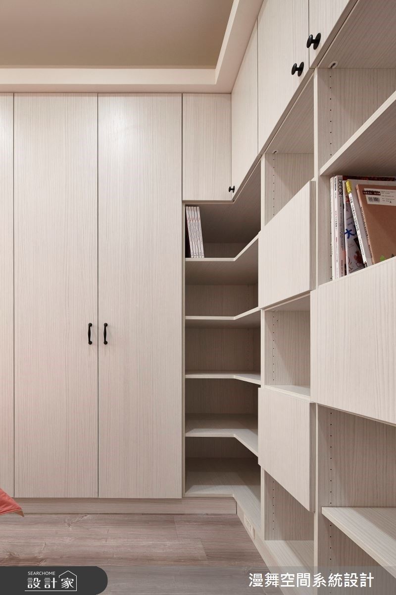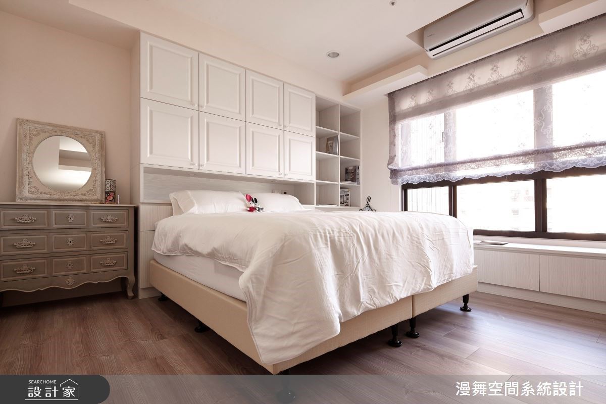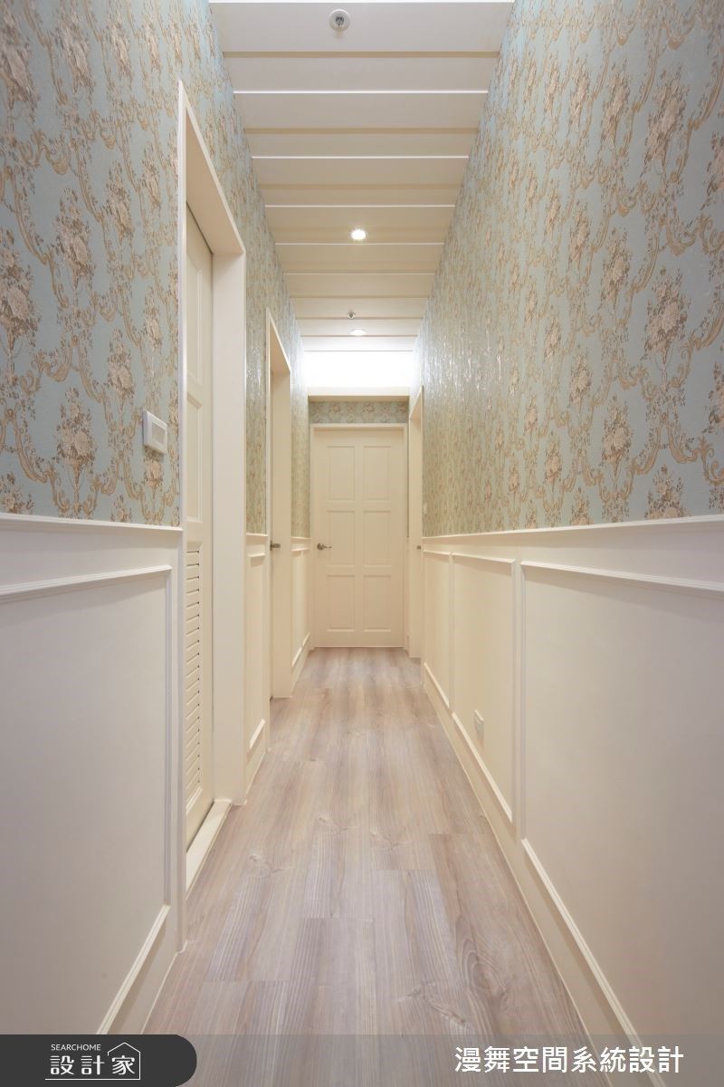 通往私領域的廊道上,線板勾勒出層次感的白牆,上半部貼附淡藍花繪的壁紙,流露出清爽的鄉村風。主臥床頭牆結合系統收納,白色調的安排讓空間更顯簡約;小孩房則以花卉與童趣感的壁紙為主題,替孩子創造繽紛、趣味感的童年時光。