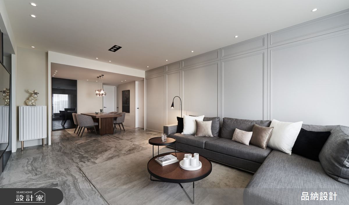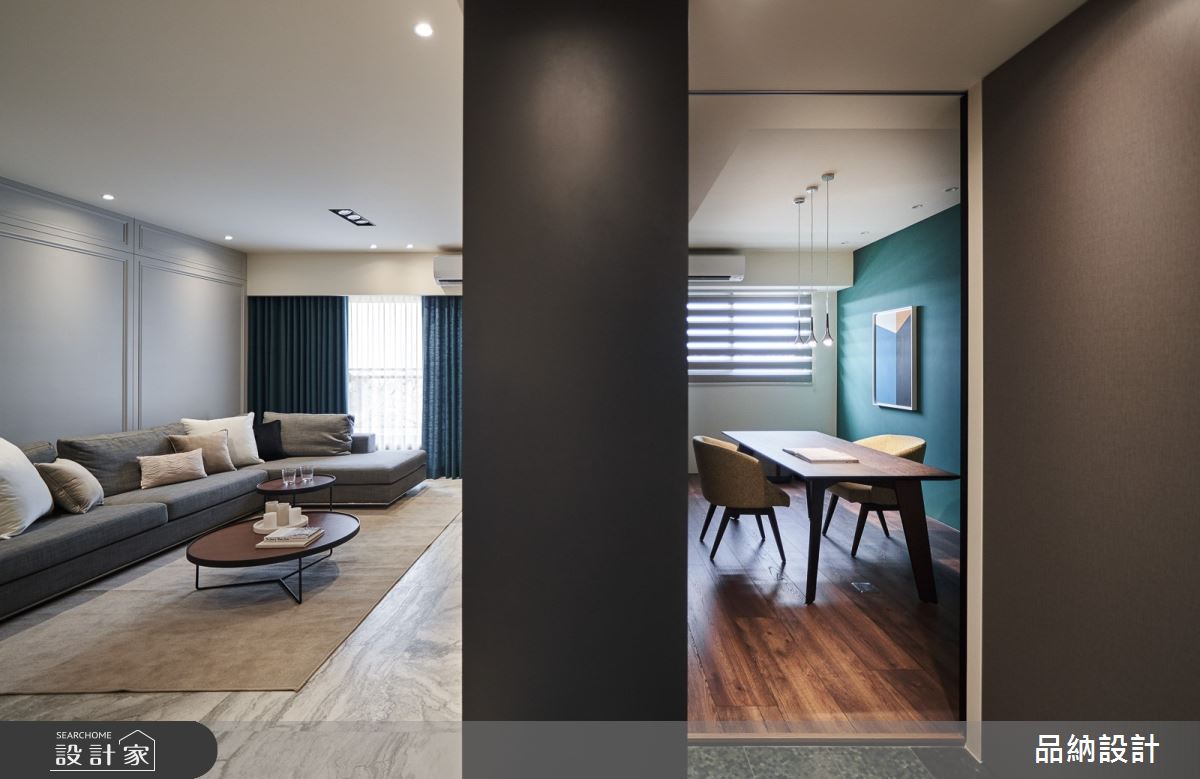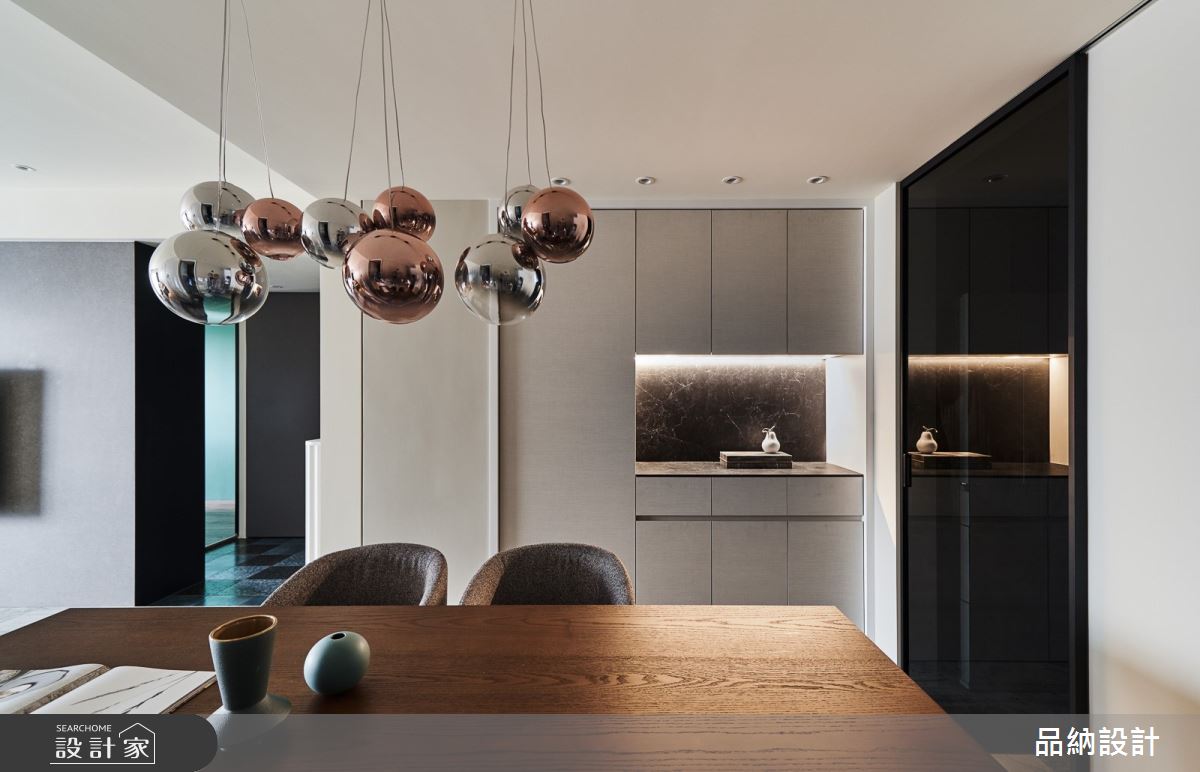 設計師依循樑體位置,將電視牆作為場域介質,開發出讓行走隨心所欲的雙動線,把書房設立於客廳後方,帶來通透空間感,創造回字型循環動線,讓家人不論在哪個空間,皆能保有關照與互動;書房內,採以木地板做鋪敘,並在立面揮灑活力的色彩裝飾,增強整體明亮度,搭配幾何色塊的演繹,讓閱讀氛圍打破單調和沉悶:客廳區域,透過輕柔淺色搭配沙發牆線板,詮釋溫潤輕柔的美式風韻,一路延伸的大理石地板則串起客廳、餐區,定義公共領域的範疇;礙於餐廳處於退縮地帶、光線較差,則選用通透深色建材打造廚房門片,在界定空間的同時也延伸空間感、減緩視覺壓迫,而球形吊燈則起到點亮視覺的作用!