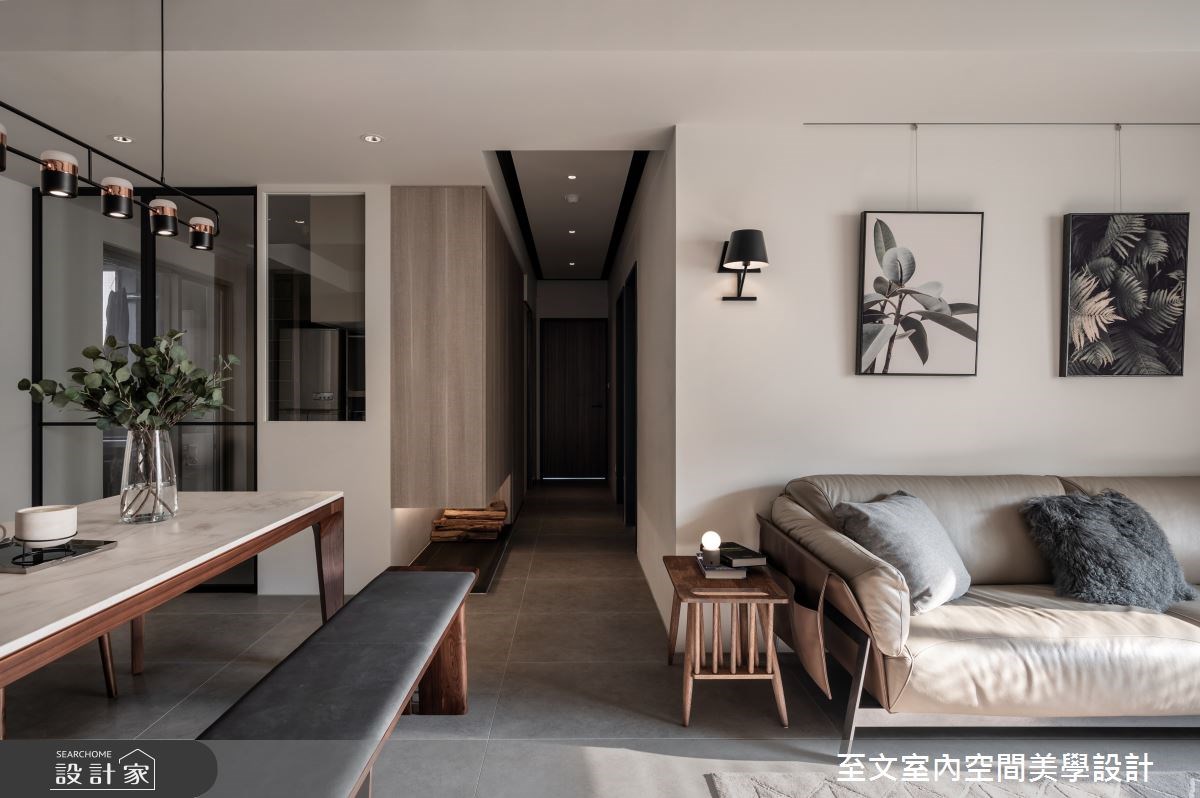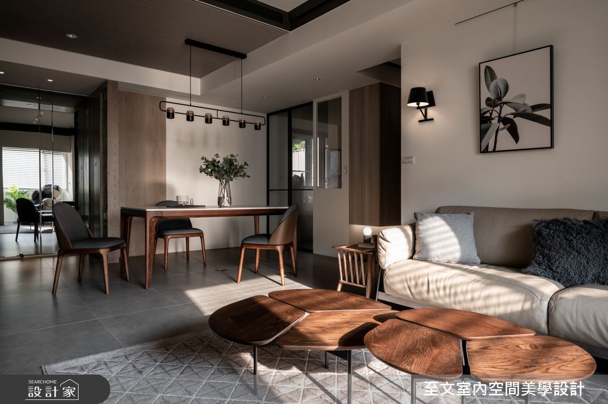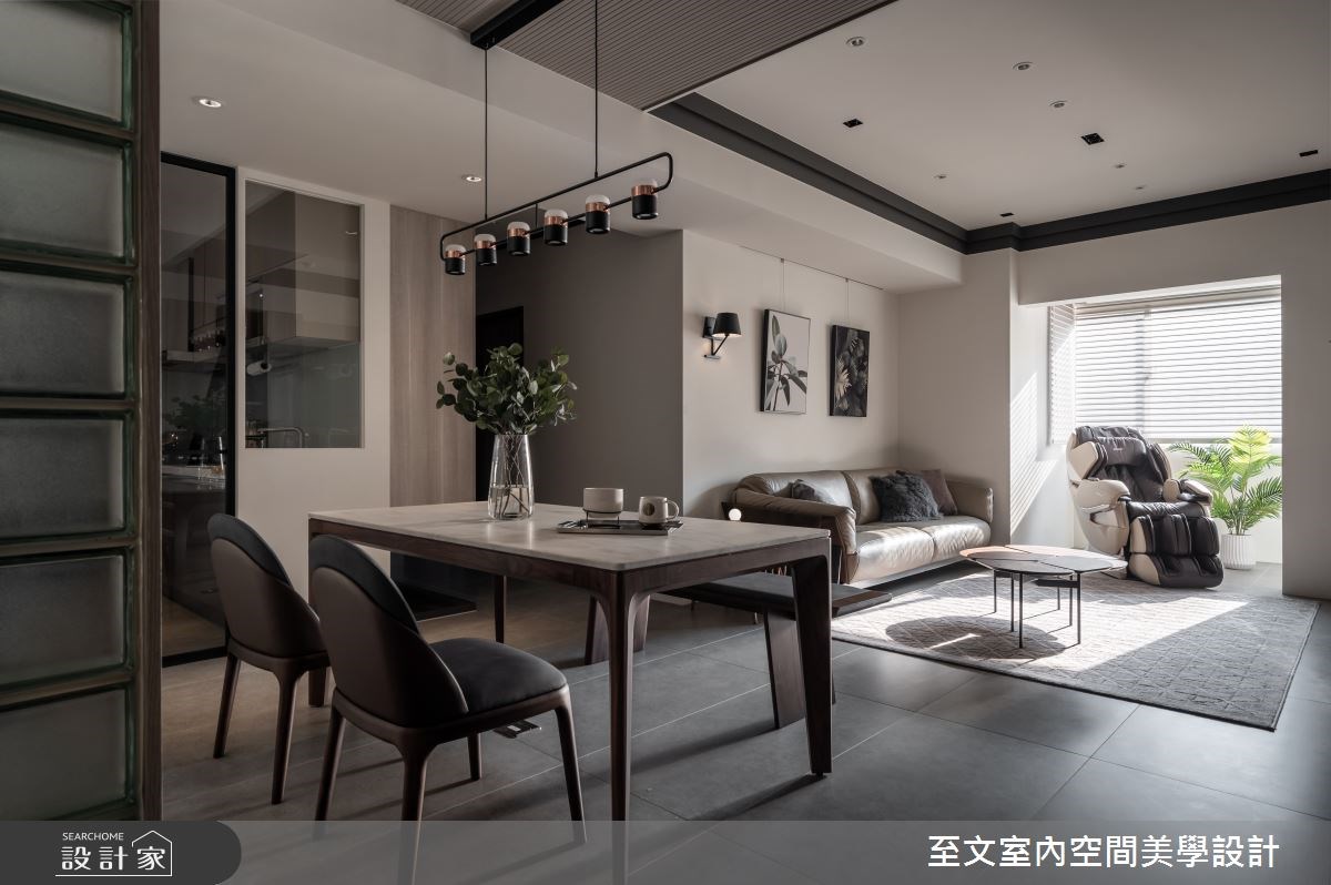 一進門藉由玻璃磚的折射,體會室內充滿溫暖光線的和諧氛圍,一旁的穿衣鏡也巧妙延伸空間尺度,從玄關就營造敞亮的家居氛圍。下方懸空的鞋櫃則一路延展到客廳電視牆,使櫃體能夠擁有完整性,不會破壞視覺的一致感。而客餐廳採取了開放式設計,餐廳的木作天花板與客廳的黑框收邊天花板,明顯區分出彼此界線,也創造強烈的空間立體度。