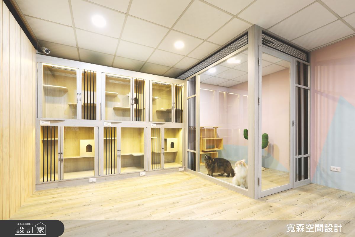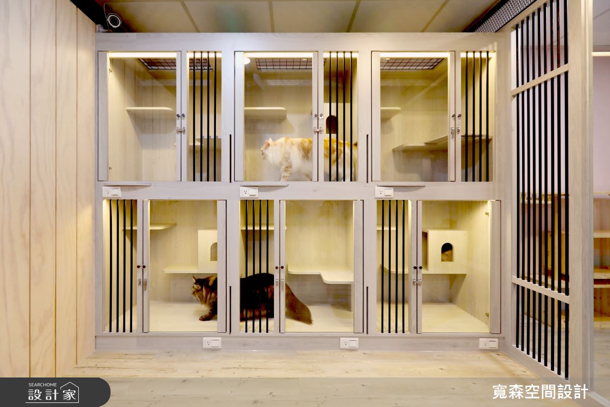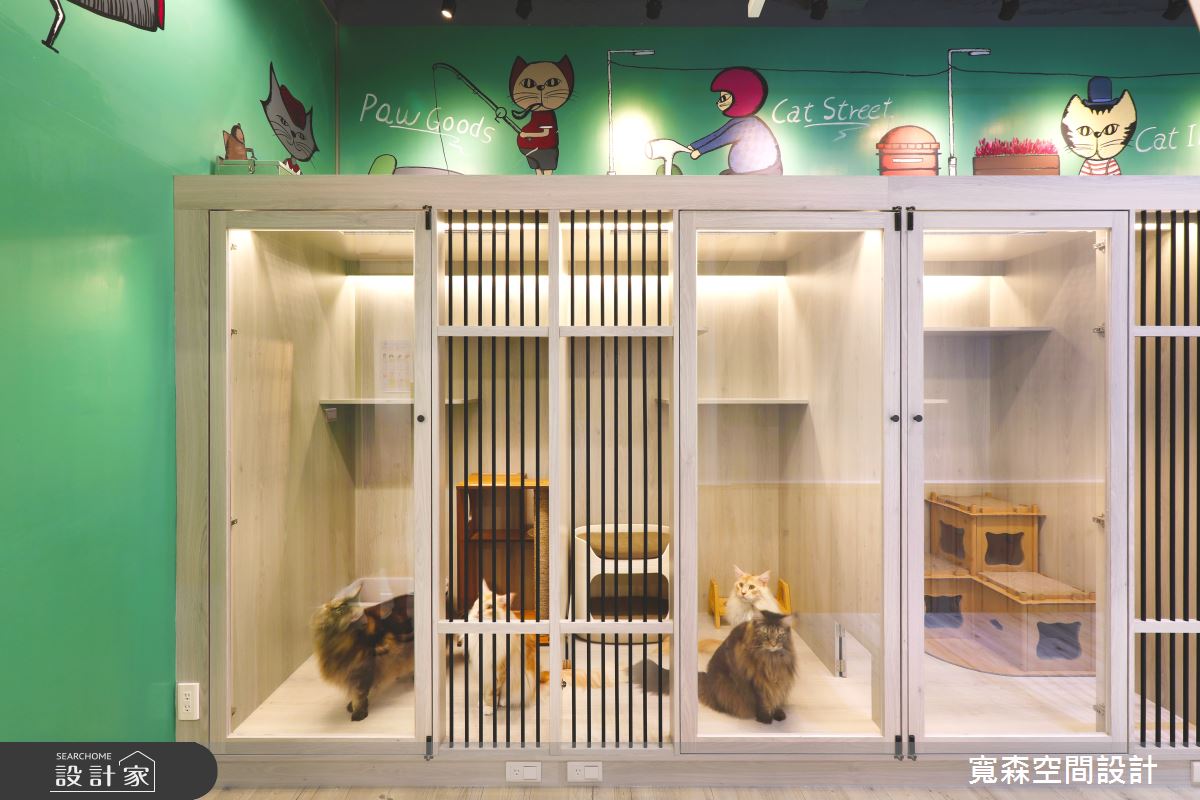 空間透過淺色木地板、漆料、鐵件烤黑為建材,打造出溫暖而輕盈的風格,並嚴選耐磨防滑的自然材質,加入流暢不壅擠的動線與擺設,讓貓咪活動更感安心;同時在天花板上做出許多通風口,使空間成為「風」的迴廊,讓氣流可自由流動,使狹長場域保有通風與新鮮空氣,而貓咪房間則妥善安排,連結於靠窗通風處,搭配大面積開窗引入陽光,讓整體環境充滿舒適性;牆面上,選用濃厚的綠為室內帶來暖意,並融合童趣意象的動物圖案,呈現森林系的反璞歸真,而寵物用品、罐頭等繁多商品類項也額外劃出一專屬區塊,給予陳列展售,讓動線更分明!