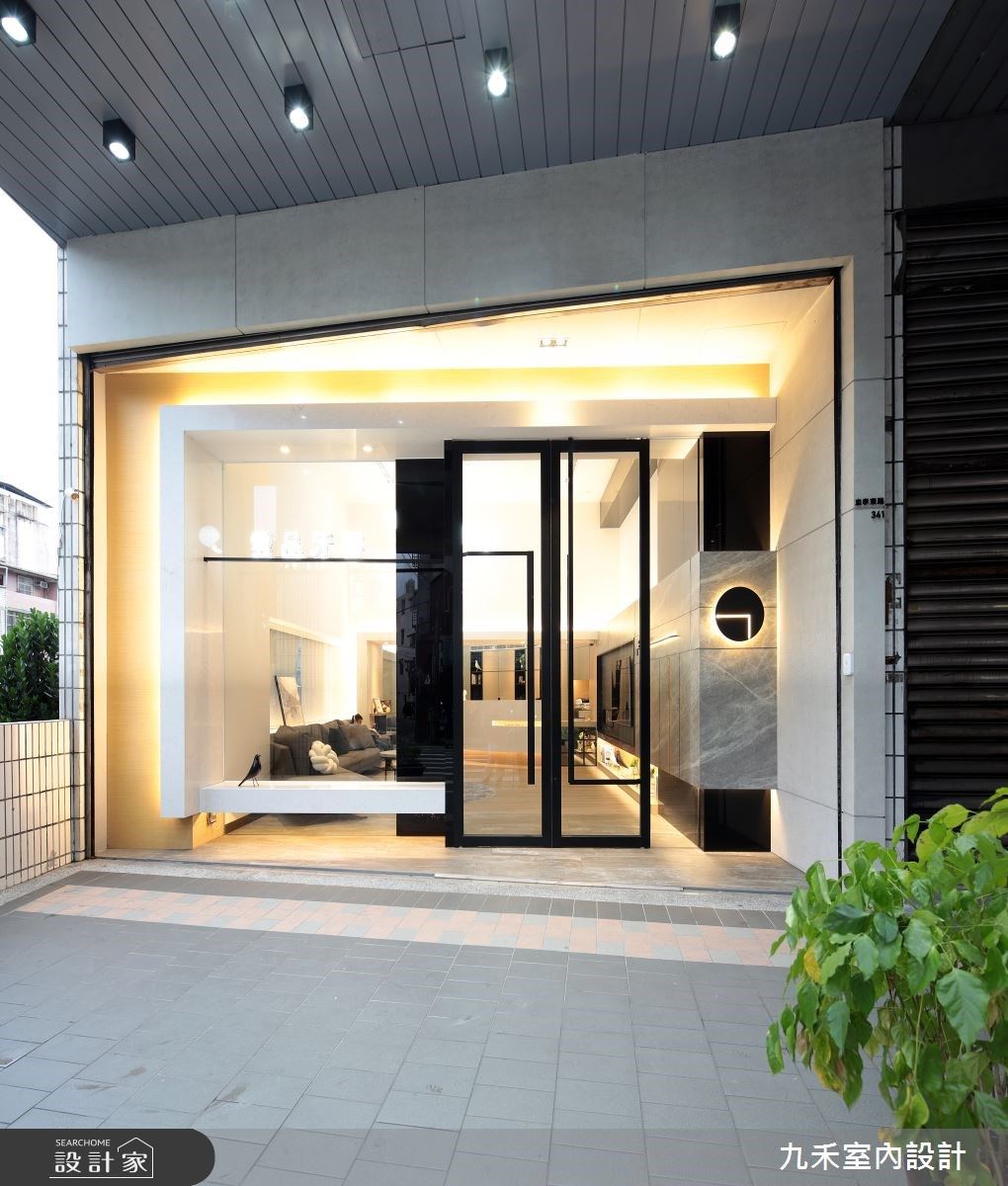 利用框架、線條與燈光營造彷彿櫥窗的豐富視覺層次,忽略了原本偏斜不正的門面,260 公分寬的大門,由外向內延伸景深的仿大理石的電視牆,藉由線條分割,打造大氣十足的入門印象。