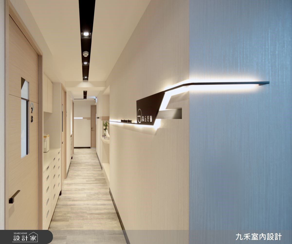 長廊以清淺的木及白為主調,過於深長的走道牆面,以燈光、線條打造診所的意象 LOGO,增添走動時的視覺趣味,也無形加深來客對診所的印象。
