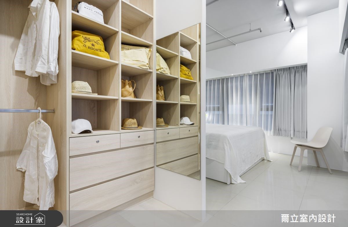 原本狹小的一小房直接客變成為更衣室與梳化區,實用的高低格櫃可分門別類放置衣物、包包,開放設計讓人取用時一目瞭然,甚至還有餘裕空間讓屋主添置五斗櫃,支援更多的收納量。