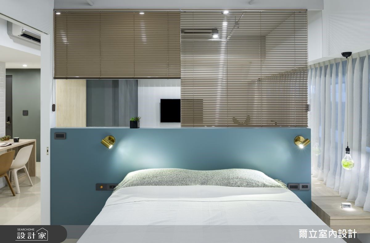 為了讓採光得以通透全室,設計師對唯一臥室做了微調。先是調整開門方向,將門口由面向客廳90 度轉向,原本過短的沙發牆得以延伸而完整,牆面上方採玻璃隔間增加視覺通透感,門片也改為推拉玻璃門,進出動線更精簡;客廳坐榻更延伸入主臥成為床邊矮桌,既可維持一致設計感又增加複合機能。