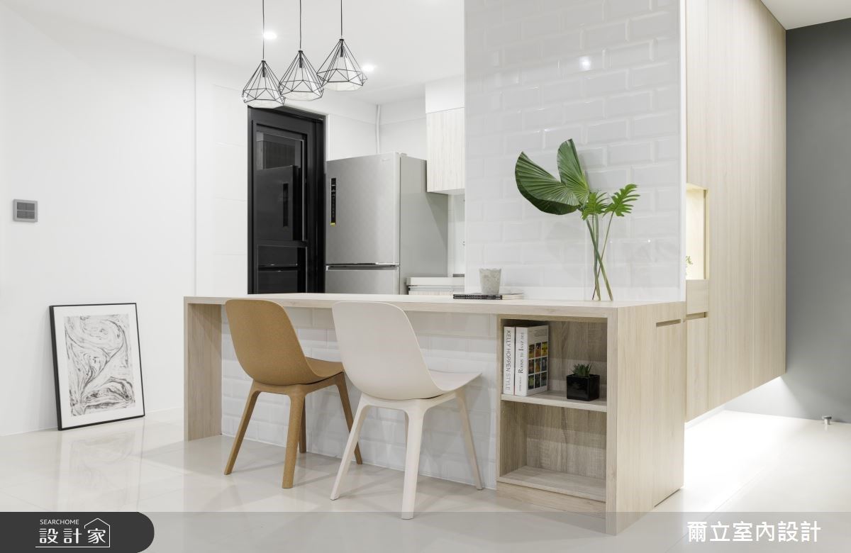 去除廚房牆面,打開與客廳的開放銜接,中島吧台由玄關櫃轉折成型,很適合小倆口輕食不多油煙的料理方式,下方更隱藏電器櫃與收納區。平時屋主在此用餐、閱讀、工作,也是朋友來訪的閒聊空間。