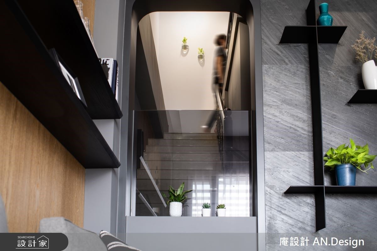 客廳空間最大的格局改變,即是在沙發牆旁側做出一個開口,可從廳區望見樓梯動線,衍生小型的觀景窗視野,並透過挖空設計,瓦解客廳沙發實牆的封閉壓迫感,讓空間感有所延伸,使動線與視線均能夠串聯。
