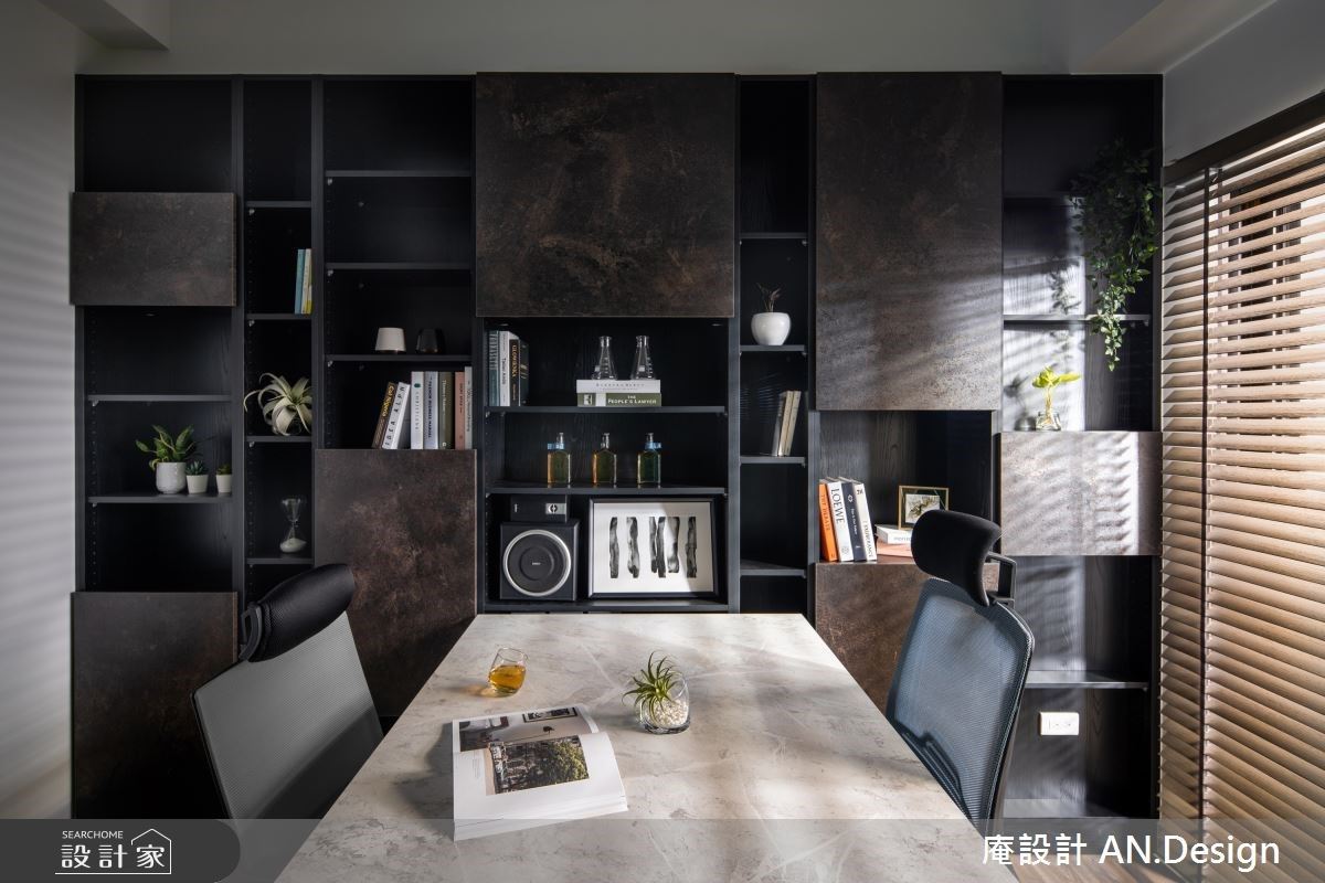 針對夫妻的習慣,於書房規劃一張共用閱讀桌,同時配置大面積收納展示端景櫃!滿足使用需求,搭配仿石紋板料製成的桌台,讓書房顯得優雅有質感;寢臥則以珪藻土帶出質感且兼具調節濕度的機能性,讓系統櫃做出開口變化,加入植栽與線性勾勒,美化空間機能表情。