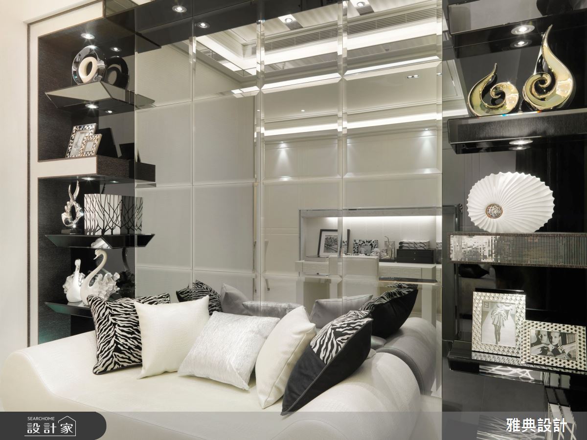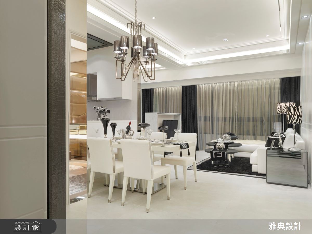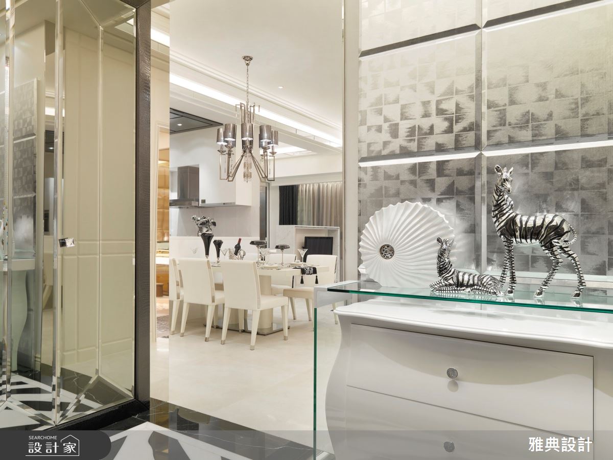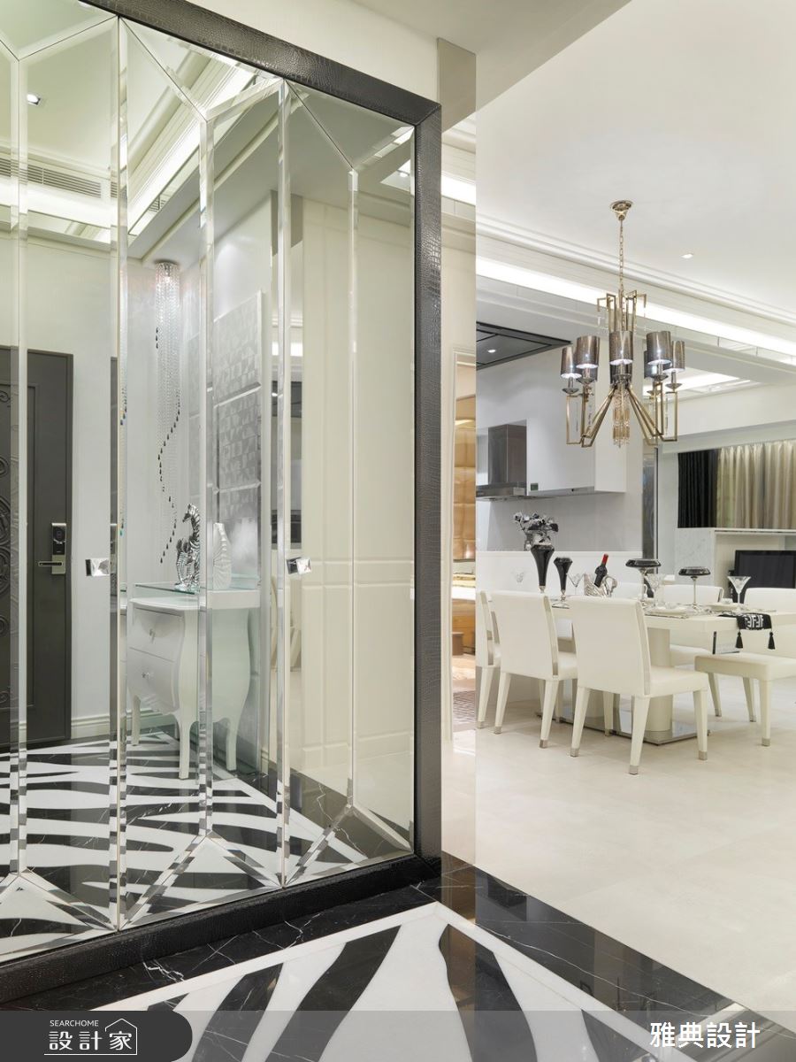 玄關區域,地坪以動物紋線條與端景飾品相呼應,並裝飾鏡面牆打造時尚氛圍,角落點綴水晶燈形塑焦點,帶出奢華印象;客、餐廳則相互串聯,保有獨立的互動關係,採以白色做為空間基底,搭配緞面、皮革等細緻材質,與俐落家具形成絕佳組合,斑馬紋燈具更恰如其分地呼應黑白主題,營造鮮明焦點;同時配置半高電視牆,界定出客廳與多功能書房的區塊,並劃出流暢動線,在牆面安排鑽石切面造型,映照出寶石的晶亮感,兩側搭接展示架,在光影輝映之間形成璀璨的廳區風景!