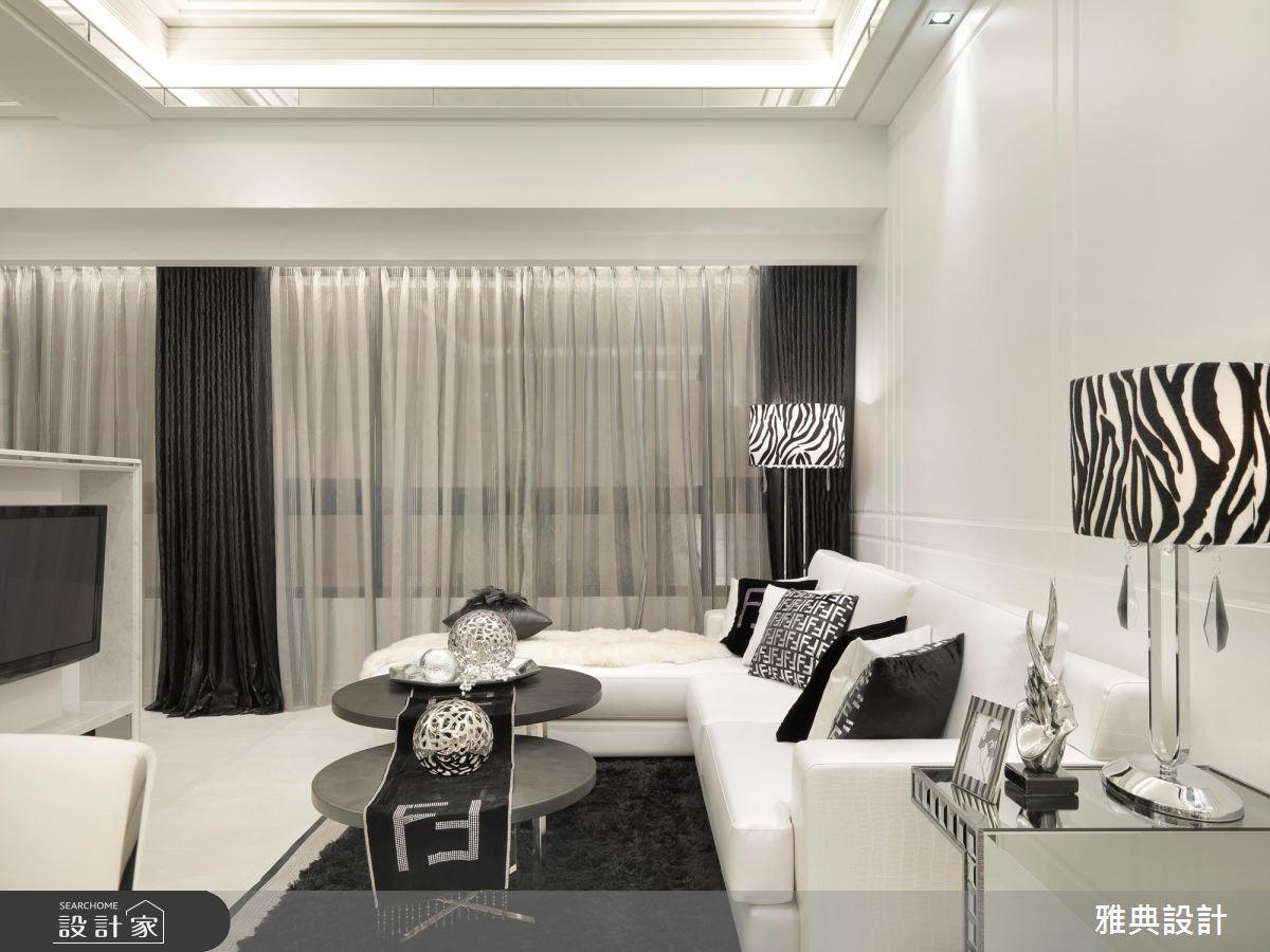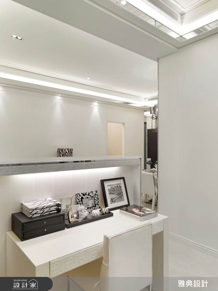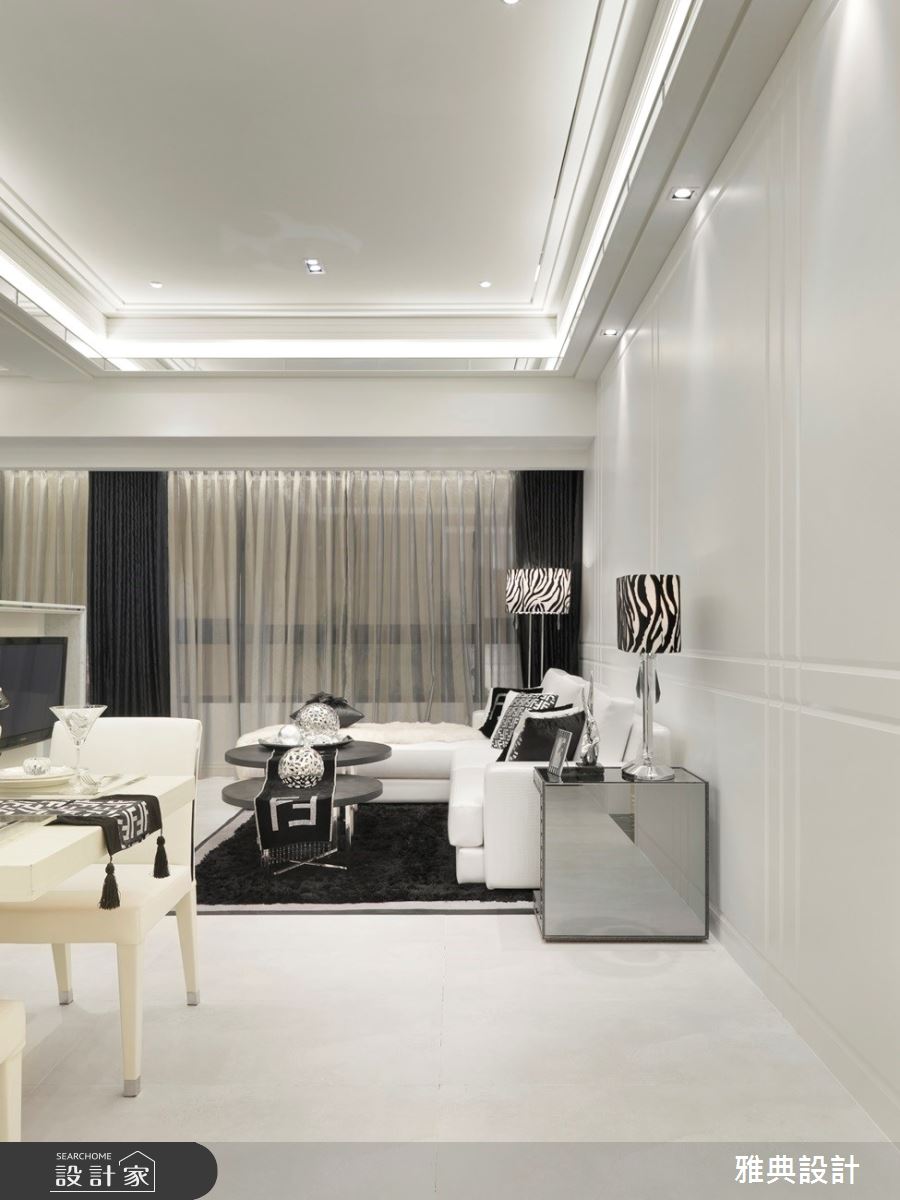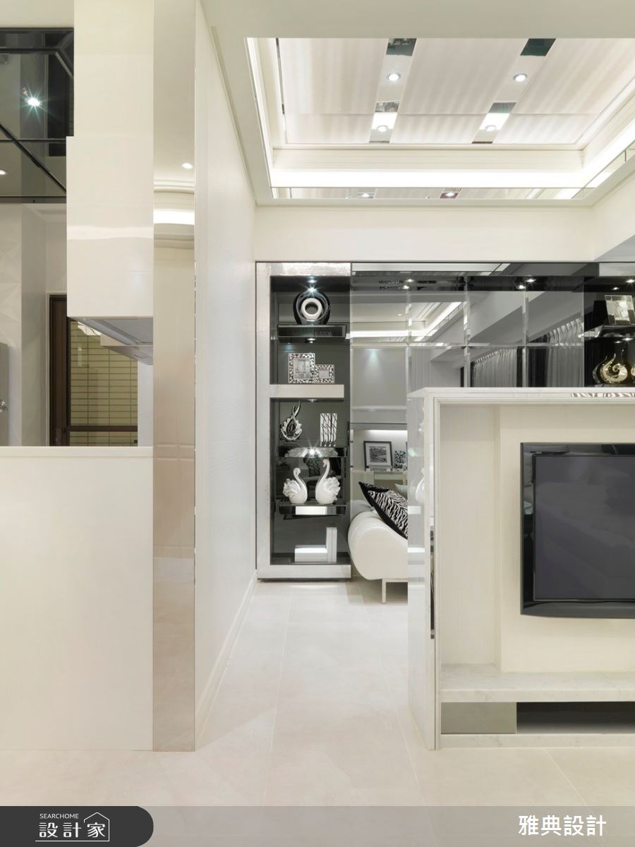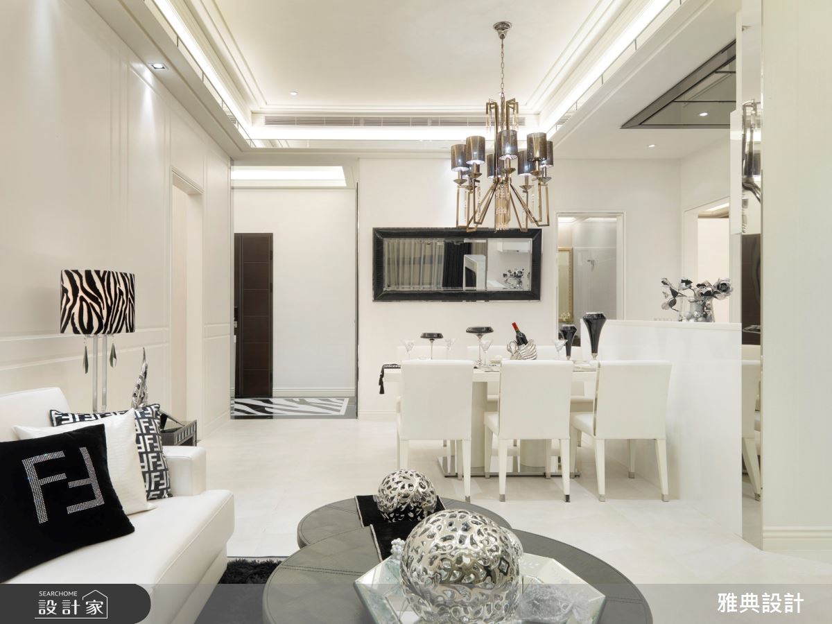 玄關區域,地坪以動物紋線條與端景飾品相呼應,並裝飾鏡面牆打造時尚氛圍,角落點綴水晶燈形塑焦點,帶出奢華印象;客、餐廳則相互串聯,保有獨立的互動關係,採以白色做為空間基底,搭配緞面、皮革等細緻材質,與俐落家具形成絕佳組合,斑馬紋燈具更恰如其分地呼應黑白主題,營造鮮明焦點;同時配置半高電視牆,界定出客廳與多功能書房的區塊,並劃出流暢動線,在牆面安排鑽石切面造型,映照出寶石的晶亮感,兩側搭接展示架,在光影輝映之間形成璀璨的廳區風景!
