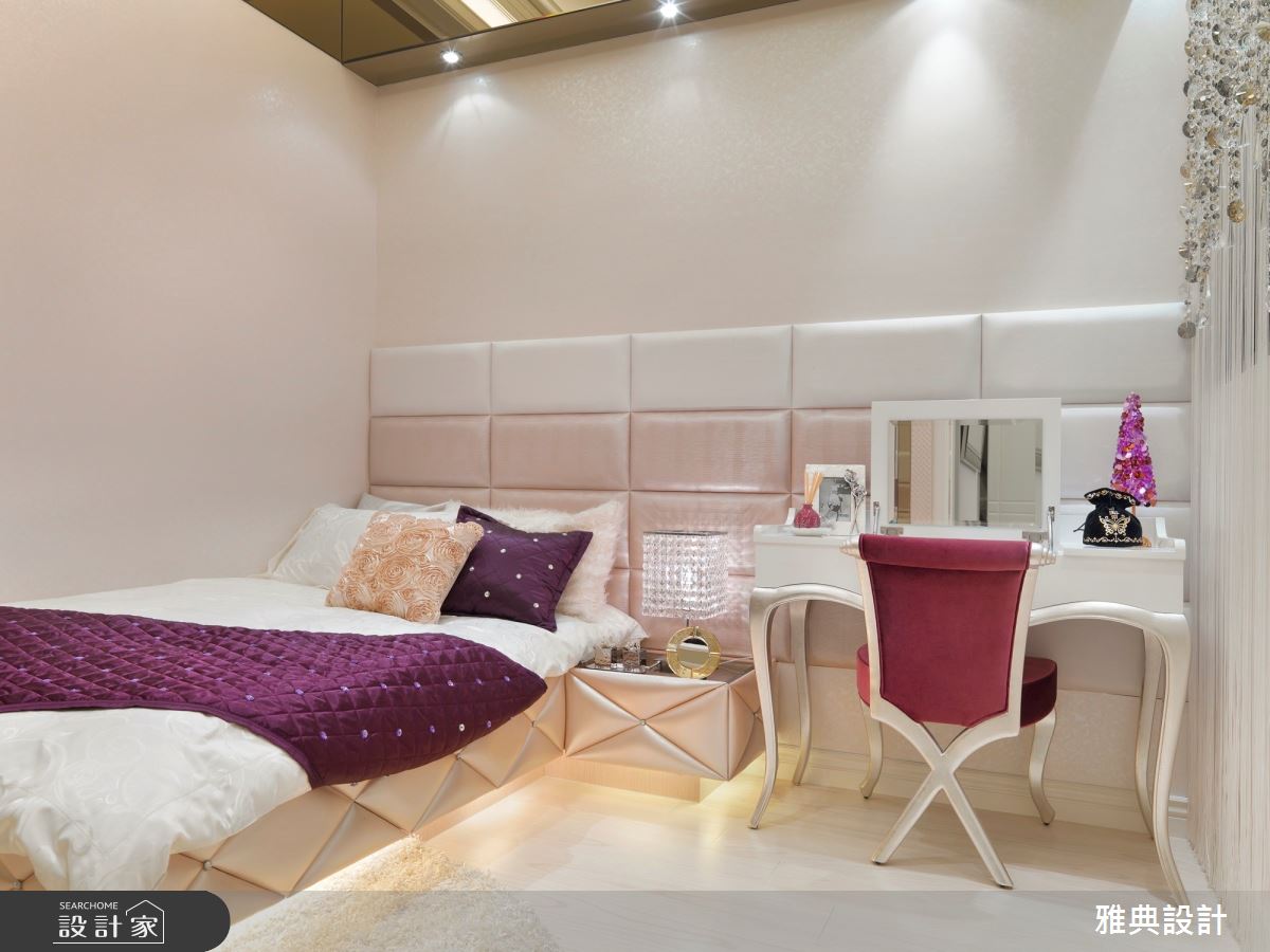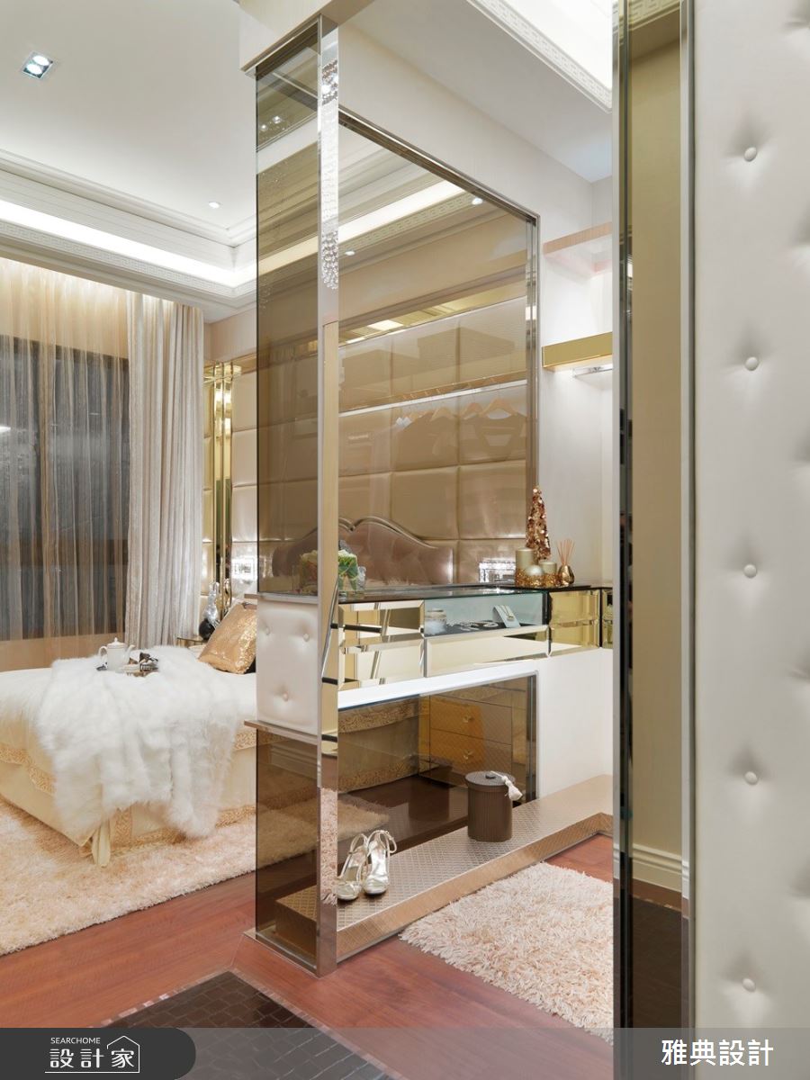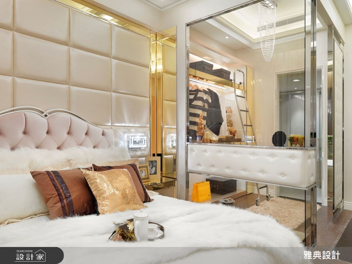 主臥室,以華貴柏金作為主題,床頭做出金色框邊,搭配淺色拉扣繃皮,且規劃玻璃隔間的設計,串起睡眠區與更衣室之間的視線,讓空間感更顯通透輕盈!