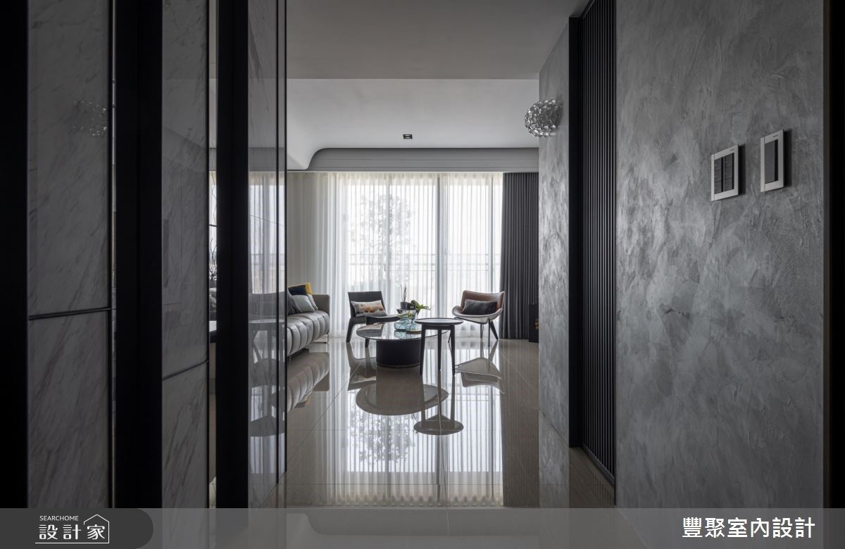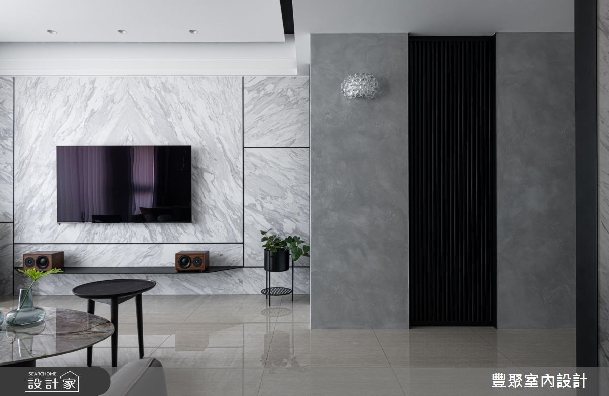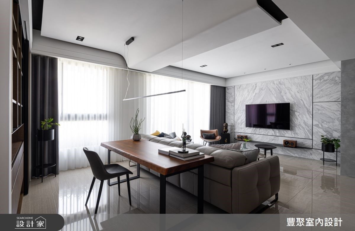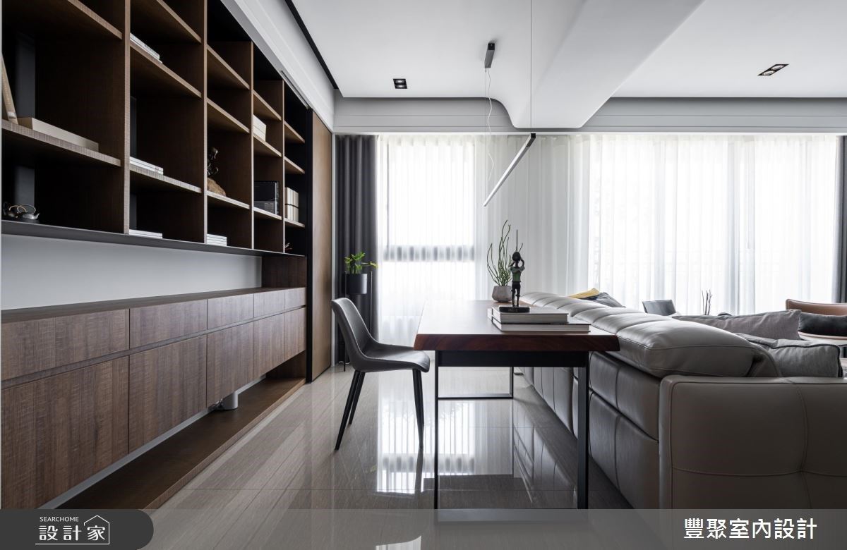 入口處的牆體飾以義大利特殊漆人工塗層,其間結合格柵造型的鐵件門,創造出儲藏室外觀,展現低調且時尚感的視覺造型。充沛的自然光映照在石材肌理的電視牆與地坪,讓公領域更顯輕盈透亮,淡雅紋理的電視牆風貌,更替整體空間增添時尚感;沙發上方的天花板捨棄包覆或平釘方式,以黑、白兩色描繪,以及圓弧線條美化大樑,同時也象徵屋主經過人生歷練後,做人處世更為圓滑之意;客廳臨窗單椅的擺設,滿足屋主聽音樂、品茗以及閱讀的喜好;沙發後方以開放式書房規劃,透過深色木紋為基底,塑造出安定與溫潤質感的沉靜空間。