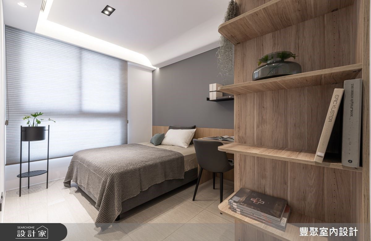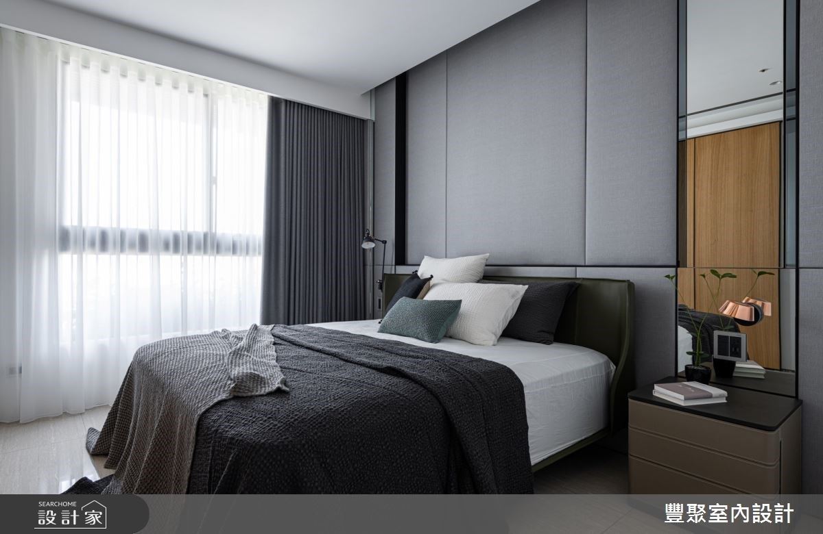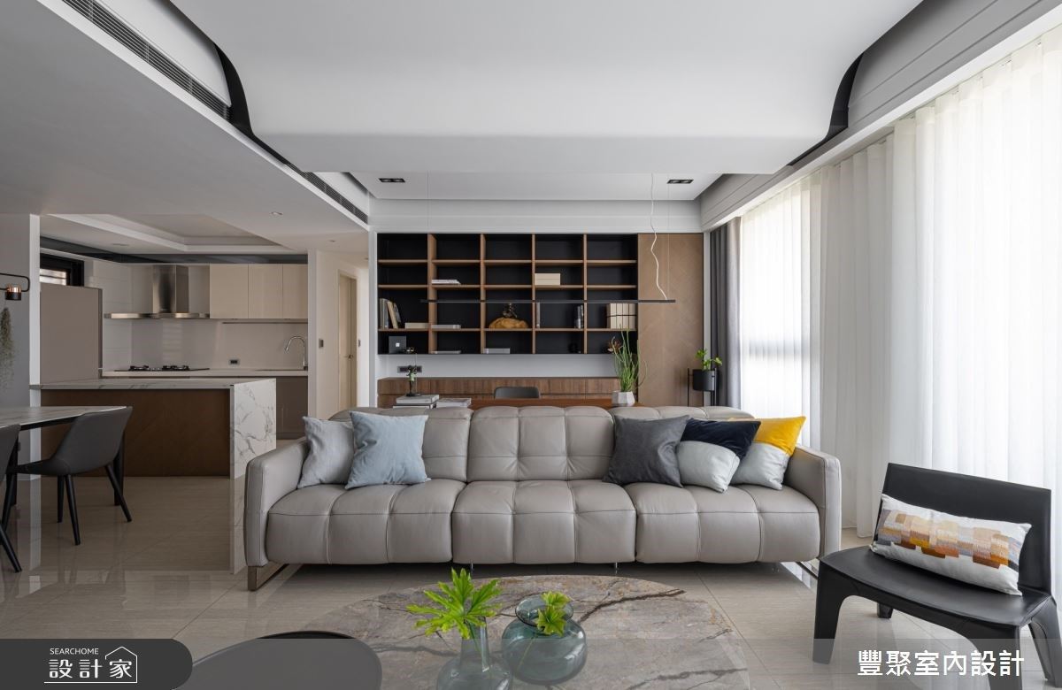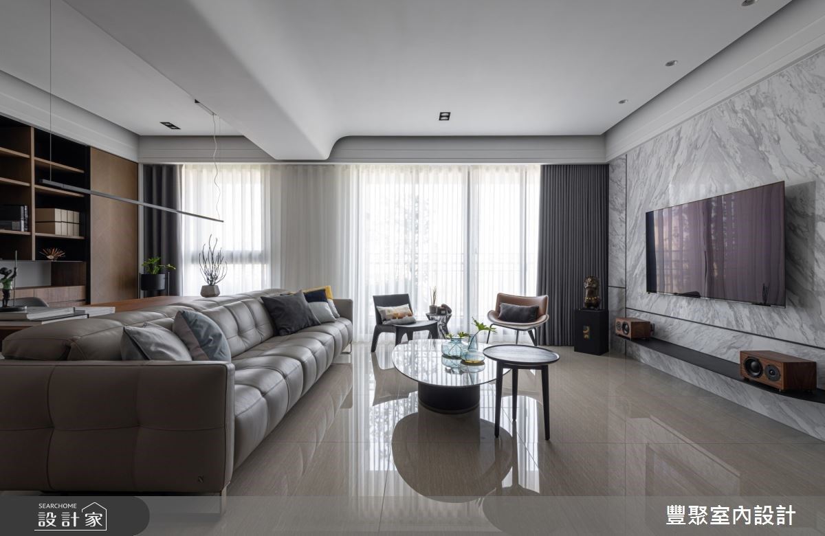 入口處的牆體飾以義大利特殊漆人工塗層,其間結合格柵造型的鐵件門,創造出儲藏室外觀,展現低調且時尚感的視覺造型。充沛的自然光映照在石材肌理的電視牆與地坪,讓公領域更顯輕盈透亮,淡雅紋理的電視牆風貌,更替整體空間增添時尚感;沙發上方的天花板捨棄包覆或平釘方式,以黑、白兩色描繪,以及圓弧線條美化大樑,同時也象徵屋主經過人生歷練後,做人處世更為圓滑之意;客廳臨窗單椅的擺設,滿足屋主聽音樂、品茗以及閱讀的喜好;沙發後方以開放式書房規劃,透過深色木紋為基底,塑造出安定與溫潤質感的沉靜空間。