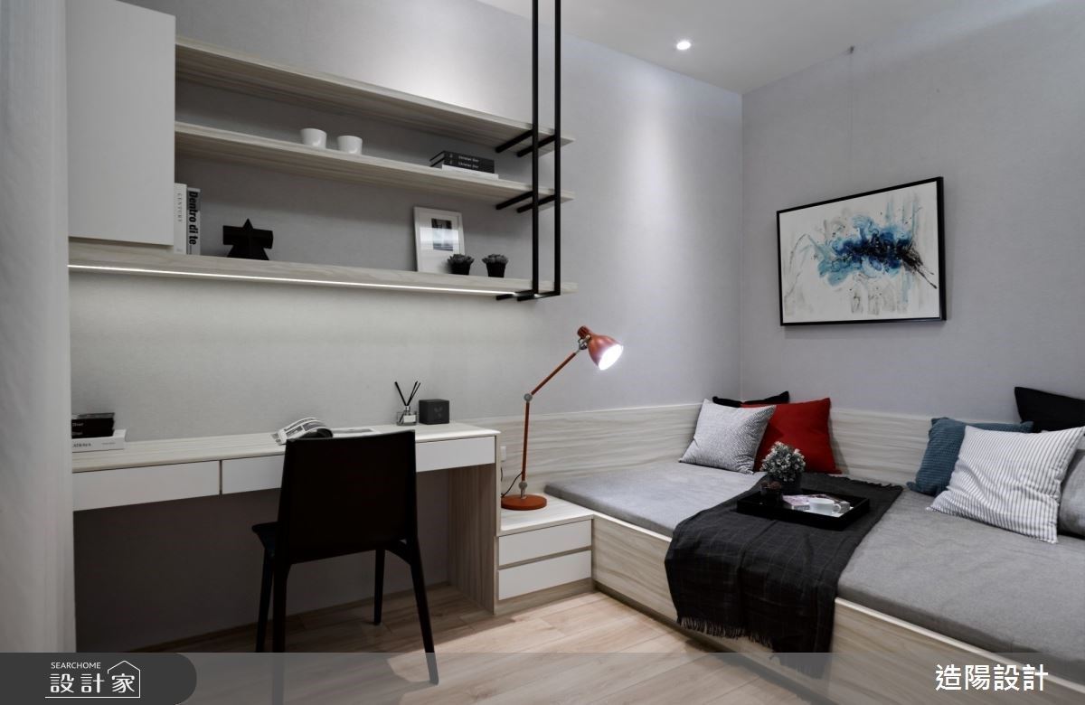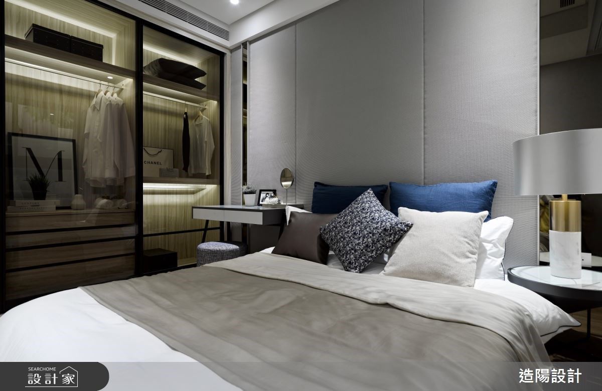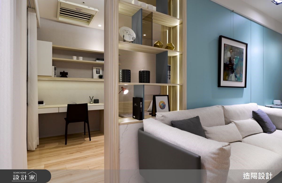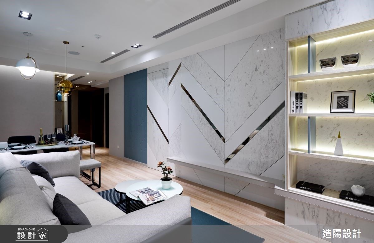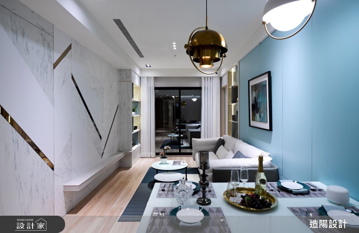 玄關區域,結合系統鞋櫃和鏡面交錯,增添收納機能之餘,又放大空間視覺感。走入室內,依循淺灰、深藍的色彩鋪排,引導視覺落於純白色系的大理石牆,在幾何線條分割下,以金屬、鏡面材質妝點其中,注入優雅大方的微奢氣息,並與馬卡龍藍的沙發背牆相互呼應,渲染時尚經典的生活質感。書房區域,淺灰色系和木紋交織下,配置舒適臥榻,予人放鬆與專注皆宜的居家情境。主臥房內,旁側衣櫃透過玻璃框邊和展示光影,刻畫猶如精品陳列的高端感受。