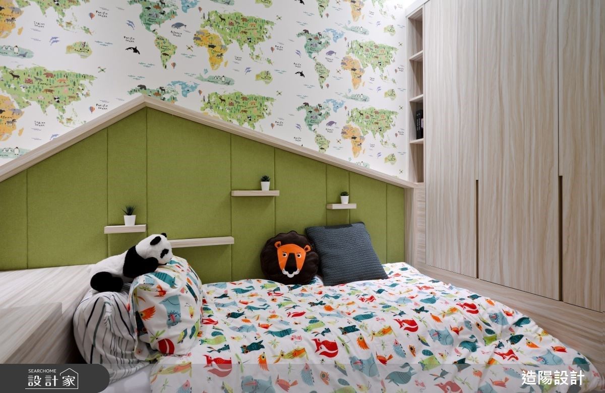 小朋友臥房內,以青草綠為基調,立面大量填滿繽紛地圖壁紙,適時以童趣的動物圖樣點綴寢具,為孩子打造充滿無限想像的快樂天地。