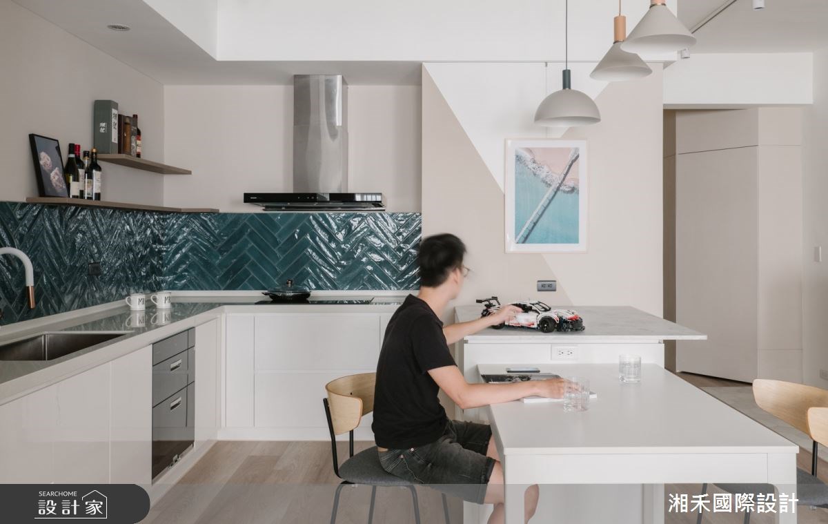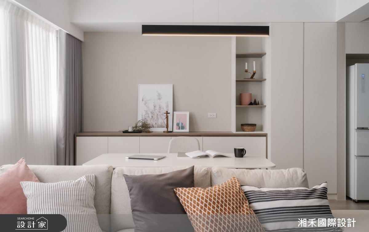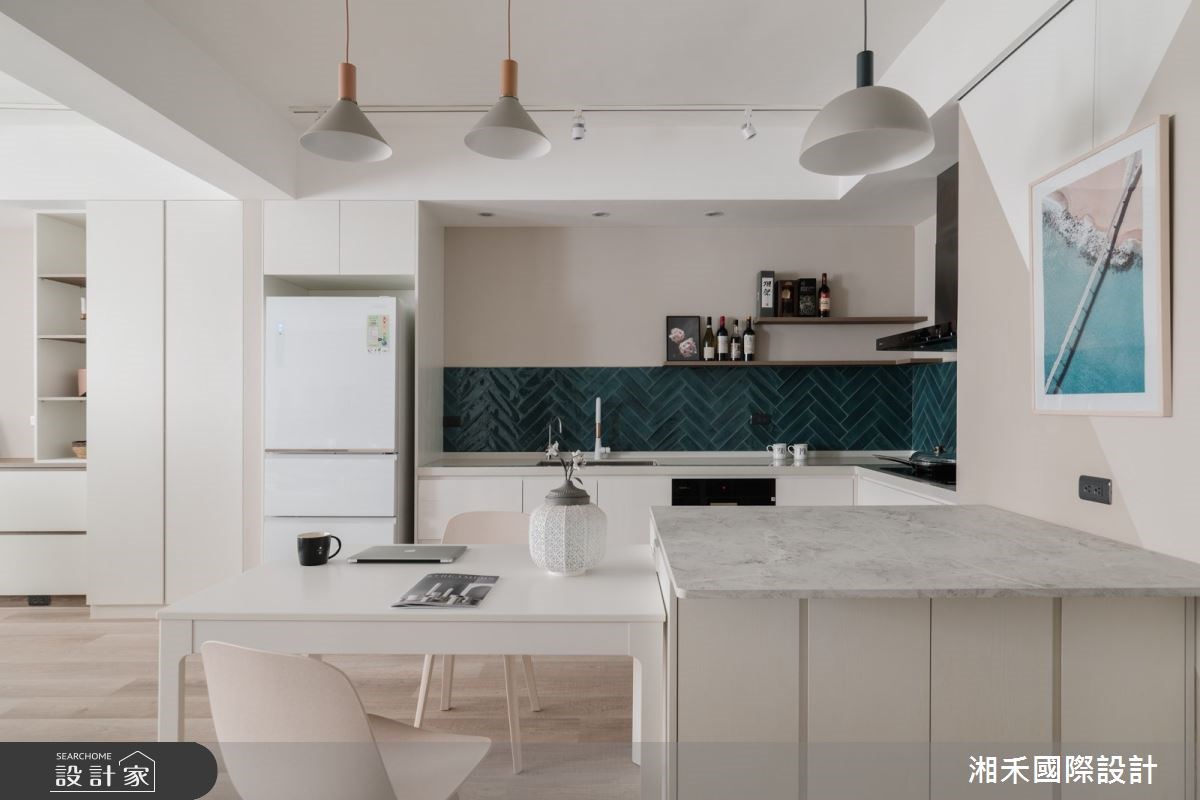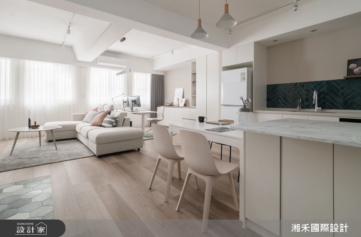 設計師考量屋主需求,採開放式設計形塑偌大的公共空間,增添全家人相處的時光,凝聚彼此間的情感。玄關區域,以深灰木格柵揭開序幕,在灰階六角磚的鋪陳下,搭襯穿鞋椅建立落塵區。客廳則藉窗外引入充沛日光,形塑通透明亮的感受,電視主牆鋪陳裸粉色,傾注溫暖親切的質感,以沙發為界,預留屋主的書房區域,工作之餘也不失和家人對話的機會。餐廚區域,透過湖水綠的人字拼鋪陳,為室內描繪出嶄新樣貌,備餐檯面則與餐桌串連,為料理時光展現更多的彈性機能。