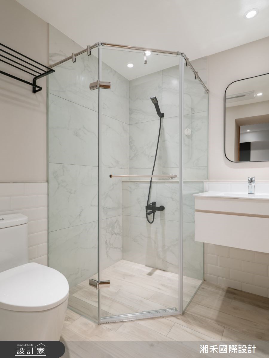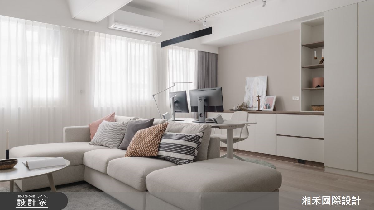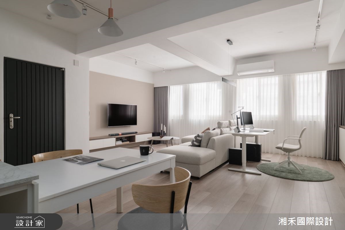 設計師考量屋主需求,採開放式設計形塑偌大的公共空間,增添全家人相處的時光,凝聚彼此間的情感。玄關區域,以深灰木格柵揭開序幕,在灰階六角磚的鋪陳下,搭襯穿鞋椅建立落塵區。客廳則藉窗外引入充沛日光,形塑通透明亮的感受,電視主牆鋪陳裸粉色,傾注溫暖親切的質感,以沙發為界,預留屋主的書房區域,工作之餘也不失和家人對話的機會。餐廚區域,透過湖水綠的人字拼鋪陳,為室內描繪出嶄新樣貌,備餐檯面則與餐桌串連,為料理時光展現更多的彈性機能。