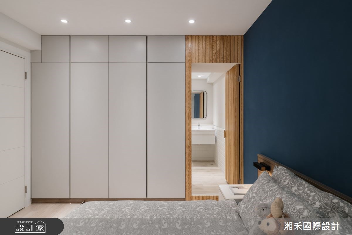 主臥房內,以沈穩知性的經典藍為主色,注入寧靜安定的氛圍,並將格柵門片和系統衣櫃結合壁面收齊,呈現簡潔俐落的視覺感。
