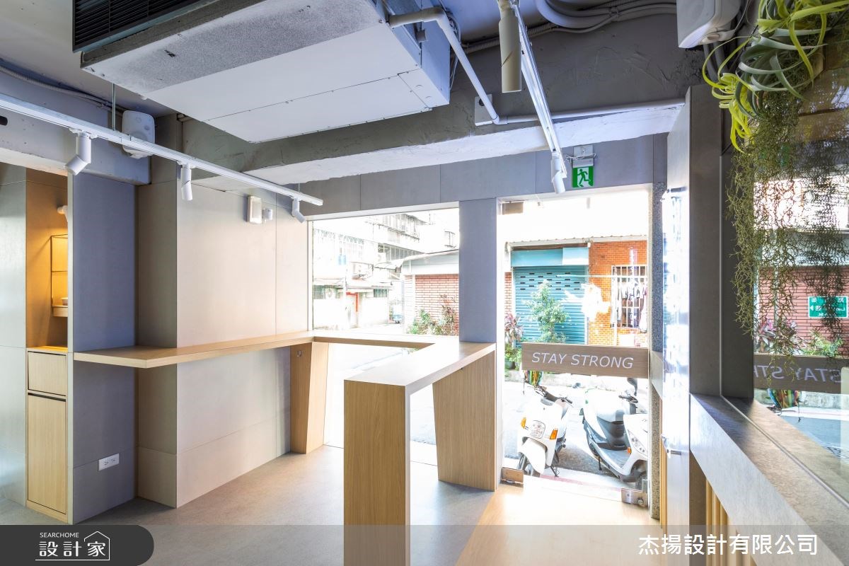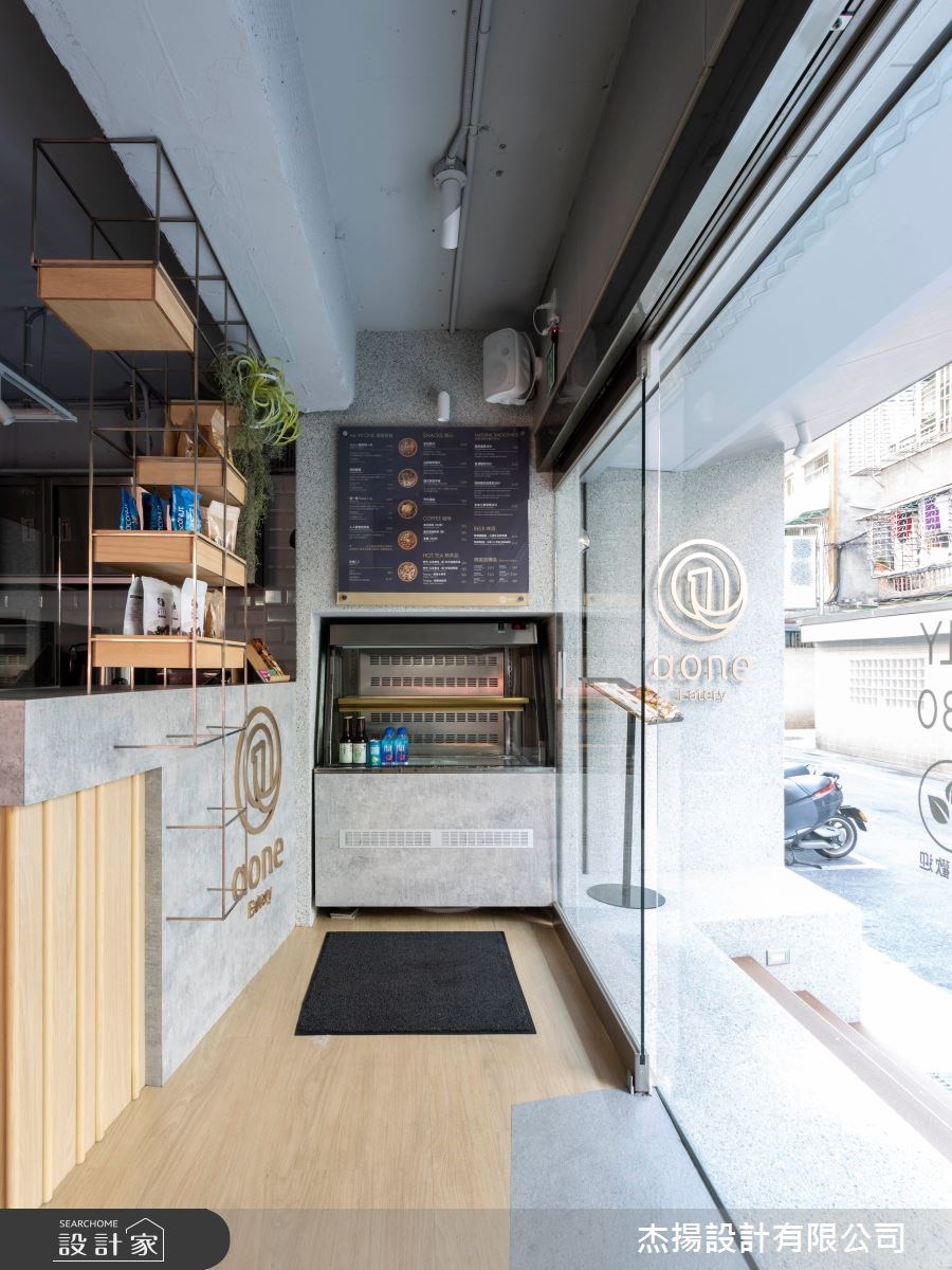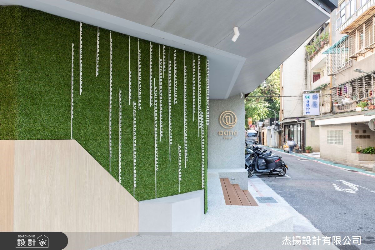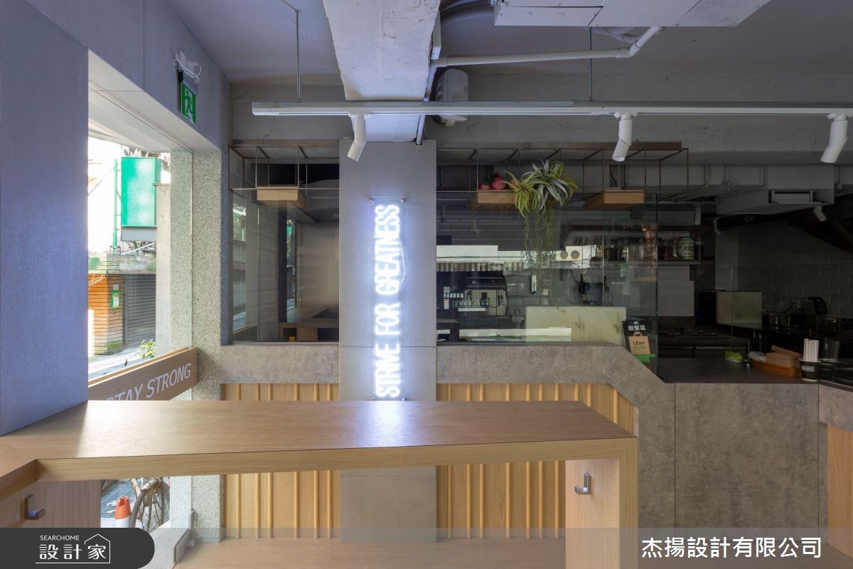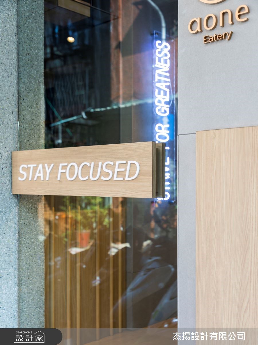 因為是以健康概念為主題的餐廳,首先設計師利用自然元素敘述 Aone.Eatery 的品牌理念。外觀以斜切的木質做大跨度的延伸結合綠意植栽牆,一展清新的無壓感受,而植栽牆上的英文立體字母,則增添空間的趣味活潑,並以灰綠色抿石子為基底,沉穩的烘托空間架構。甫入室內,水泥色的牆面、潔白的外露管線、暈黃的燈光,譜出溫婉的工業曲調,而木紋地板的鋪設,更是展現一室的溫暖與商品強調的自然元素,因為是以外帶、外送為主的店家,只設計吧台讓人能站著用餐,動線更為快速、順暢。