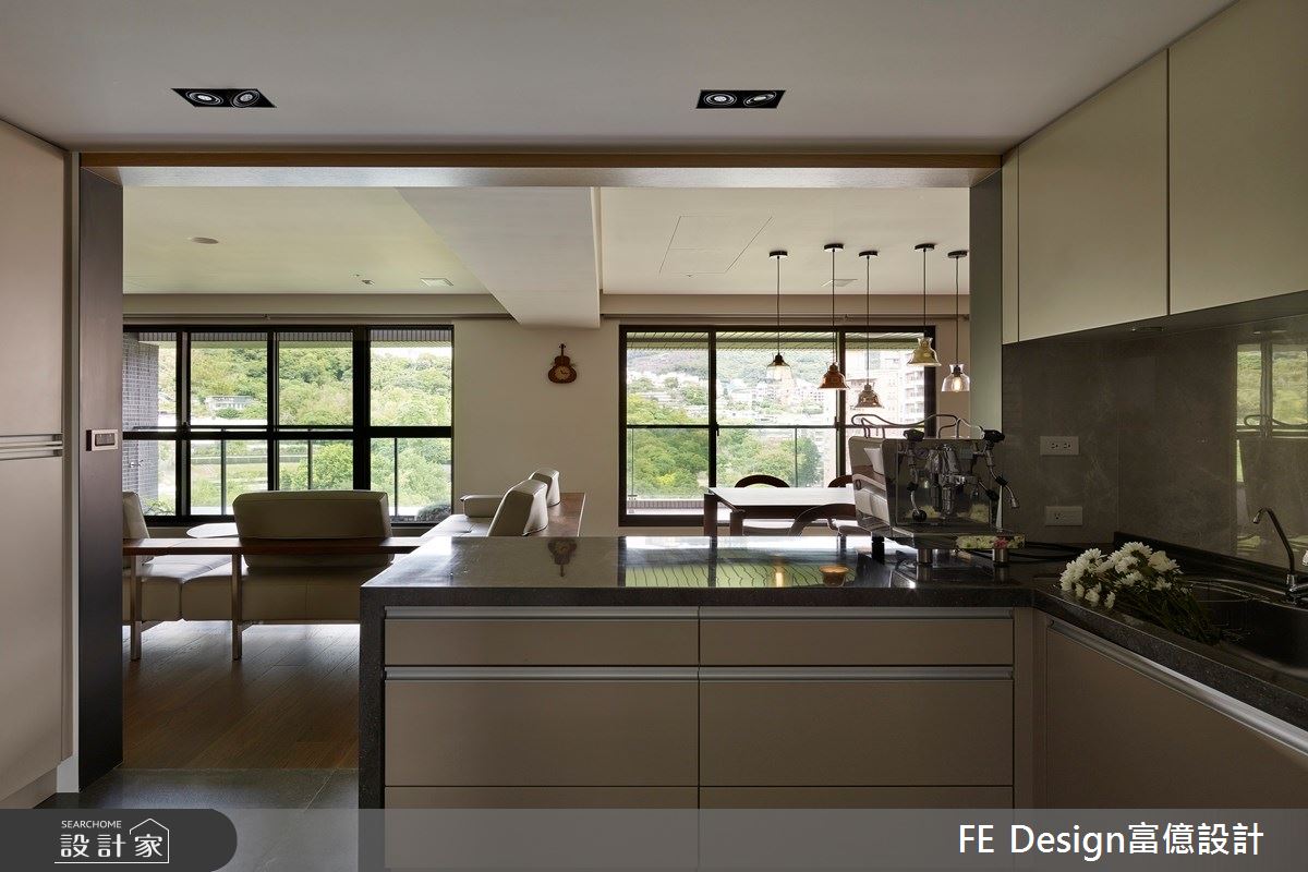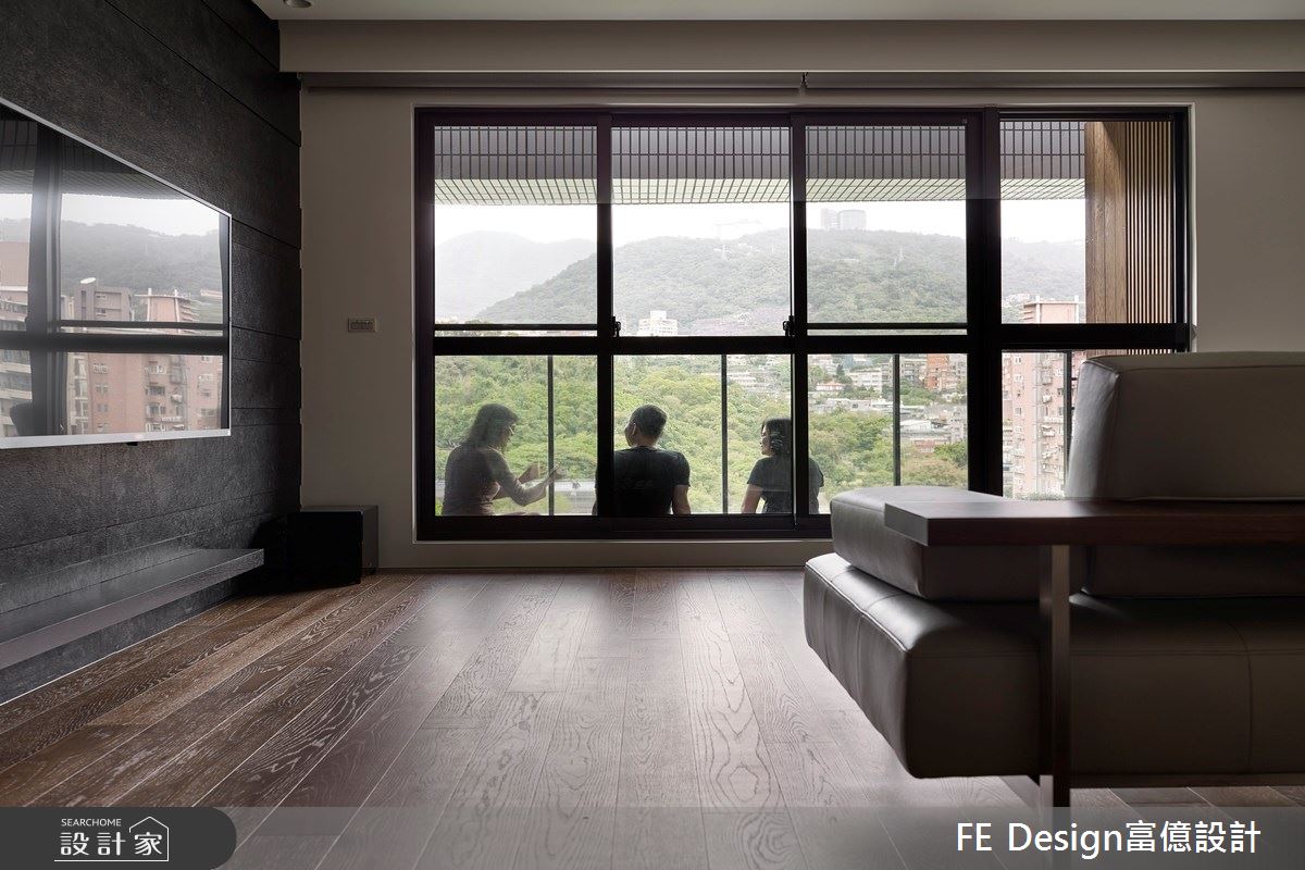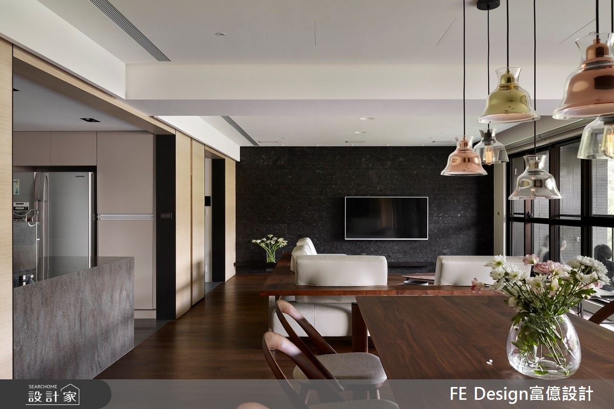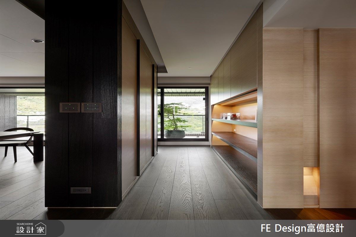 充分運用三大面開窗的優點,達到借景入室的作用,使住宅、綠意形成共鳴,無論身處家中任何一角落,都可享受到不同的景觀視角,並藉著降板陽台踏階串聯室外陽台場域,讓人猶如隨時置身自然;室內刻意呈現素雅簡約的配色,讓主題焦點回歸窗外自然景致,客廳電視牆則鋪敘深色花崗岩,創造沉穩內斂的表情,與之相對的餐廳主牆,則給予深鋼刷梧桐木皮處理,形成前後的趣味呼應;格局動線方面,則捨棄不必要的隔間,利用拉門模糊空間與空間的界線,使區塊之間既串聯又保有獨立;且利用牆面打造雙排的多元櫃體,雙重達到收納與展示需求,結合木紋鋪陳櫃面,讓空間盈滿宜人的人文溫度!