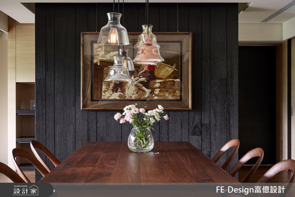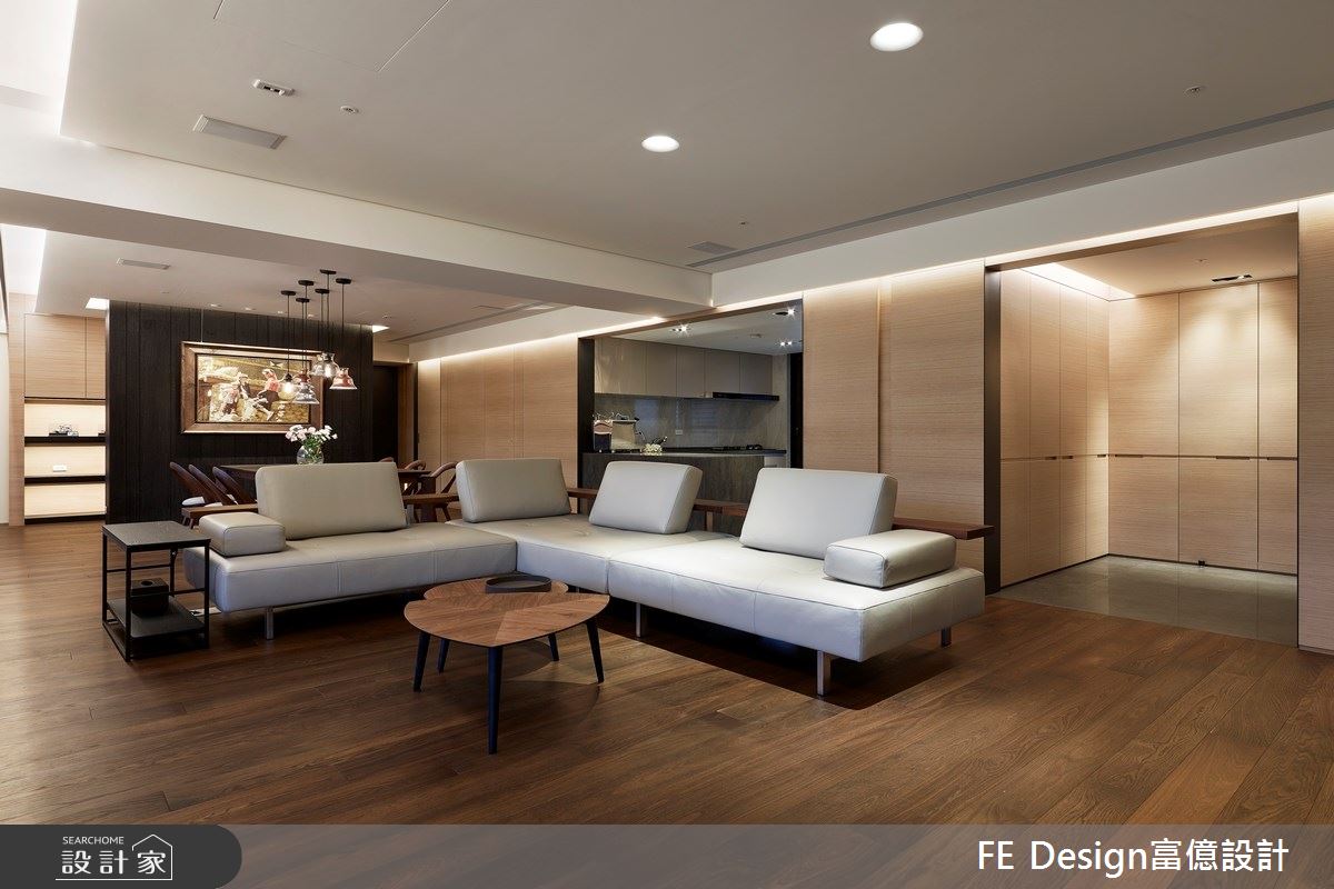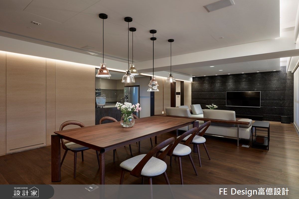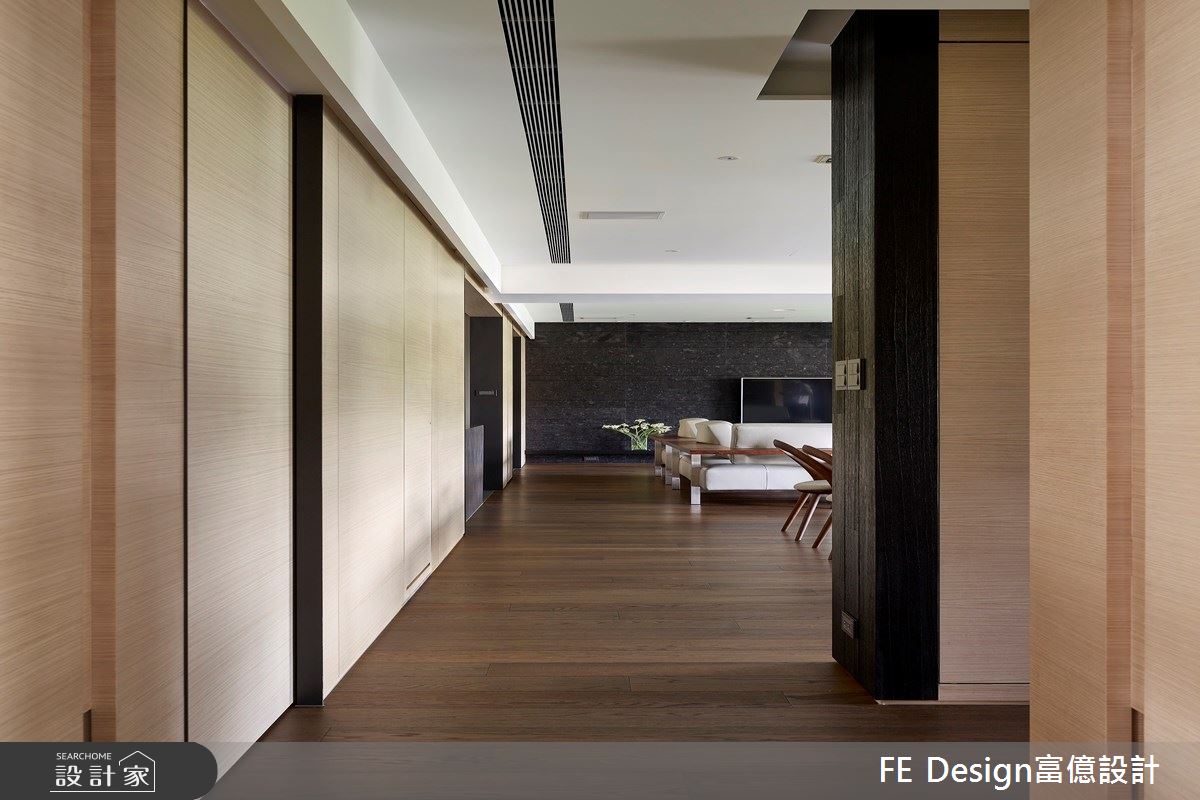 充分運用三大面開窗的優點,達到借景入室的作用,使住宅、綠意形成共鳴,無論身處家中任何一角落,都可享受到不同的景觀視角,並藉著降板陽台踏階串聯室外陽台場域,讓人猶如隨時置身自然;室內刻意呈現素雅簡約的配色,讓主題焦點回歸窗外自然景致,客廳電視牆則鋪敘深色花崗岩,創造沉穩內斂的表情,與之相對的餐廳主牆,則給予深鋼刷梧桐木皮處理,形成前後的趣味呼應;格局動線方面,則捨棄不必要的隔間,利用拉門模糊空間與空間的界線,使區塊之間既串聯又保有獨立;且利用牆面打造雙排的多元櫃體,雙重達到收納與展示需求,結合木紋鋪陳櫃面,讓空間盈滿宜人的人文溫度!