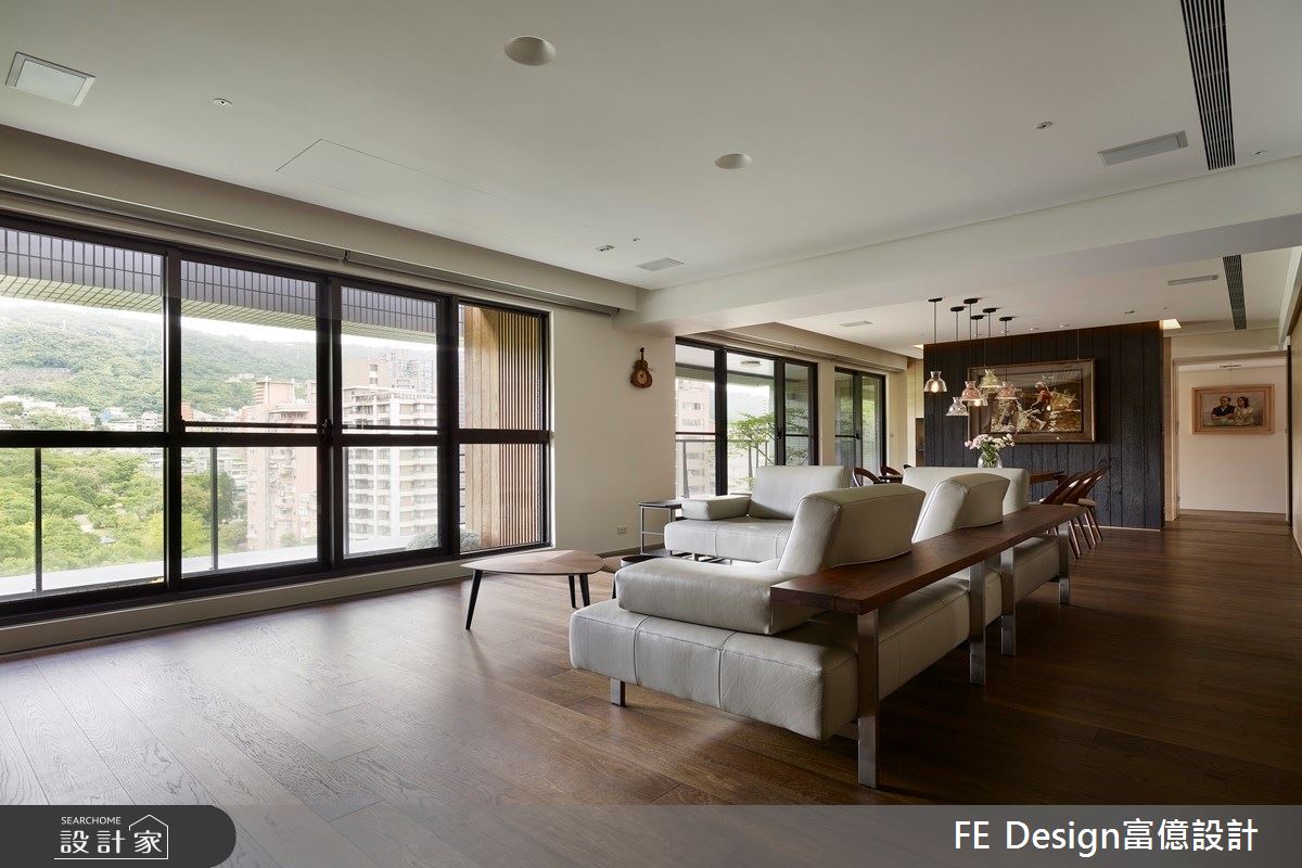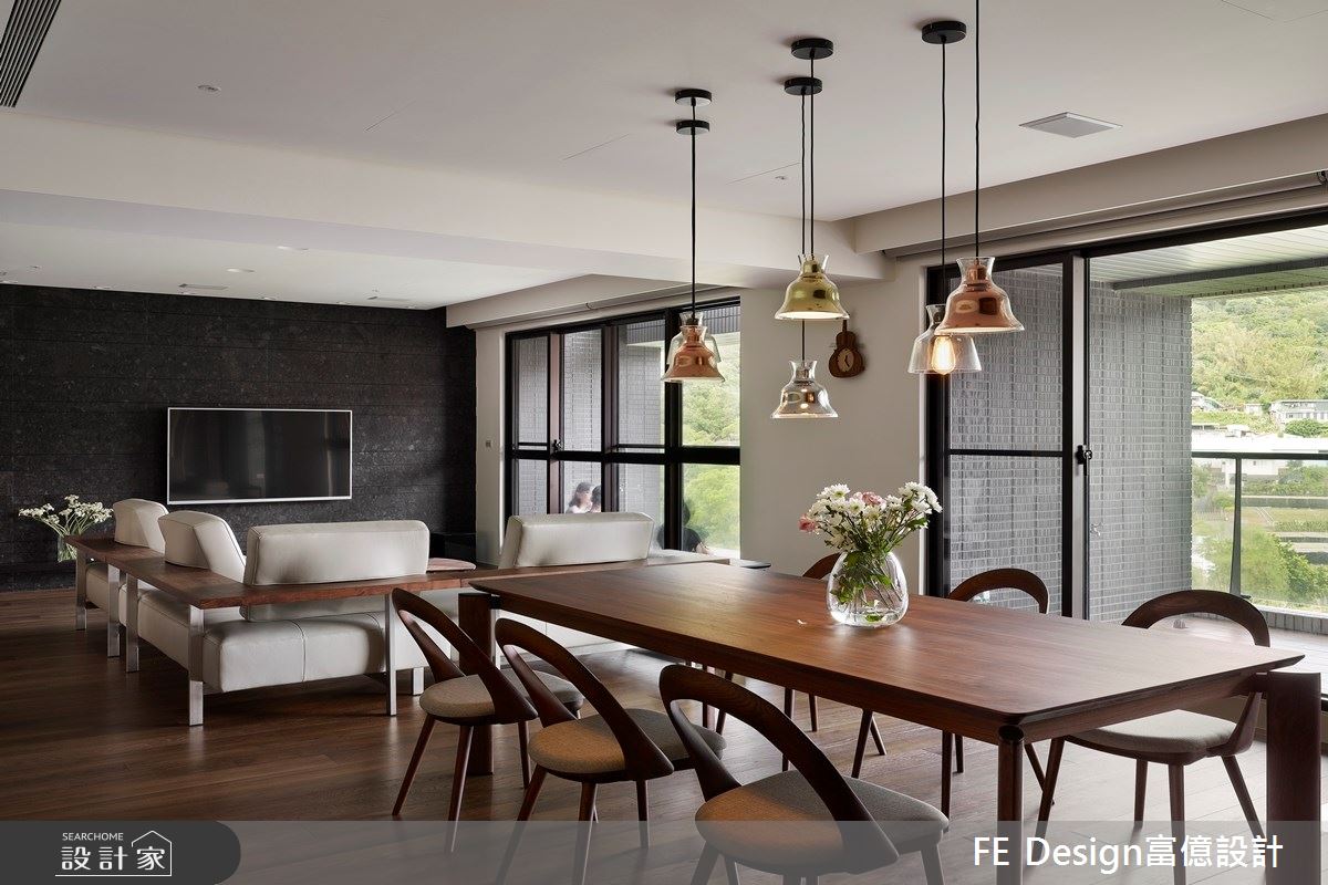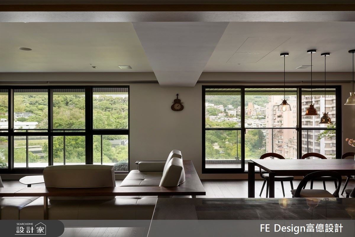 56 坪現代風居家,設計師藉由客廳、餐廳的大面開窗,將山林綠地的景觀優勢延攬入室,把內外界線縮到最小,讓大自然生息充分引進室內,搭配敞朗格局、流暢動線、自然建材等演繹,拉近居住者、空間、環境之間的連結,快跟著小編一起來看看吧!