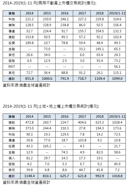 中美貿易戰開打以來已經快2年的時間,整個全球產業生態加速重整中,造成不少高端科技大廠回台布局,也導致大型建設公司及金融、壽險業資金轉回台灣投資。信義全球資產統計2019年1~11月上市櫃公司不動產交易,觀察到買方以建設業占最大宗,其中又以興富發位居第一;此外,海外投資風險提高,金融、壽險業重回台灣不動產,值得關注的是,金融業從2013年起鮮少購置商辦,到2018年迅速攀升,顯現出市場投資景氣持續成長。