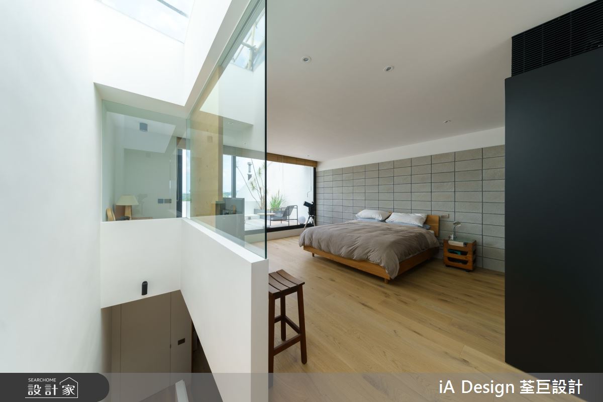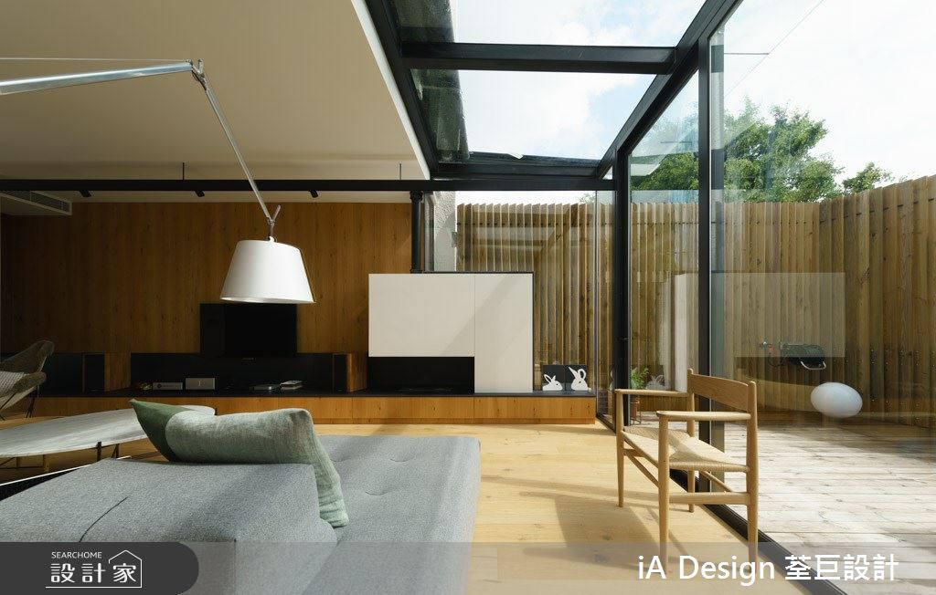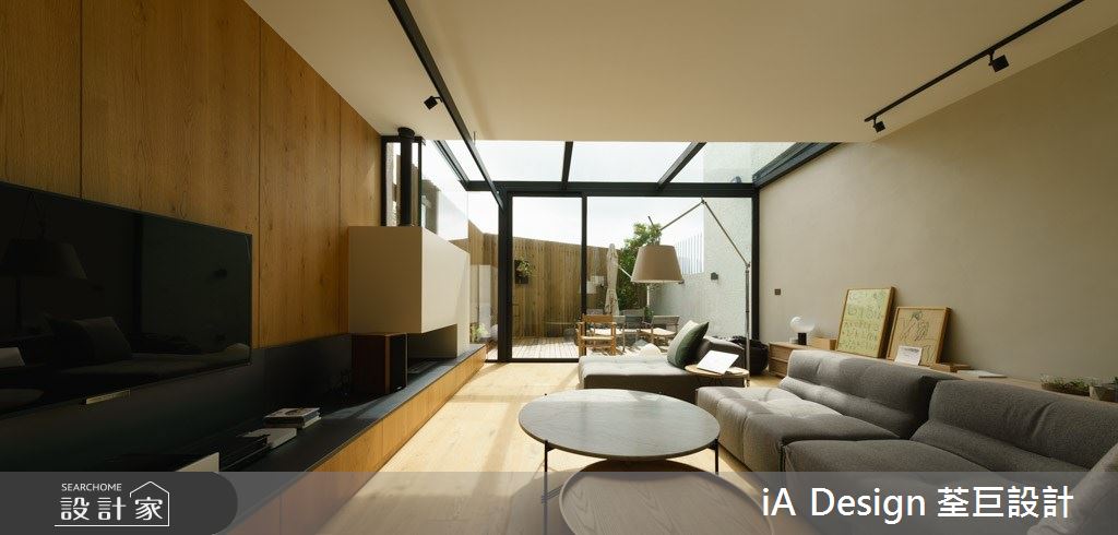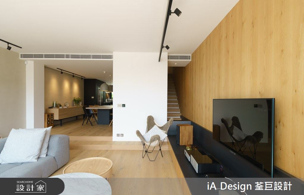 進門左側藉由整排的木質拉門,隱藏廁所與鞋櫃入口,營造居家簡約舒適的氛圍。餐廚區以開放式設計,將原本封閉的廚房打開,增加動線流暢性,運用中島取代隔間牆的概念,界定玄關與廚房空間;並利用開放式廚房串聯餐桌,提升整體餐廚區的機能,更加賦予空間開闊感。客廳電視牆打造一面完整的機櫃,將電器配備統一收整,右側搭配造型白色櫃體,增加空間層次感。露台運用大量木皮營造自然溫潤的調性,並以玻璃材質設計,讓陽光自然流淌於室,創造出玻璃屋的度假感。二樓閱聽室利用架高做為空間界限,同時藉由架高的開放空間,放大樓梯轉折區塊的空間感;小孩房於靠窗面規劃長型書桌,靠牆面設計臥榻床,賦予空間機能也保持簡單清爽的氛圍。三樓主臥延續屋主喜歡的空間自由度,以不過度裝飾為原則,將樓梯隔間牆改以玻璃質地,營造明亮舒適的睡眠場域。