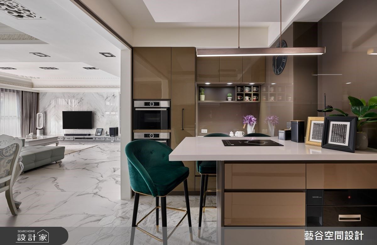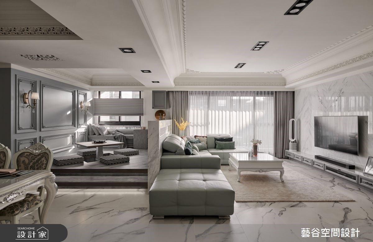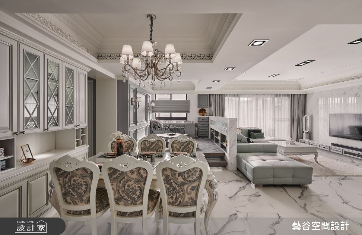 客廳電視牆以魚肚白大理石鋪陳,賦予低調卻不失質感的氛圍,地坪則使用銀狐大理石,巧妙提升空間的精緻度;天花板以層層堆疊的雕刻語彙,挹注濃厚的古典底蘊,利用線板妝點吊隱式冷氣的出風口,使整體視野達到一致性的美感。和室壁板加入雕花語彙,同時藉由壁燈點綴空間,為空間增添古典味道,並以鏤空隔屏取代傳統封閉式拉門,創造視野的開闊性及空間的互動性。廚房跳脫古典韻味,以現代精緻的質地規劃,地坪透過六角磁磚鋪陳與餐區的交界,豐富整體層次感。主臥運用色彩及壁紙、壁燈交織出大器感受,並將床頭背板尺度拉大,賦與屋主氣勢凜然的睡眠場域。