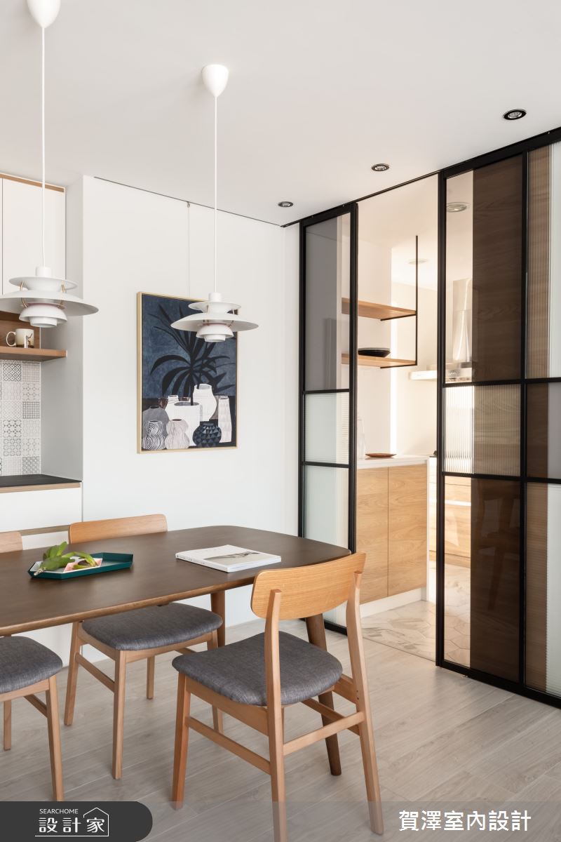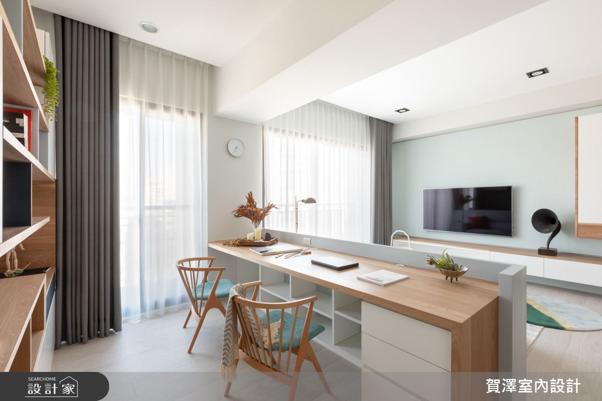 客廳沙發背牆以矮牆結合兼書桌檯面,成為書房與客廳之間的界定,並在書房配置一面書牆,利用層板、塊狀櫃體搭配,讓書櫃顯得具有層次,兼具足夠的實用收納機能,而客廳電視牆旁則安排不落地鞋櫃,使牆面顯得開闊留白,木紋與白的交錯,則增添視覺上的活潑感;餐廳領域,採餐櫃滿足收納功能,鋪貼花磚增添立面設計感,上方櫃體可用來擺屋主收藏的杯盤器皿,廚房區域規劃鋁框門阻擋油煙,分別使用清玻與長虹玻璃拼接,保有通透與隱蔽感,並在廚房內開一道灰玻室內窗,串聯與公領域的關係,拓寬走道的視野;主臥內,挹注舒適清爽的清爽留白,於床頭揮灑粉嫩綠色,木櫃設計則適時避免了壓樑問題,且兼顧儲放油畫板功能,美觀實用兼具!