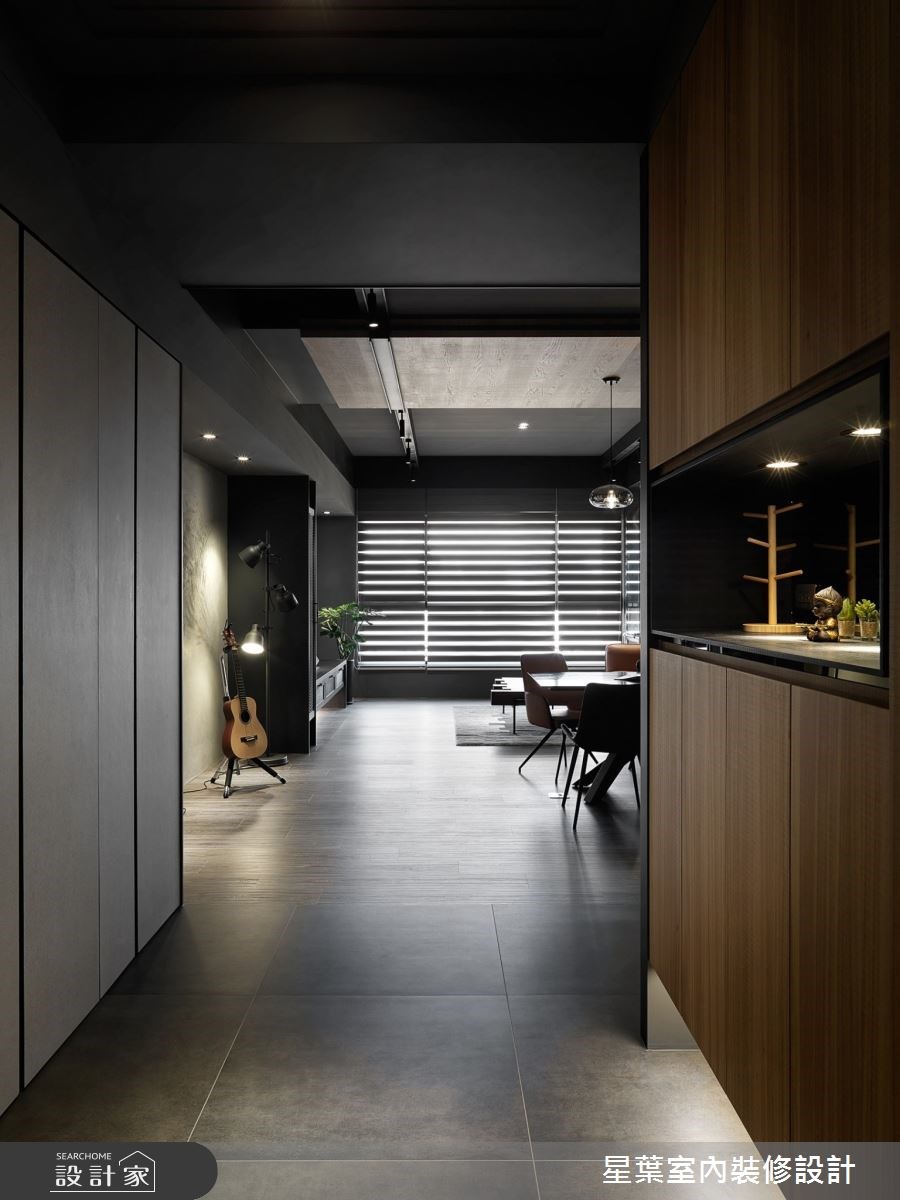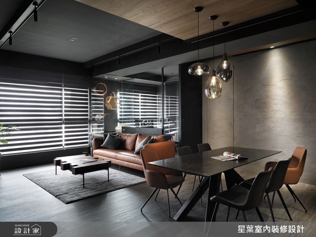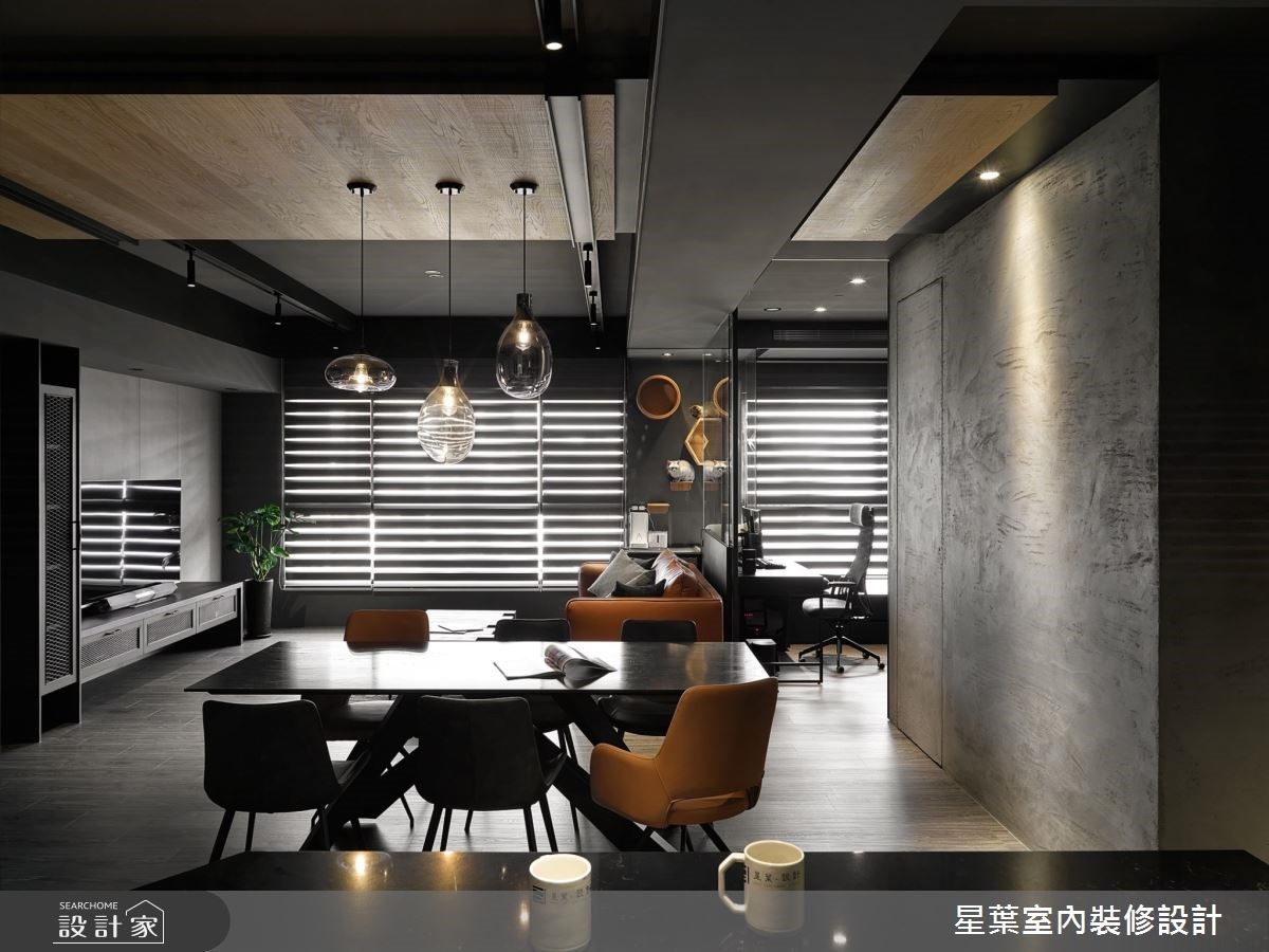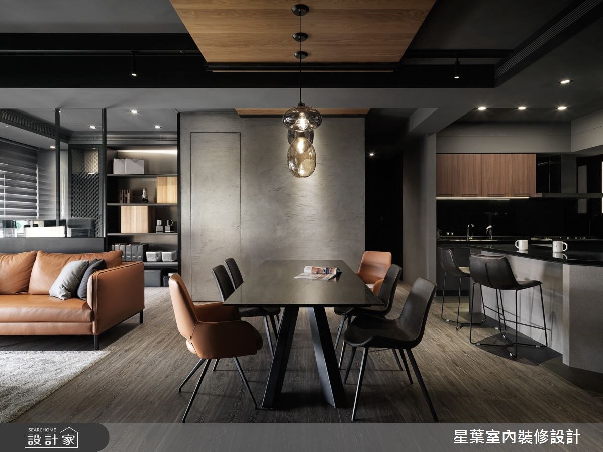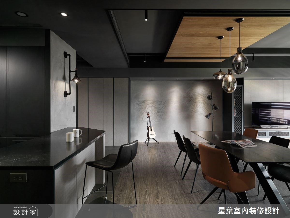 開放式廚房自玄關櫃開始設置中島吧檯,斜角延伸的檯面設計讓屋主可以邀請親友一同開派對;一旁餐廳的木作天花板,跟塗黑樑柱形成垂直角度,減輕了格局的破碎感,又能調和空間的溫度,打造高雅細緻的工業風情。書房藉由通透的玻璃隔間、鐵件鐵網的裝飾,將原先封閉的空間納入公領域,創造開闊的家居視野。