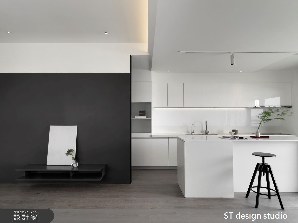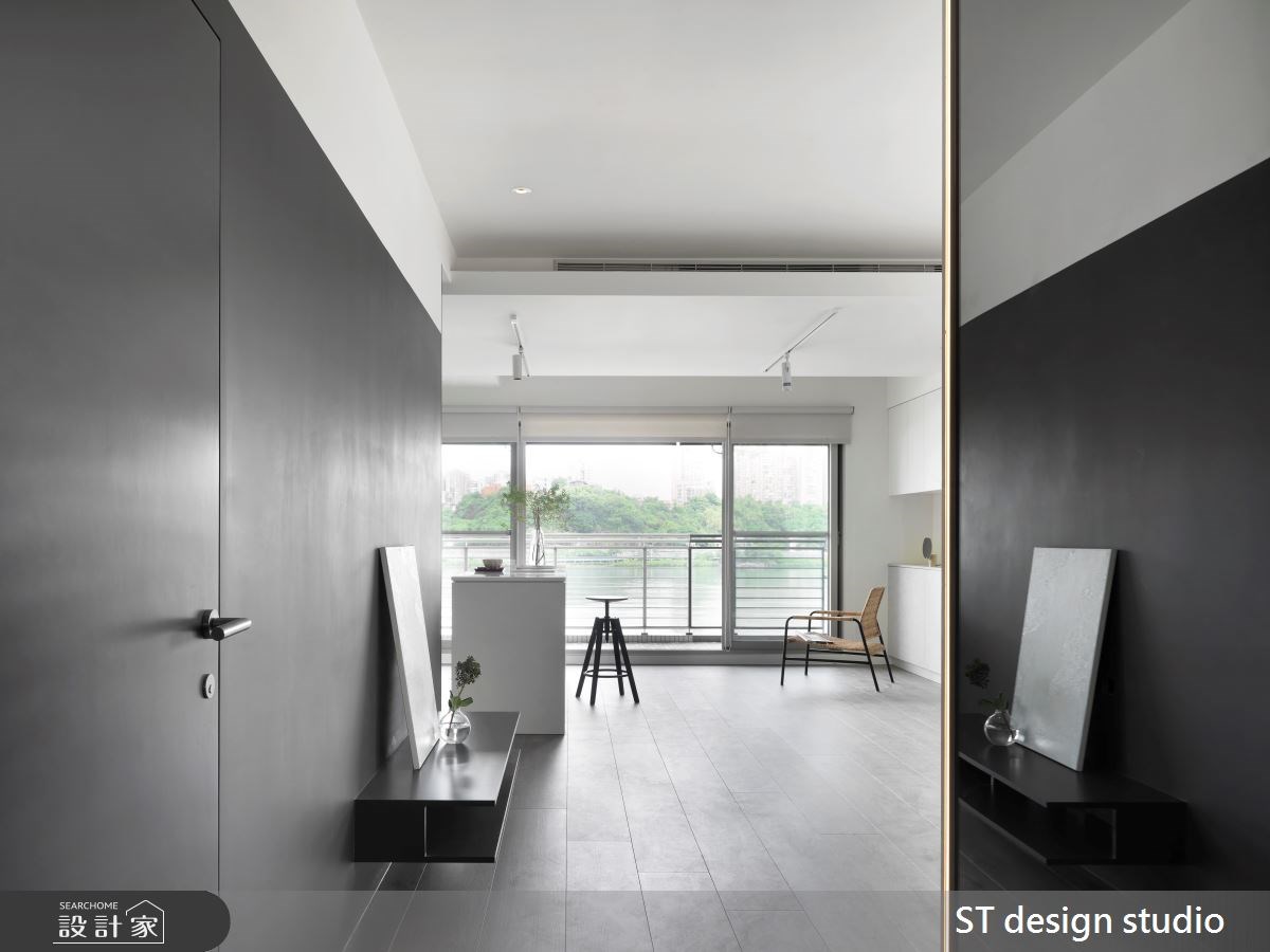 開放的客、餐廳廊道,透過黑色刷漆串連電視牆、隱藏的門片,襯托整室的白淨,無限延展空間深度,替室內注入沉穩而不沉重的視覺。鄰近大落地窗旁的純白開放式中島廚房,將室外完美的綠意河景收攬入室,開闊了身心與視野,滿足了以景為主的生活心願。從大門處望向客廳區,感受由暗轉明的光影變化,展現極簡用色,卻擁有豐富層次的設計美學。