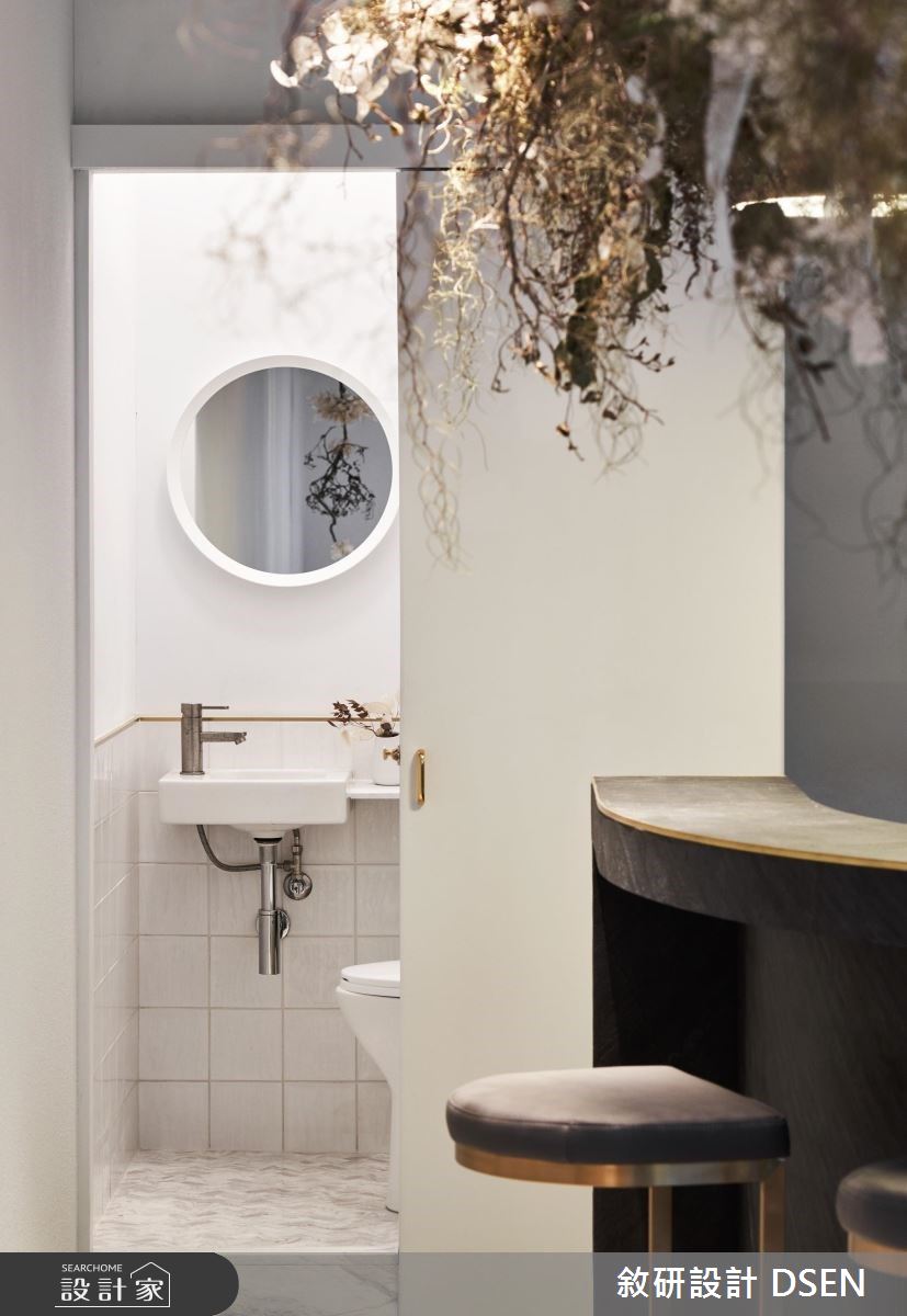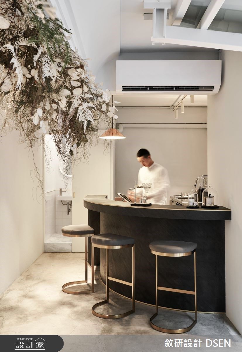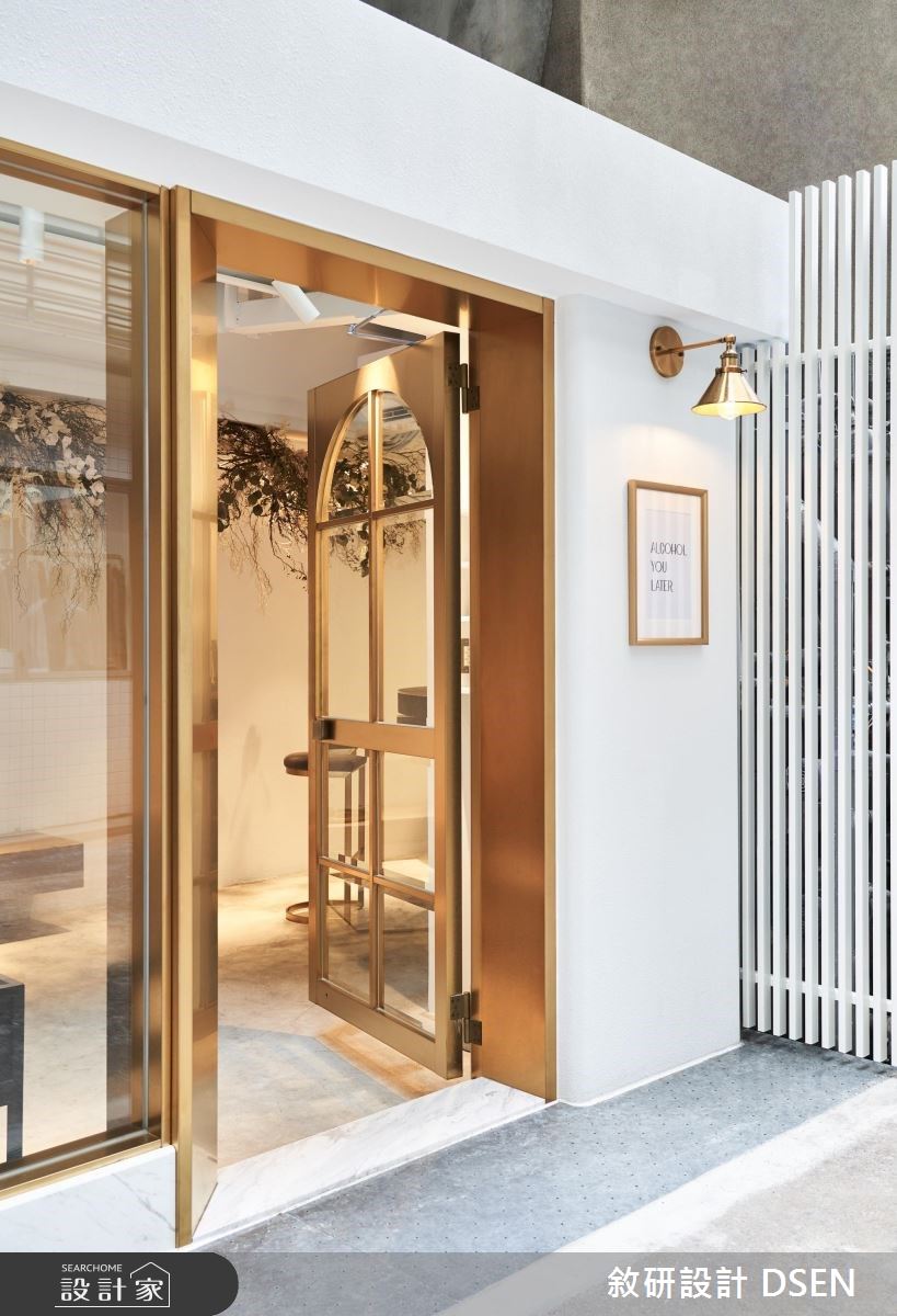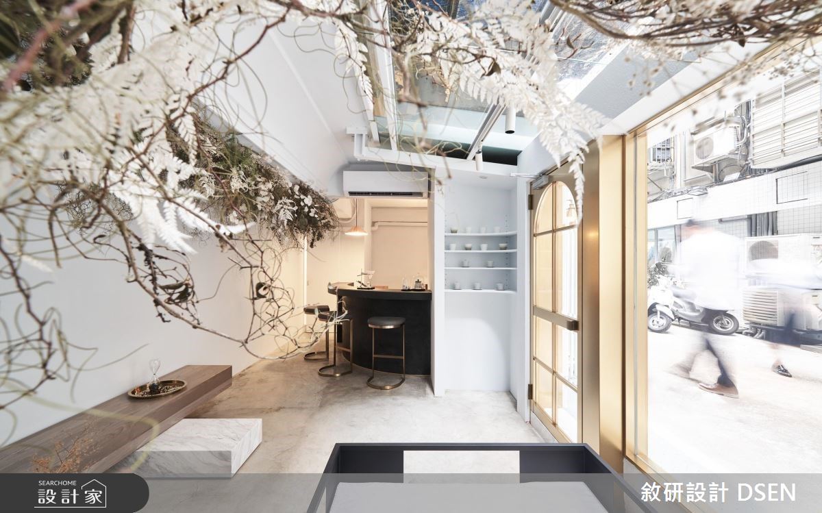 空間改變原始格局,換上能夠接收採光的玻璃屋頂,配合大面積的玻璃門面,讓原本小小的空間瞬間明亮放大,幻化為都會中的景致瞭望台;空間內外則貫穿弧形元素,減少剛硬的稜角,釋放了狹長空間的封閉感,增添柔軟溫馨的氣息;並以純白作為空間基底,點綴著細緻的金色元素,帶出優雅大方的質感,同時讓單椅呈現隨興擺設的情境,搭配天然的乾燥花材使用,以點綴吊掛方式裝飾並襯托整個店內,帶出隨興美好的生活韻味!