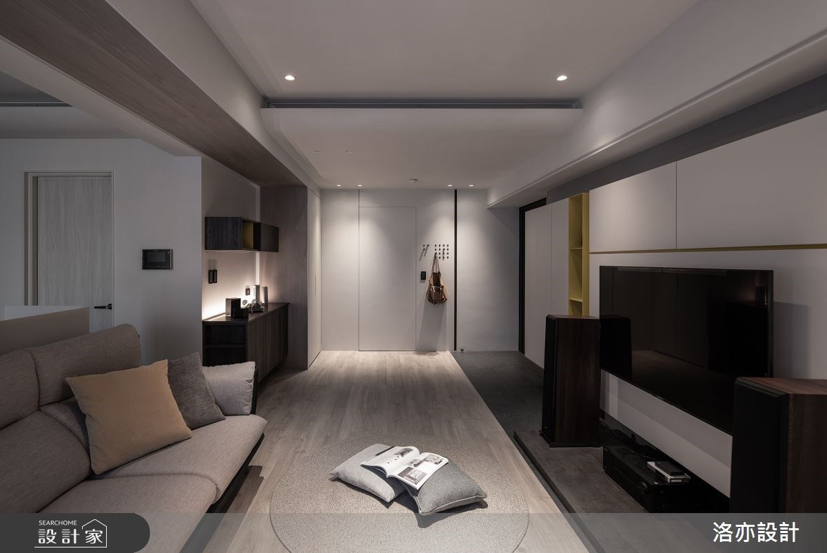 屋主希望一進門的玄關落塵區與室內有所分隔,設計師便運用電視牆櫃體延伸設計阻擋部分入門視線,並透過異材質拼搭法,創造各領域之間的分界;櫃體上不忘增添輕巧但別具個性的掛鉤配件,完整玄關機能。坪數不大的空間,先將沙發背牆後的書房領域打開,化身寬敞舒適的開放公領域,視覺得以無限延伸;沙發上方壓樑缺陷則利用木紋材質修飾,不僅成為開放空間裡劃分機能的隱形界線,並一路延伸串連儲藏櫃,將樑柱厚度及高櫃壓迫疑慮同時化解。