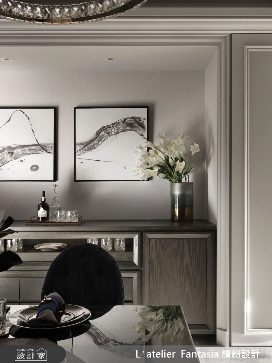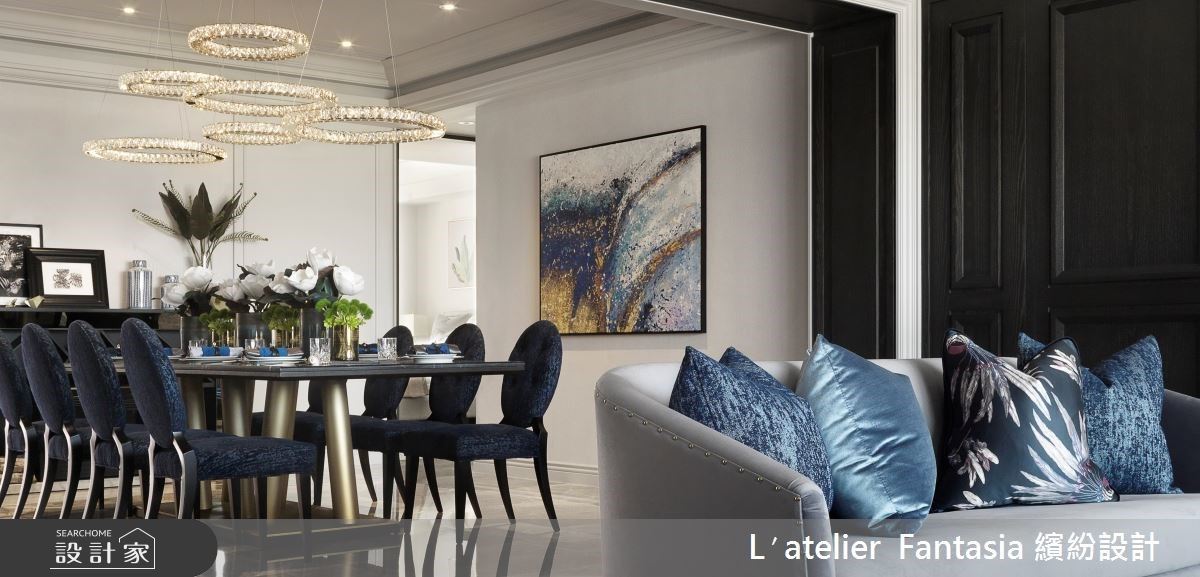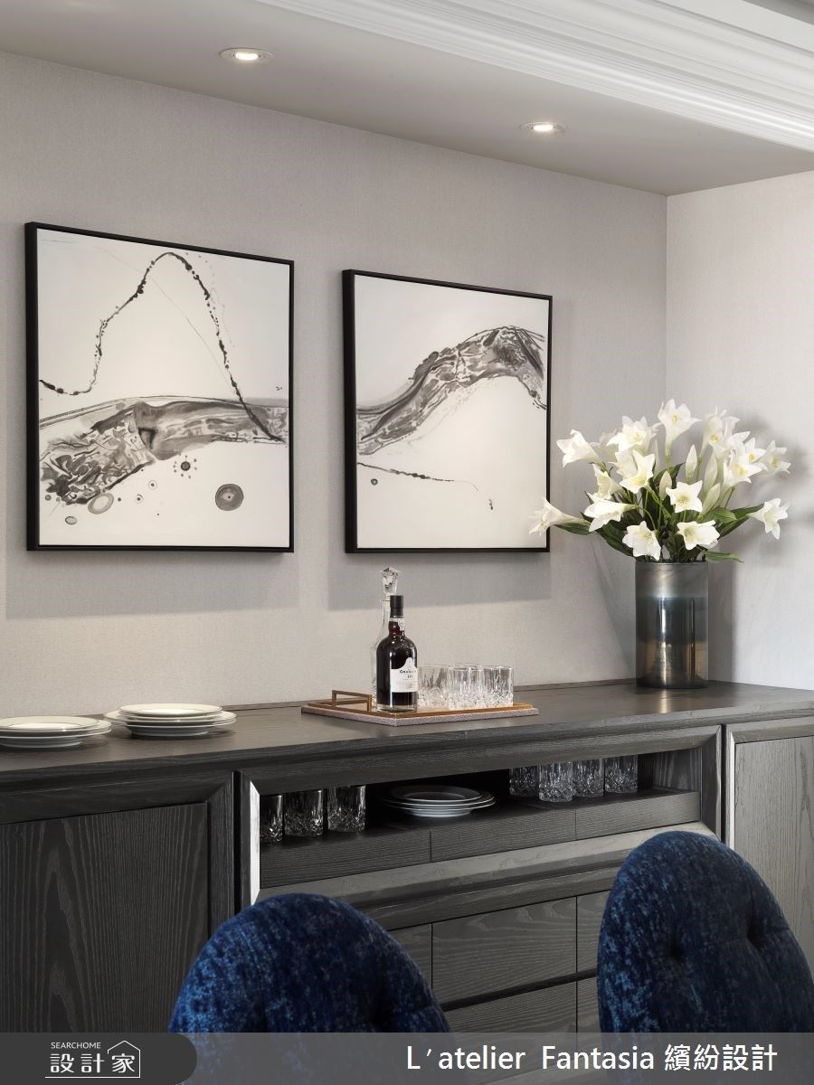 設計師認為,好的空間講究的是故事和內涵,因此選擇用軟裝和藝術品表達主人家的真摯情感。沙發、腳凳、抱枕和餐椅等,以皇室藍為主體色,並搭配灰色簾幔調和,堆疊出顏色的層次感。客廳牆面則掛上裱框精緻的攝影作品,將當代、摩登的私享精緻生活表露無遺。