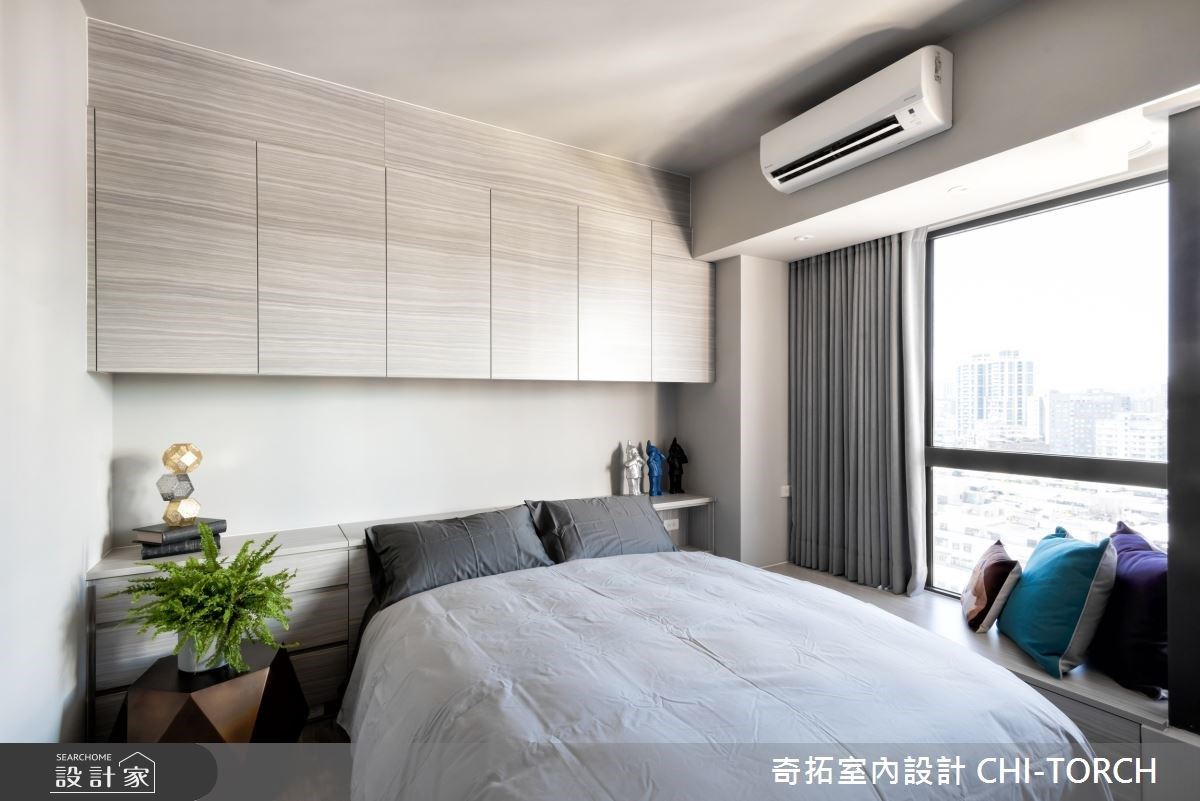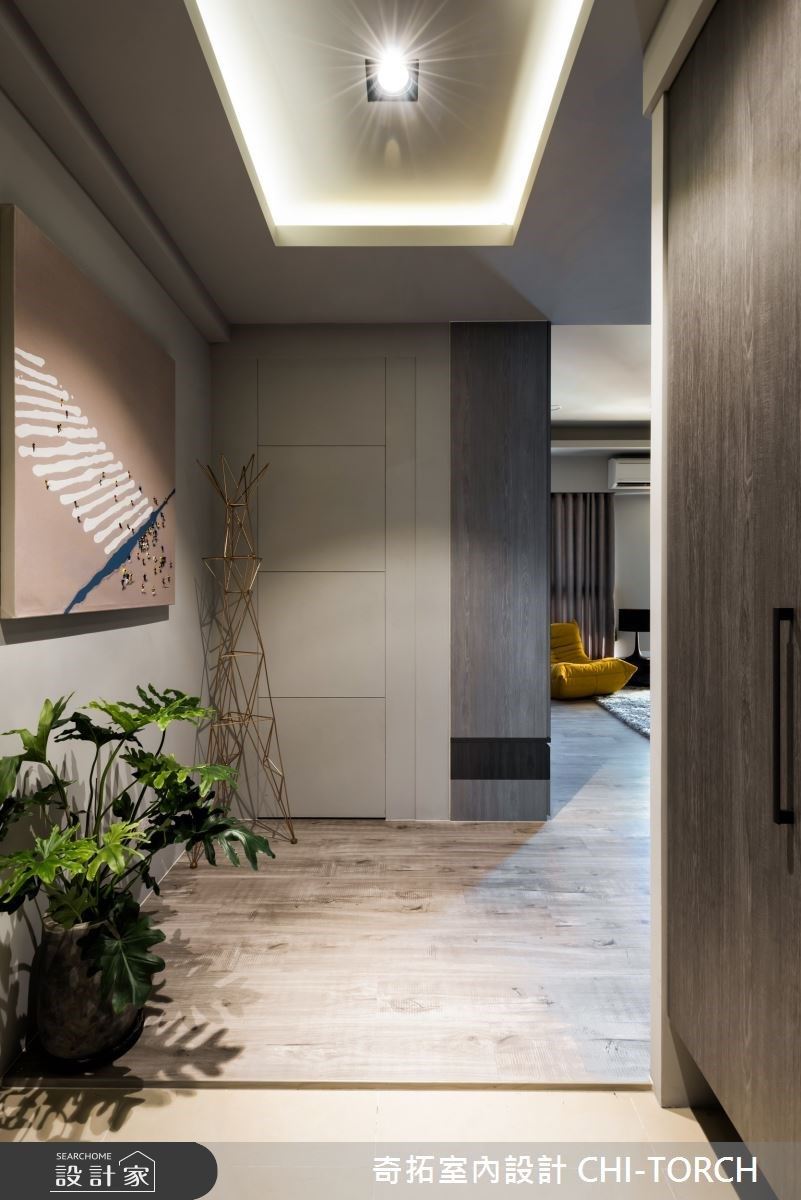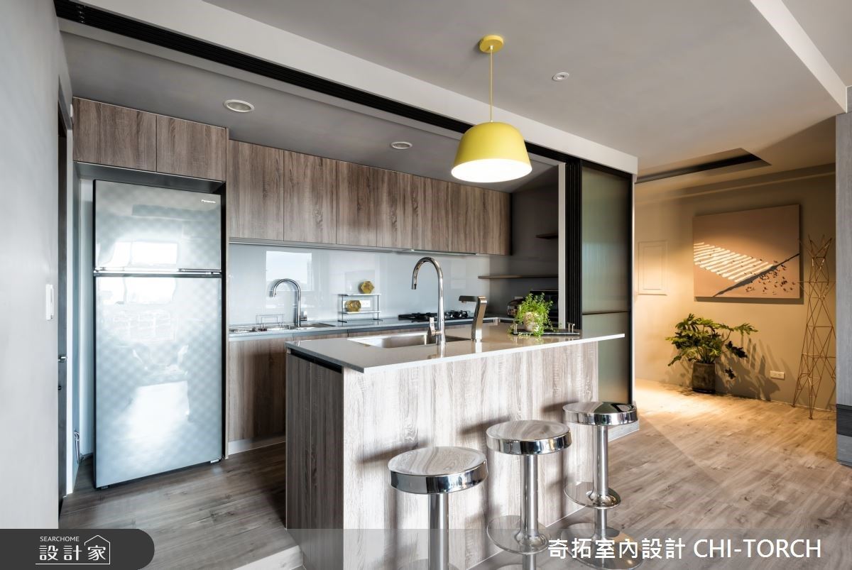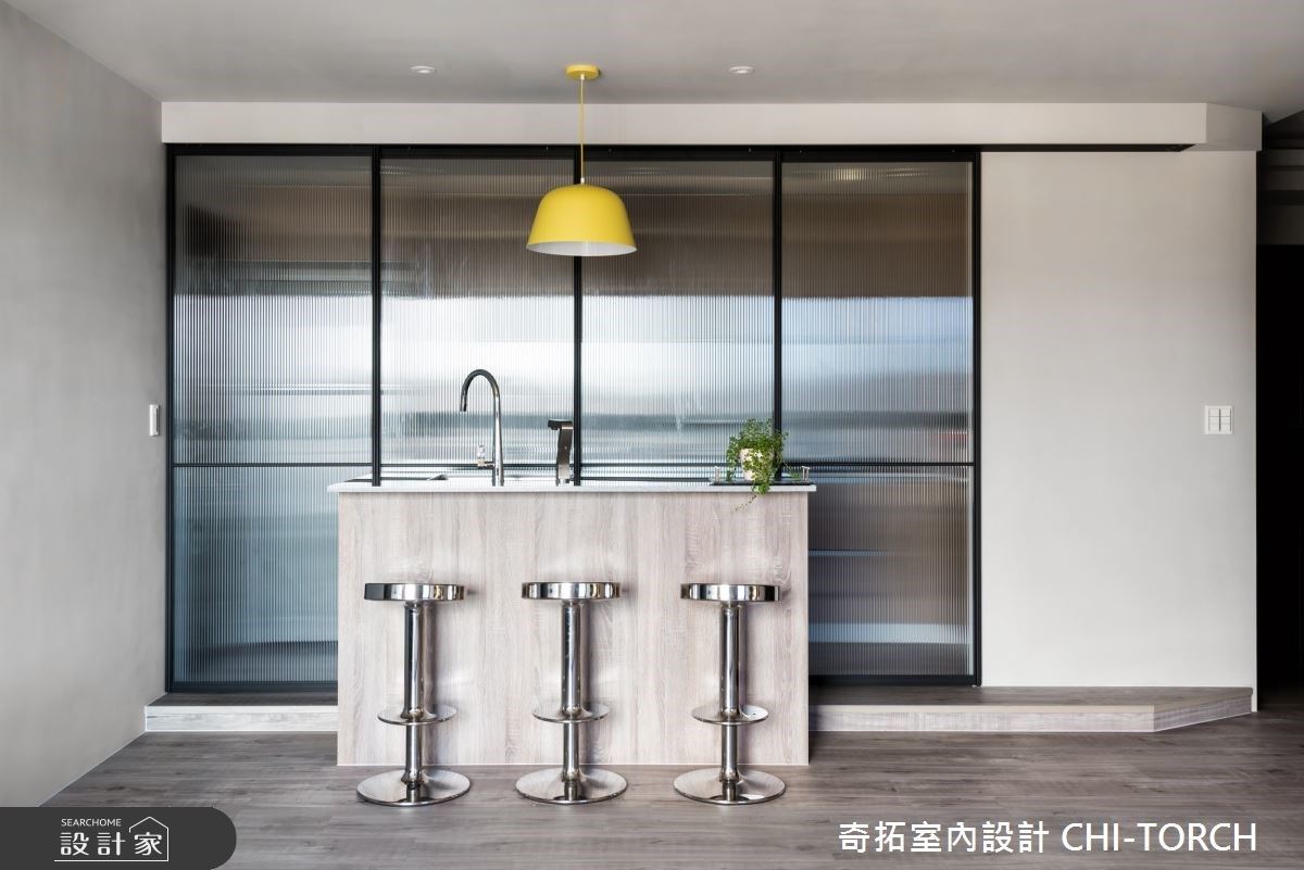 銜接原有格局規劃,透過除去廚房隔間,展現通透寬敞的公領域,突顯原有的採光和景觀優勢,並展現天然建材的既有質感。運用俐落的幾何線條,輔以石紋肌理創造電視主牆,並將上樓暗門深藏其中,藉以延伸主牆面積,奠定大方氣度。餐廚區域,可彈性運用玻璃拉門,避免油煙四溢的窘境,更以輕巧簡便的中島吧台增添備餐空間。主臥房內,系統收納櫃延壁收攏,滿足屋主的收納需求,並以植栽對應外在窗景,讓極佳視野成為最佳居家端景。